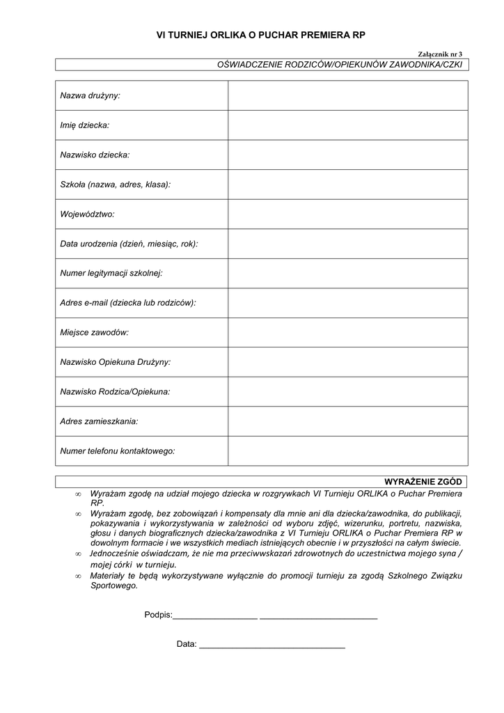 VI TURNIEJ ORLIKA O PUCHAR PREMIERA RP Załącznik nr 3 OŚWIADCZENIE RODZICÓW/OPIEKUNÓW ZAWODNIKA/CZKI Nazwa drużyny: Imię dziecka: Nazwisko dziecka: Szkoła (nazwa, adres, klasa): Województwo: Data urodzenia (dzień, miesiąc, rok): Numer legitymacji szkolnej: Adres e-mail (dziecka lub rodziców): Miejsce zawodów: Nazwisko Opiekuna Drużyny: Nazwisko Rodzica/Opiekuna: Adres zamieszkania: Numer telefonu kontaktowego: • • WYRAŻENIE ZGÓD Wyrażam zgodę na udział mojego dziecka w rozgrywkach VI Turnieju ORLIKA o Puchar Premiera RP. Wyrażam zgodę, bez zobowiązań i kompensaty dla mnie ani dla dziecka/zawodnika, do publikacji, pokazywania i wykorzystywania w zależności od wyboru zdjęć, wizerunku, portretu, nazwiska, głosu i danych biograficznych dziecka/zawodnika z VI Turnieju ORLIKA o Puchar Premiera RP w dowolnym formacie i we wszystkich mediach istniejących obecnie i w przyszłości na całym świecie. • Jednocześnie oświadczam, że nie ma przeciwwskazań zdrowotnych do uczestnictwa mojego syna / mojej córki w turnieju. • Materiały te będą wykorzystywane wyłącznie do promocji turnieju za zgodą Szkolnego Związku Sportowego. Podpis:__________________ _________________________ Data: _______________________________