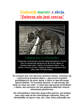 Nadszedł marzec z akcją "Zwierzę nie jest rzeczą" Na zewnątrz już czuć pierwsze powiewy wiosny. Cieszymy się z pierwszych promieni słońca, z pierwszych kwiatów przebijających się przez śnieg, a także ze specyficznego śpiewu ptaków. To wszystko sprawia, że odczuwamy jak świat na nowo się rodzi - w takie dni najczęściej wychodzimy z domu, aby nacieszyć się tym pięknem:oddychać nowym, wiosennym powietrzem. Ale schroniskowe zwierzęta mogą tylko patrzeć, jak kolejna pora roku mija im bez ukochanego człowieka, który nie wychodziłby na spacer sam, ale z nim, który pokazałby mu piękno świata poza schroniskiem. Nie możemy adoptować ich wszystkich, ale możemy sprawić, by miało to minimum. Własny, ciepły kąt i pełną miskę. Razem zbierzmy dla nich najpotrzebniejsze rzeczy. W marcu zbieramy: - środki opatrunkowe, lecznicze (bandaże, rękawiczki jednorazowe, Octenisept) - szampony (przeznaczone jedynie dla psów, NIE mogą być takie dla ludzi) Oto niektóre ze zwierząt, które czekają na twoją pomoc i adopcję: Kuba 879/14- Jamnik, starszy. Całe życie spędził u boku kochającej właścicielki. Osoba ta jest już osobą starszą i niestety z przyczyn zdrowotnych często musi przebywać w szpitalu, a psiną nie ma kto się zająć. Kuba jest typowym jamnikiem w charakterkiem, jak mu się coś nie podoba to szybko to okazuje;) Dogaduje się z psiakami, odnajdzie się nawet w niewielkim mieszkaniu. Wspaniale byłoby gdyby trafił w ręce osoby która miała styczność z rasą. Przy odpowiednim prowadzeniu będzie najlepszym przyjacielem! Daj mu dom! Jago 871/14- Psiak w typie jagdteriera, typowy przedstawiciel rasy. Bardzo przyjacielski w stosunku do ludzi. Dogaduje się z suczkami. Mimo że nie miał łatwego życia, nie złamało to jego pewności siebie. Bardzo energiczny. Szukamy osoby która miała styczność z tą rasą i będzie wiedział jak poprowadzić naszego Jago! Ogryzek 282/14- Mniejszy psiak, starszy. Nie da się pojąć jak po latach wierności i oddania można przyjaciela tak po prostu zostawić na pastwę losu. Ogryzek dał się poznać jako psiak bardzo przyjacielski w stosunku do ludzi i innych zwierząt. Bardzo grzeczny i opanowany. Ładnie chodzi na smyczy, odnajdzie się nawet w niewielkim mieszkaniu. Byłby wspaniałym kompanem osoby starszej . Daj mu szansę! Janek – 868/11 – trafił do schroniska w wyniku interwencji naszego kierowcy. Psiak nie bardzo wiedział co się dzieje, na początku nieśmiały, wycofany. Po kilku dniach jego zachowanie zmieniło się o 180 stopni. Rozszczekany, wesoły, czekający na każdy, nawet najmniejszy kontakt z człowiekiem. Chętny do spacerów, idealnie sprawdzi się w mieszkaniu jak i w domu z ogrodem. Brock-788/09 Średni, pełen energii psiak. Chętny do zabaw oraz długich spacerów. Uwielbia kontakt z człowiekiem. Mógłby zamieszkać w mieszkaniu jak i w domu z ogrodem. Myślimy, że również sprawdził by się w domu ze starszymi dziećmi. Dogaduje się z psiakami. Mimo, że człowiek go zawiódł dalej chce ufać i kochać. Chętny do nauki, otwarty na nowe doświadczenia. Przyjdź zabierz go na spacer, daj mu szanse bo może musiał tyle czekać właśnie na Ciebie? Murzyn-105/05 Większy, w typie owczarka. Psiak w schronisku od 2005 roku! To naprawdę smutne że tak kochane zwierzę tyle lat czeka na dom… Kiedyś głośnym szczekaniem próbował zwrócić na siebie uwagę. Niestety jeszcze nikt nie dosłyszał jego błagalnego krzyku, przez co Murzyn stracił nadzieje. Zrezygnowany już dziadziuś pogodził się z niesprawiedliwym dla niego losem. Już tyle lat spędził za kratami schroniskowego boksu a przecież do pełni szczęścia potrzebuje tak nie wieleKochać i być kochanym… Perkins – 137/11 – Psiak o dużych gabarytach. Po wielu latach wierności został porzucony jak niepotrzebna zabawka przez swoich właścicieli. Po psiaku widać, że czuje się samotny i wyczekuje na swojego nowego właściciela z niecierpliwością. Jest pięknym psem o oryginalnej urodzie. Jest energiczny. Bardzo dobrze sprawdziłby by się w domu z ogrodem. Niestety nie akceptuje innych zwierząt.Jeśli szukasz dużego psiaka z którym mógłbyś pokonywać długie trasy jak i do którego puchatej sierści mógłbyś się przytulić to będzie idealny wybór. Lugosi – 148/11 – z wyglądu przypomina owczarka. Nie wiemy dużo o jego przeszłości poza tym, że został porzucony przez swoich właścicieli. Dla swojego pana będzie najwierniejszym przyjacielem. Jeśli masz podwórko, to Lugosi będzie świetnym stróżem. Swoim szczekaniem spłoszy każdego nieproszonego gościa. Saban – 443/11 – Mały psiak, jego życie to pasmo bólu. Mimo młodego wieku zaznał już wiele złego. Mówimy, że Saban trafił do nas „wyrwany z piekła”. W tej chwili cieszy się do każdej napotkanej osoby. Niestety przeszłość jak zwykle zostawiła na nim ślad.. Psiak może zamieszkać tylko na podwórzu, przez to, że kiedyś był katowany ma uszkodzone nerwy i nie czuje gdy „oddaje swoje potrzeby”. Absolutnie nie przeszkadza mu to w codziennym funkcjonowaniu. Idealnie sprawdzi się jako taki mały ogrodowy szczekacz. Uwielbia również spacery, czułości z człowiekiem. Nie ma problemu w kontakcie z innymi psiakami Wisznu -27/11 – Większy psiak. Do schroniska trafił jako niespełna roczny, pełen energii, werwy i chęci do życia psiak.W boksie czuje się bezpiecznie i z obcą osobą nie ma zamiaru go opuszczać. Kilka wolontariuszy i pracowników podjęło się pracy nad zrezygnowanym psiakiem. Z zaufaną grupką osób wychodzi na spacery i nastawia im grzbiet do pieszczot. Co jest dowodem na to że jeśli ktoś zyska jego zaufanie i podejmie wyzwanie jakim jest zdobycie serca Wisznu biedak zmienia się i staje się wpatrzonym w przewodnika, chętnym do nauki młodzieńcem. Tylko czy znajdzie się ktoś kto zdecyduje się dać mu dom? Proszę Państwa, oto Popiel. Nie mylić