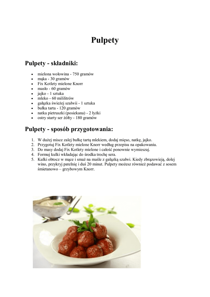 Pulpety Pulpety - składniki: mielona wołowina - 750 gramów mąka - 30 gramów Fix Kotlety mielone Knorr masło - 60 gramów jajko - 1 sztuka mleko - 60 mililitrów gałązka świeżej szałwii - 1 sztuka bułka tarta - 120 gramów natka pietruszki (posiekana) - 2 łyżki ostry starty ser żółty - 180 gramów Pulpety - sposób przygotowania: 1. 2. 3. 4. 5. W dużej misce zalej bułkę tartą mlekiem, dodaj mięso, natkę, jajko. Przygotuj Fix Kotlety mielone Knorr według przepisu na opakowaniu. Do masy dodaj Fix Kotlety mielone i całość ponownie wymieszaj. Formuj kulki wkładając do środka trochę sera. Kulki obtocz w mące i smaż na maśle z gałązką szałwi. Kiedy zbrązowieją, dolej wino, przykryj patelnię i duś 20 minut. Pulpety możesz również podawać z sosem śmietanowo – grzybowym Knorr.