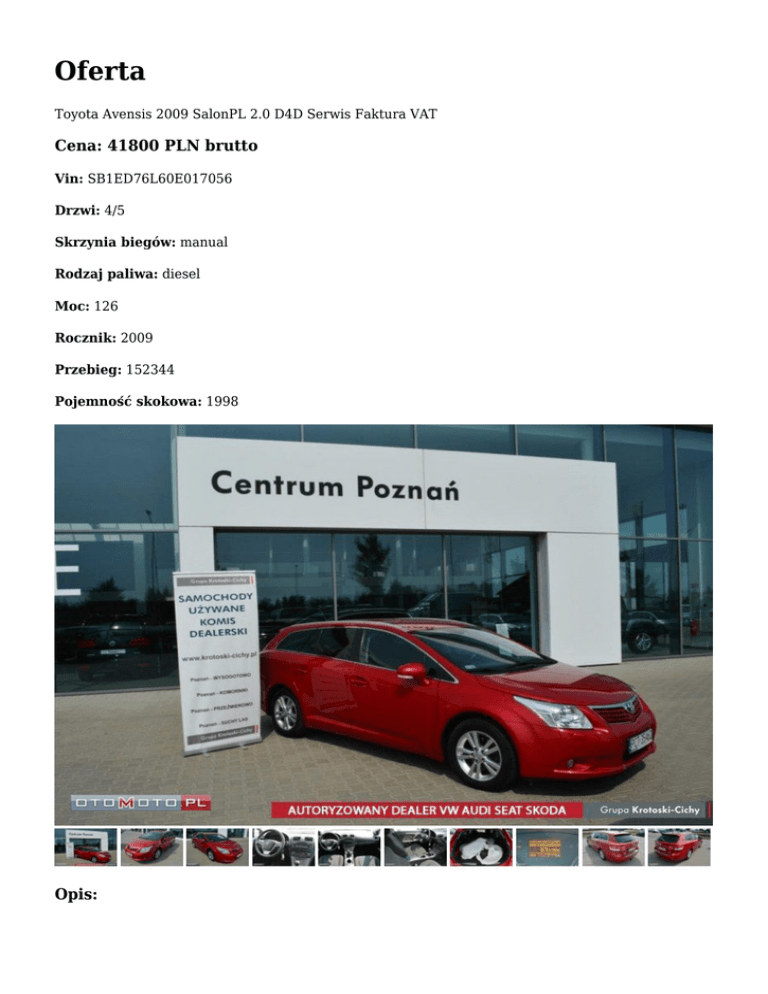 Oferta Toyota Avensis 2009 SalonPL 2.0 D4D Serwis Faktura VAT Cena: 41800 PLN brutto Vin: SB1ED76L60E017056 Drzwi: 4/5 Skrzynia biegów: manual Rodzaj paliwa: diesel Moc: 126 Rocznik: 2009 Przebieg: 152344 Pojemność skokowa: 1998 Opis: Auto-Handel-Centrum Krotoski-Cichy Autoryzowany Dealer VW Audi Seat Skoda Opel Gwarancja pochodzenia MOŻLIWOŚĆ SPRAWDZENIA POJAZDU W AUTORYZOWANEJ STACJI OBSŁUGI -----------------------------------------------------------------------------------------------------------------------------------------------------Uwaga: Miejsce ekspozycji pojazdu - Grupa Krotoski - Cichy Salon Volkswagen ul. Głogowska/Kowalewicka 3C, 60-002 Poznań - Komorniki Osoba kontaktowa tel: Romualda Kroll 601 751 199 Maciej Oblizajek 697 700 055 Maciej Śmigielski 781 440 157 tel.: +48 61 832 72 06 MOŻLIWA JAZDA PRÓBNA PO WCZEŚNIEJSZYM UZGODNIENIU TERMINU -----------------------------------------------------------------------------------------------------------------------------------------------------Kupiona w Polskim salonie TOYOTA Data 1 rejestracji 07-07-2009 r. Serwisowany w ASO TOYOTA - książki serwisowe Wyposażenie: ABS Immobiliser Poduszki powietrzne Wspomaganie układu kierowniczego Elektryczne lusterka Elektryczne szyby przednie oraz tylne Centralny zamek Klimatyzacja automatyczna dwustrefowa Kierownica wielofunkcyjna Komputer pokładowy Radio CD/MP3 Światła przeciwmgłowe Lakier metalizowany Czujniki parkowania i inne Podana cena brutto - wystawiamy fakturę VAT 23% -----------------------------------------------------------------------------------------------------------------------------------------------------Oferujemy kompleksową obsługę sprzedaży ratalnej na bardzo dogodnych warunkach - w celu bliższego zapoznania się z aktualną ofertą finansowania prosimy o kontakt : Maciej Oblizajek 697-700-055. Oferujemy ubezpieczenia samochodowe z wiodących na rynku ubezpieczalni - możliwość zakupu pakietu ubezpieczeniowego na miejscu. Oferujemy możliwość jazdy próbnej przed zakupem oraz usługę inspekcji pojazdu w autoryzowanym serwisie Skoda. Przyjmujemy również w rozliczeniu każdy pojazd. -----------------------------------------------------------------------------------------------------------------------------------------------------Godziny otwarcia: pon - pt 9.00 - 19.00 sob 9.00 - 14.00 Uwaga: Miejsce ekspozycji pojazdu - Grupa Krotoski - Cichy Salon Volkswagen ul. Głogowska/Kowalewicka 3C, 60-002 Poznań - Komorniki Osoba kontaktowa tel: Romualda Kroll 601 751 199 Maciej Oblizajek 697 700 055 Maciej Śmigielski 781 440 157 tel.: +48 61 832 72 06 -----------------------------------------------------------------------------------------------------------------------------------------------------Ogłoszenie ma charakter informacyjny i stanowi zaproszenie do zawarcia umowy (art. 71 Kodeksu cywilnego); nie stanowi natomiast oferty handlowej w rozumieniu art. 66 § 1 Kodeksu cywilnego. W celu sprawdzenia zgodności oferty oraz uzyskania wszelkich informacji prosimy kontaktować się z handlowcem d.s. samochodów używanych Auto możesz zobaczyć: ul. Głogowska/Kowalewicka 3 60-002 Poznań tel: 61 832 72 05 Maciej Śmigielski GSM: 781-440-157 e-mail: [email protected] Romualda Kroll GSM: 601-751-199 e-mail: [email protected] Maciej Oblizajek GSM: 697-700-055 e-mail: [email protected]