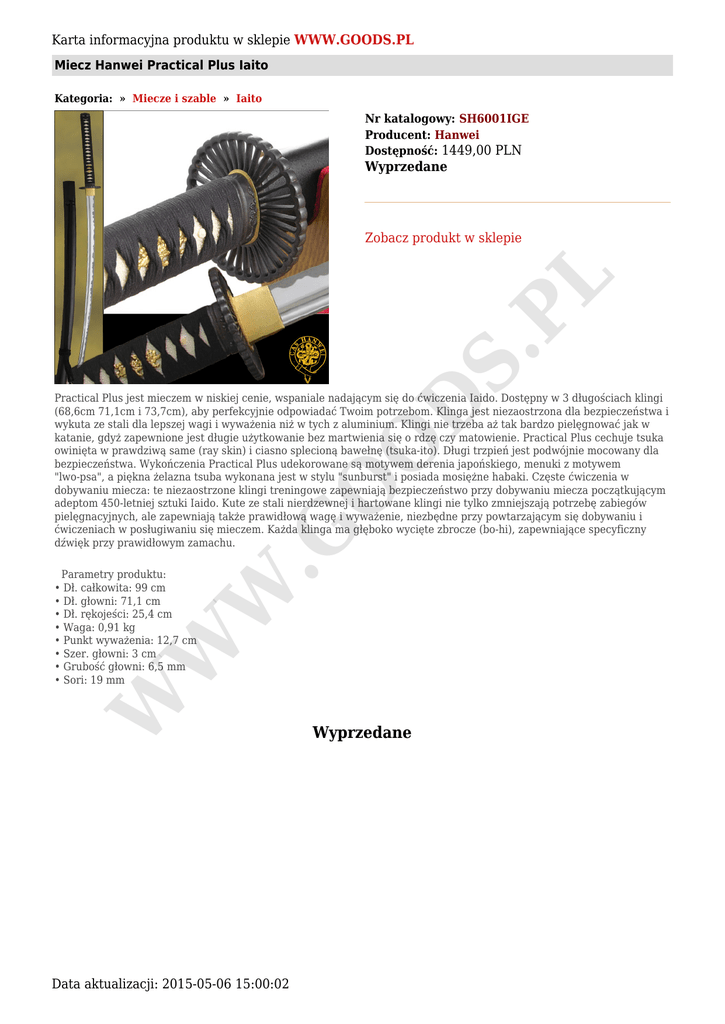 Karta informacyjna produktu w sklepie WWW.GOODS.PL Miecz Hanwei Practical Plus Iaito Kategoria: » Miecze i szable » Iaito Nr katalogowy: SH6001IGE Producent: Hanwei Dostępność: 1449,00 PLN Wyprzedane S. PL Zobacz produkt w sklepie W .G O O D Practical Plus jest mieczem w niskiej cenie, wspaniale nadającym się do ćwiczenia Iaido. Dostępny w 3 długościach klingi (68,6cm 71,1cm i 73,7cm), aby perfekcyjnie odpowiadać Twoim potrzebom. Klinga jest niezaostrzona dla bezpieczeństwa i wykuta ze stali dla lepszej wagi i wyważenia niż w tych z aluminium. Klingi nie trzeba aż tak bardzo pielęgnować jak w katanie, gdyż zapewnione jest długie użytkowanie bez martwienia się o rdzę czy matowienie. Practical Plus cechuje tsuka owinięta w prawdziwą same (ray skin) i ciasno splecioną bawełnę (tsuka-ito). Długi trzpień jest podwójnie mocowany dla bezpieczeństwa. Wykończenia Practical Plus udekorowane są motywem derenia japońskiego, menuki z motywem "lwo-psa", a piękna żelazna tsuba wykonana jest w stylu "sunburst" i posiada mosiężne habaki. Częste ćwiczenia w dobywaniu miecza: te niezaostrzone klingi treningowe zapewniają bezpieczeństwo przy dobywaniu miecza początkującym adeptom 450-letniej sztuki Iaido. Kute ze stali nierdzewnej i hartowane klingi nie tylko zmniejszają potrzebę zabiegów pielęgnacyjnych, ale zapewniają także prawidłową wagę i wyważenie, niezbędne przy powtarzającym się dobywaniu i ćwiczeniach w posługiwaniu się mieczem. Każda klinga ma głęboko wycięte zbrocze (bo-hi), zapewniające specyficzny dźwięk przy prawidłowym zamachu. W W Parametry produktu: • Dł. całkowita: 99 cm • Dł. głowni: 71,1 cm • Dł. rękojeści: 25,4 cm • Waga: 0,91 kg • Punkt wyważenia: 12,7 cm • Szer. głowni: 3 cm • Grubość głowni: 6,5 mm • Sori: 19 mm Data aktualizacji: 2015-05-06 15:00:02 Wyprzedane