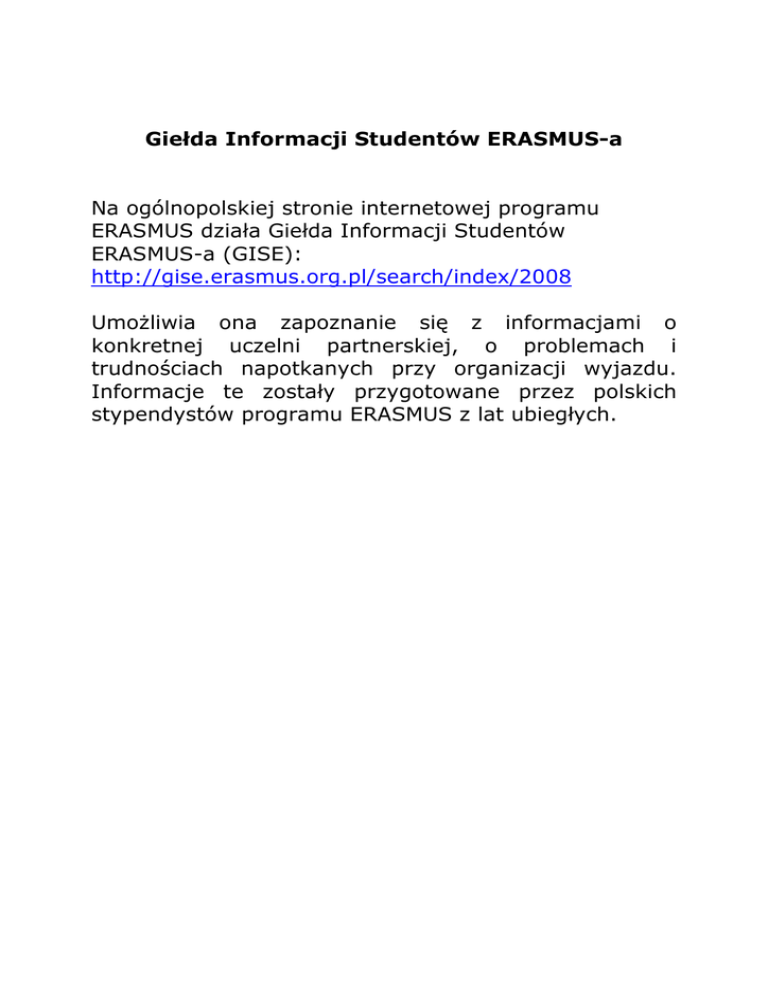 Giełda Informacji Studentów ERASMUS-a Na ogólnopolskiej stronie internetowej programu ERASMUS działa Giełda Informacji Studentów ERASMUS-a (GISE): http://gise.erasmus.org.pl/search/index/2008 Umożliwia ona zapoznanie się z informacjami o konkretnej uczelni partnerskiej, o problemach i trudnościach napotkanych przy organizacji wyjazdu. Informacje te zostały przygotowane przez polskich stypendystów programu ERASMUS z lat ubiegłych.