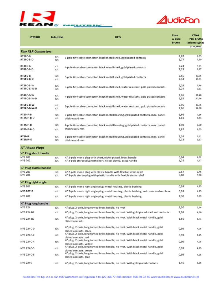 ¼" plug, 2-pole, long turned brass handle, no rivet. With gold plated shell and contacts