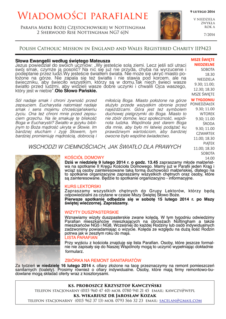 Wiadomości parafialne Parafia Matki Bożej Częstochowskiej w Nottingham 2 Sherwood Rise Nottingham NG7 6JN ! 9 lutego 2014 V NIEDZIELA ZWYKŁA ROK A ! ! 7/2014 Polish Catholic Mission in England and Wales Registered Charity 1119423 & IĘTE MSZE SW NIEDZIELNE SOBOTA 18.30 NIEDZIELA 9.30; 11.00; 12.30; 18.30 MSZE ŚWIĘTE W TYGODNIU Sól nadaje smak i chroni żywność przed miłością Boga. Miasto położone na górze PONIEDZIAŁEK zepsuciem. Eucharystia natomiast nadaje służyło przede wszystkim obronie przed 9.30; 11.00 smak i sens mojemu chrześcijańskiemu najeźdźcami. Góra jest też symbolem WTOREK życiu. Ona też chroni mnie przed zepsuduchowej pielgrzymki do Boga. Miasto to ciem grzechu. Na ile smakuję tę bliskość nie zbiór domów, lecz społeczność, wspól9.30; 11.00 Boga w Eucharystii? Światło w języku biblinota ludzka. Wspólnota jest darem Boga ŚRODA jnym to Boża mądrość ukryta w Słowie. Im dla mnie, aby było mi łatwiej podążać ku 9.30; 11.00 bardziej słucham i żyję Słowem, tym prawdziwym wartościom, aby bardziej CZWARTEK bardziej promieniuję mądrością, dobrocią i owocne było wspólne świadectwo. 11.00; 18.30 PIĄTEK WSCHODZI W CIEMNOŚCIACH, JAK ŚWIATŁO DLA PRAWYCH 11.00; 18.30 SOBOTA KOŚCIÓŁ DOMOWY! 14.00 Dziś w niedzielę 9 lutego 2014 r. o godz. 13.45 zapraszamy młode małżeństwa na spotkanie II Kręgu Kościoła Domowego. Mamy już w Parafii jeden Krąg i wciąż są osoby zainteresowane taką formą duchowości małżeńskiej, dlatego na to spotkanie organizacyjne zapraszamy wszystkich chętnych oraz osoby, które są zainteresowane. Będzie to spotkanie organizacyjno - informacyjne.! Słowa Ewangelii według świętego Mateusza$ Jezus powiedział do swoich uczniów: „Wy jesteście solą ziemi. Lecz jeśli sól utraci swój smak, czymże ją posolić? Na nic się już nie przyda, chyba na wyrzucenie i podeptanie przez ludzi.Wy jesteście światłem świata. Nie może się ukryć miasto położone na górze. Nie zapala się też światła i nie stawia pod korcem, ale na świeczniku, aby świeciło wszystkim, którzy są w domu.Tak niech świeci wasze światło przed ludźmi, aby widzieli wasze dobre uczynki i chwalili Ojca waszego, który jest w niebie”.Oto Słowo Pańskie. !KURS LEKTORSKI! Zapraszamy wszystkich chętnych do Grupy Lektorów, którzy będą odpowiedzialni za czytane w czasie Mszy Świętej Słowo Boże. ! Pierwsze spotkanie odbędzie się w sobotę 15 lutego 2014 r. po Mszy świętej wieczornej. Zapraszamy. $ ! ! WIZYTY DUSZPASTERSKIE! Wznawiamy wizyty duszpasterskie zwane kolędą. W tym tygodniu odwiedzimy Parafian mieszkańców mieszkających na obrzeżach Nottingham a także mieszkańców NG5 i NG8. Wcześniej do każdej Rodziny lub osób indywidualnych zadzwonimy powiadamiając o wizycie. Kolęda ze względu na dużą ilość Rodzin potrwa jak w zeszłym roku do maja. ! LISTA PARAFIAN! Przy wyjściu z kościoła znajduję się lista Parafian. Osoby, które jeszcze formalnie nie zapisały się do Naszej Wspólnoty mogą to uczynić wypełniając dokładnie formularz. ! ! ! ! ZBIÓRKA NA REMONT SANITARIATÓW! Za tydzień w niedzielę 16 lutego 2014 r. ofiary złożone na tacę przeznaczymy na remont pomieszczeń sanitarnych (toalety). Prosimy również o ofiary indywidualne. Osoby, które mają firmy remontowo-budowlane mogą składać oferty wraz z kosztorysami. ! ks. proboszcz Krzysztof Kawczyński telefon stacjonarny (0115 960 47 40) mob. 0780 941 21 45 email: [email protected] ks. wikariusz dr Jarosław Kozak telefon stacjonarny (0115 962 37 13) mob. 0793 566 32 23 email: [email protected] KANCELARIA! W czasie wizyt duszpasterskich kancelaria otwarta jest w każdą niedziele po Mszy świętej dla dzieci. (ok. 13.30 - 14.00).! ! KATECHEZY DLA DZIECI ! Z NASZEJ PARAFII! Dzieci, które nie są objęte katechezą w szkołach zapraszamy na lekcje religii do Polskiego Kościoła. Katechezy odbywają się w Orchard House od godz. 16.30 do 17.30. ! KATECHEZY DLA DZIECI ! KOMUNIJNYCH! Przygotowanie dzieci do I Spowiedzi i Komunii Świętej odbywa się w dwóch grupach: o godz. 10.00 w Orchard House dla dzieci, które nie chodzą do Polskiej Szkoły Sobotniej oraz o godz. 12.00 w Polskiej Szkole Sobotniej. ! ! KATECHEZY PRZYGOTOWUJĄCE! DO BIERZMOWANIA! Spotkania dla osób przygotowujących się do sakramentu bierzmowania odbywają się w każdy piątek o godz. 17.30 i w niedzielę o godz. 14.00! ! DZIEŃ CHORYCH W PARAFIACH! We wtorek 11 lutego 2014 r. przypada Święto Matki Bożej z Lourdes. O godz. 11.00 zapraszamy wszystkich Chorych na uroczystą Mszę świętą połączoną z sakramentem namaszczenia chorych. ! ! SPOTKANIE KOMITETU ! POROZUMIEWAWCZEGO! W niedzielę 23 lutego o godz. 13.30 w sali konferencyjnej w Orchard House odbędzie się zebranie Komitetu Porozumiewawczego celem wybrania nowych władz komitetu oraz ustalenia wspólnego kalendarium uroczystości i imprez w naszym Polskim Ośrodku na rok 2014. ! ! ZAPISY DO LITURGICZNEJ SŁUŻBY OŁTARZA MINISTRANTÓW! Liturgiczna Służba Ołtarza czyli tzw. Ministranci, to grupa dzieci, które chcą służyć przy ołtarzu w czasie Mszy świętej i innych posług liturgicznych. Formacja Liturgiczna obejmuje również spotkania formacyjne z księdzem opiekunem. Bardzo serdecznie zachęcamy Rodziców, aby pomogli dzieciom, które przystąpiły już do I Komunii Świętej podjąć decyzję o wstąpieniu w szeregi Grona Ministrantów. Rozpisaliśmy również konkurs z cennymi nagrodami dla najbardziej gorliwych ministrantów. Kiedyś pewna mama zapisując swoich synów do ministrantów powiedziała, że nie zna jeszcze nikogo, kto służąc blisko ołtarza potem w życiu dorosłym zszedł na złą drogę. Może warto uczyć się od innych.! INTENCJE MSZY ŚWIĘTYCH! ! 8 lutego 2014 r. SOBOTA 14.00 W intencji Rafałka z okazji 6 rocz. urodzin z prośbą o Boże błogosławieństwo i wstawiennictwo Matki Bożej 18.30 Śp.Marię i Mieczysława Gabrychowi