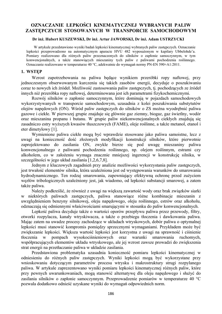 OZNACZANIE LEPKOŚCI KINEMATYCZNEJ WYBRANYCH PALIW ZASTĘPCZYCH STOSOWANYCH W TRANSPORCIE SAMOCHODOWYM Dr inż. Hubert KUSZEWSKI, Dr inż. Artur JAWORSKI, Dr inż. Adam USTRZYCKI W artykule przedstawiono wyniki badań lepkości kinematycznej wybranych paliw zastępczych. Oznaczanie lepkości przeprowadzono na automatycznym aparacie HVU 482 wyposażonym w kapilary Ubbelohde’a. Pomiary realizowano dla różnych paliw przeznaczonych do silników o zapłonie samoczynnym, w tym konwencjonalnych, a także stanowiących mieszaniny tych paliw z paliwami pochodzenia roślinnego. Oznaczanie realizowano w temperaturze 40 °C, adekwatnie do wymagań normy PN-EN 590+A1:2011. 1. WSTĘP Wzrost zapotrzebowania na paliwa będące wynikiem przeróbki ropy naftowej, przy jednoczesnym obserwowanym kurczeniu się takich zasobów energii, decyduje o poszukiwaniu coraz to nowych ich źródeł. Możliwość zastosowania paliw zastępczych, tj. pochodzących ze źródeł innych niż przeróbka ropy naftowej, determinowana jest ich parametrami fizykochemicznymi. Rozwój silników o zapłonie samoczynnym, które dominują w pojazdach samochodowych wykorzystywanych w transporcie samochodowym, uzasadnia z kolei poszukiwania substytutów olejów napędowych (ON). Wśród paliw zastępczych do silników o ZS można wyodrębnić paliwa gazowe i ciekłe. W pierwszej grupie znajduje się głównie gaz ziemny, biogaz, gaz świetlny, wodór oraz mieszanina propanu i butanu. W grupie paliw niekonwencjonalnych ciekłych znajdują się zasadniczo estry wyższych kwasów tłuszczowych (FAME), oleje roślinne, a także metanol, etanol i eter dimetylowy [1]. Wymienione paliwa ciekłe mogą być wprawdzie stosowane jako paliwa samoistne, lecz z uwagi na konieczność dość złożonych modyfikacji konstrukcji silników, które pierwotnie zaprojektowano do zasilania ON, zwykle bierze się pod uwagę mieszaniny paliwa konwencjonalnego z paliwami pochodzenia roślinnego, np. olejem roślinnym, estrami czy alkoholem, co w założeniu wymaga znacznie mniejszej ingerencji w konstrukcję silnika, w szczególności w jego układ zasilania [1,2,6,7,8]. Jednym z kluczowych zagadnień przy analizie możliwości wykorzystania paliw zastępczych, jest trwałość elementów silnika, która uzależniona jest od występowania warunków do smarowania hydrodynamicznego. Ten rodzaj smarowania, zapewniający efektywną ochronę przed zużyciem węzłów tribologicznych uzależniony jest, jak wiadomo, od lepkości substancji smarowej, a zatem także paliwa. Należy podkreślić, że również z uwagi na większą zawartość wody oraz brak związków siarki w niektórych paliwach zastępczych, paliwa stanowiące różne kombinacje mieszanin z uwzględnieniem benzyny silnikowej, oleju napędowego, oleju roślinnego, estrów oraz alkoholu, odznaczają się odmiennymi właściwościami smarującymi w stosunku do paliw konwencjonalnych. Lepkość paliwa decyduje także o wartości oporów przepływu paliwa przez przewody, filtry, otworki rozpylacza, kanały wtryskiwacza, a także o przebiegu tłoczenia i dawkowania paliwa. Mając zatem na uwadze procesy zachodzące w układach wtryskowych, dobór paliwa o optymalnej lepkości musi stanowić kompromis pomiędzy sprzecznymi wymaganiami. Przykładem może być zwiększanie lepkości. Większa wartość lepkości jest korzystna z uwagi na sprawność i ciśnienie tłoczenia w pompach wysokociśnieniowych oraz warunki smarowania ruchomych, współpracujących elementów układu wtryskowego, ale jej wzrost zawsze prowadzi do zwiększenia strat energii na przetłaczanie paliwa w układzie zasilania. Przedstawiona problematyka uzasadnia konieczność pomiaru lepkości kinematycznej w odniesieniu do różnych paliw zastępczych. Wyniki lepkości mogą być wykorzystane przy wnioskowaniu dotyczącym parametrów procesu wtrysku i makrostruktury strugi rozpylanego paliwa. W artykule zaprezentowano wyniki pomiaru lepkości kinematycznej różnych paliw, które przy pewnych uwarunkowaniach, mogą stanowić alternatywę dla oleju napędowego i służyć do zasilania silników o zapłonie samoczynnym. Przeprowadzenie pomiarów w temperaturze 40 °C pozwala dodatkowo odnieść uzyskane wyniki do wymagań odpowiednich norm. 186 2. STANOWISKO BADAWCZE I METODYKA BADAŃ Procedura oznaczania lepkości kinematycznej została określona w normie PN-EN ISO 3104:2004, pt. „Przetwory naftowe. Ciecze przezroczyste i nieprzezroczyste. Oznaczanie lepkości kinematycznej i obliczanie lepkości dynamicznej”. Jednocześnie w normie PN-EN 590+A1:2011 pt. „Paliwa do pojazdów samochodowych. Oleje napędowe. Wymagania i metody badań” oraz w normie PN-EN 14214+A1:2011 pt. „Paliwa do pojazdów samochodowych. Estry metylowe kwasów tłuszczowych (FAME) do silników o zapłonie samoczynnym (Diesla). Wymagania i metody badań” wskazuje się na normę PN-EN ISO 3104:2004 jako obowiązującą dla określenia lepkości kinematycznej olejów napędowych i estrów metylowych kwasów tłuszczowych. Zgodnie z przytoczoną normą lepkość kinematyczną ciekłych produktów naftowych, zarówno przezroczystych, jak i nieprzezroczystych, oznacza się na podstawie pomiaru czasu przepływu określonej objętości cieczy pod wpływem sił grawitacyjnych, przez wzorcowany, szklany przyrząd kapilarny. Do pomiarów lepkości kinematycznej wybranych paliw zastępczych wykorzystano automatyczny aparat HVU 482 firmy Herzog skonstruowany w oparciu o lepkościomierz Ubbelohde’a. Specyfikacja techniczna aparatu spełnia wymagania norm PN-ISO 3105:2006, ASTM D446 – 07 i IP71 (sec. 2) oraz umożliwia realizację pomiarów w oparciu o normy PN-EN ISO 3104, ASTM D 445, ASTM D 2270, IP 71 sec.1 oraz DIN 51 562. Kapilary Ubbelohde’a w aparcie HVU 482 mają dodatkową czwartą szklaną rurkę umożliwiającą automatyzację procesu mycia kapilar po zrealizowaniu testu. W czasie badań wykorzystywano dwie wbudowane w aparat kapilary. Charakterystyka 