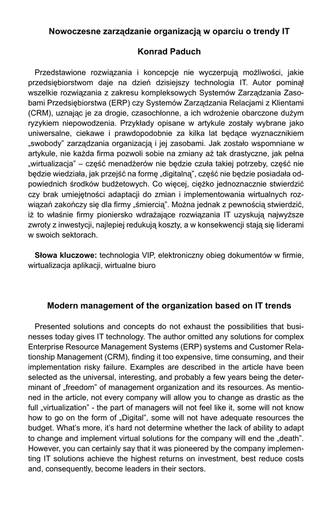 Nowoczesne zarządzanie organizacją w oparciu o trendy IT Konrad Paduch Przedstawione rozwiązania i koncepcje nie wyczerpują możliwości, jakie przedsiębiorstwom daje na dzień dzisiejszy technologia IT. Autor pominął wszelkie rozwiązania z zakresu kompleksowych Systemów Zarządzania Zasobami Przedsiębiorstwa (ERP) czy Systemów Zarządzania Relacjami z Klientami (CRM), uznając je za drogie, czasochłonne, a ich wdrożenie obarczone dużym ryzykiem niepowodzenia. Przykłady opisane w artykule zostały wybrane jako uniwersalne, ciekawe i prawdopodobnie za kilka lat będące wyznacznikiem „swobody” zarządzania organizacją i jej zasobami. Jak zostało wspomniane w artykule, nie każda firma pozwoli sobie na zmiany aż tak drastyczne, jak pełna „wirtualizacja” – część menadżerów nie będzie czuła takiej potrzeby, część nie będzie wiedziała, jak przejść na formę „digitalną”, część nie będzie posiadała odpowiednich środków budżetowych. Co więcej, ciężko jednoznacznie stwierdzić czy brak umiejętności adaptacji do zmian i implementowania wirtualnych rozwiązań zakończy się dla firmy „śmiercią”. Można jednak z pewnością stwierdzić, iż to właśnie firmy pioniersko wdrażające rozwiązania IT uzyskują najwyższe zwroty z inwestycji, najlepiej redukują koszty, a w konsekwencji stają się liderami w swoich sektorach. Słowa kluczowe: technologia VIP, elektroniczny obieg dokumentów w firmie, wirtualizacja aplikacji, wirtualne biuro Modern management of the organization based on IT trends Presented solutions and concepts do not exhaust the possibilities that businesses today gives IT technology. The author omitted any solutions for complex Enterprise Resource Management Systems (ERP) systems and Customer Relationship Management (CRM), finding it too expensive, time consuming, and their implementation risky failure. Examples are described in the article have been selected as the universal, interesting, and probably a few years being the determinant of „freedom” of management organization and its resources. As mentioned in the article, not every company will allow you to change as drastic as the full „virtualization” - the part of managers will not feel like it, some will not know how to go on the form of „Digital”, some will not have adequate resources the budget. What’s more, it’s hard not determine whether the lack of ability to adapt to change and implement virtual solutions for the company will end the „death”. However, you can certainly say that it was pioneered by the company implementing IT solutions achieve the highest returns on investment, best reduce costs and, consequently, become leaders in their sectors. Keywords: VIP technology, electronic circulation of documents in the company, application virtualization, virtual office