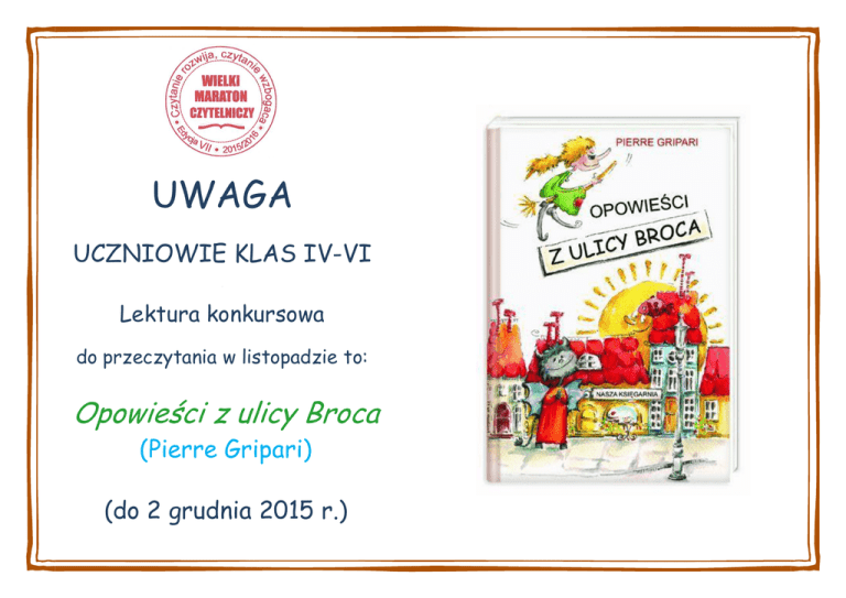 UWAGA UCZNIOWIE KLAS IV-VI , Lektura konkursowa do przeczytania w listopadzie to: Opowieści z ulicy Broca (Pierre Gripari) (do 2 grudnia 2015 r.)