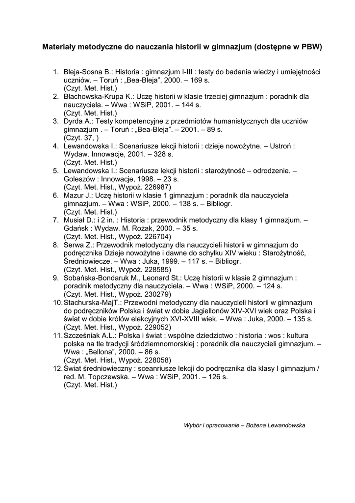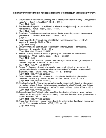 Materiały metodyczne do nauczania historii w gimnazjum (dostępne w PBW) 1. Bleja-Sosna B.: Historia : gimnazjum I-III : testy do badania wiedzy i umiejętności uczniów. – Toruń : „Bea-Bleja”, 2000. – 169 s. (Czyt. Met. Hist.) 2. Błachowska-Krupa K.: Uczę historii w klasie trzeciej gimnazjum : poradnik dla nauczyciela. – Wwa : WSiP, 2001. – 144 s. (Czyt. Met. Hist.) 3. Dyrda A.: Testy kompetencyjne z przedmiotów humanistycznych dla uczniów gimnazjum . – Toruń : „Bea-Bleja”. – 2001. – 89 s. (Czyt. 37, ) 4. Lewandowska I.: Scenariusze lekcji historii : dzieje nowoŜytne. – Ustroń : Wydaw. Innowacje, 2001. – 328 s. (Czyt. Met. Hist.) 5. Lewandowska I.: Scenariusze lekcji historii : staroŜytność – odrodzenie. – Goleszów : Innowacje, 1998. – 23 s. (Czyt. Met. Hist., WypoŜ. 226987) 6. Mazur J.: Uczę historii w klasie 1 gimnazjum : poradnik dla nauczyciela gimnazjum. – Wwa : WSiP, 2000. – 138 s. – Bibliogr. (Czyt. Met. Hist.) 7. Musiał D.: i 2 in. : Historia : przewodnik metodyczny dla klasy 1 gimnazjum. – Gdańsk : Wydaw. M. RoŜak, 2000. – 35 s. (Czyt. Met. Hist., WypoŜ. 226704) 8. Serwa Z.: Przewodnik metodyczny dla nauczycieli historii w gimnazjum do podręcznika Dzieje nowoŜytne i dawne do schyłku XIV wieku : StaroŜytność, Średniowiecze. – Wwa : Juka, 1999. – 117 s. – Bibliogr. (Czyt. Met. Hist., WypoŜ. 228585) 9. Sobańska-Bondaruk M., Leonard St.: Uczę historii w klasie 2 gimnazjum : poradnik metodyczny dla nauczyciela. – Wwa : WSiP, 2000. – 124 s. (Czyt. Met. Hist., WypoŜ. 230279) 10. Stachurska-MajT.: Przewodni metodyczny dla nauczycieli historii w gimnazjum do podręczników Polska i świat w dobie Jagiellonów XIV-XVI wiek oraz Polska i świat w dobie królów elekcyjnych XVI-XVIII wiek. – Wwa : Juka, 2000. – 135 s. (Czyt. Met. Hist., WypoŜ. 229052) 11. Szcześniak A.L.: Polska i świat : wspólne dziedzictwo : historia : wos : kultura polska na tle tradycji śródziemnomorskiej : poradnik dla nauczycieli gimnazjum. – Wwa : „Bellona”, 2000. – 86 s. (Czyt. Met. Hist., WypoŜ. 228058) 12. Świat średniowieczny : sceanriusze lekcji do podręcznika dla klasy I gimnazjum / red. M. Topczewska. – Wwa : WSiP, 2001. – 126 s. (Czyt. Met. Hist.) Wybór i opracowanie – BoŜena Lewandowska