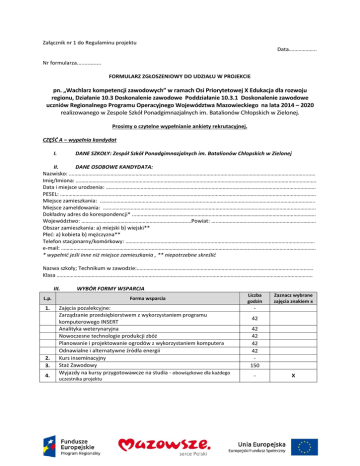 Załącznik nr 1 do Regulaminu projektu Data……………….. Nr formularza................ FORMULARZ ZGŁOSZENIOWY DO UDZIAŁU W PROJEKCIE pn. „Wachlarz kompetencji zawodowych” w ramach Osi Priorytetowej X Edukacja dla rozwoju regionu, Działanie 10.3 Doskonalenie zawodowe Poddziałanie 10.3.1 Doskonalenie zawodowe uczniów Regionalnego Programu Operacyjnego Województwa Mazowieckiego na lata 2014 – 2020 realizowanego w Zespole Szkół Ponadgimnazjalnych im. Batalionów Chłopskich w Zielonej. Prosimy o czytelne wypełnianie ankiety rekrutacyjnej. CZĘŚD A – wypełnia kandydat I. DANE SZKOŁY: Zespół Szkół Ponadgimnazjalnych im. Batalionów Chłopskich w Zielonej II. DANE OSOBOWE KANDYDATA: Nazwisko: ……………………………………………………………………………………………………………………………………………………...…… Imię/Imiona: ……………………………………………………………………………………………………………………………………………………….. Data i miejsce urodzenia: ……………………………………………………………………………………………………………………………………. PESEL: …………………………………………………………………………………………………………………………………………………………………. Miejsce zamieszkania: ……………………………………………………………………………………………………………………………………….. Miejsce zameldowania: ……………………………………………………………………………………………………………………………………... Dokładny adres do korespondencji* ..…………………………………………………………………………………………………………………. Województwo: …………………….………………………………………………Powiat: …..……………………………………………………………. Obszar zamieszkania: a) miejski b) wiejski** Płed: a) kobieta b) mężczyzna** Telefon stacjonarny/komórkowy: ………………………………………………………………………………………………………………………. e-mail: ………………………………………………………..………………………………………………………………………………………………………. * wypełnid jeśli inne niż miejsce zamieszkania , ** niepotrzebne skreślid Nazwa szkoły; Technikum w zawodzie:………………………………………………………………………………………………………………. Klasa …………………………………………………………………………………………………………………………………………………………………. III. WYBÓR FORMY WSPARCIA L.p. 1. 2. 3. 4. Forma wsparcia Zajęcia pozalekcyjne: Zarządzanie przedsiębiorstwem z wykorzystaniem programu komputerowego INSERT Analityka weterynaryjna Nowoczesne technologie produkcji zbóż Planowanie i projektowanie ogrodów z wykorzystaniem komputera Odnawialne i alternatywne źródła energii Kurs inseminacyjny Staż Zawodowy Wyjazdy na kursy przygotowawcze na studia - obowiązkowe dla każdego uczestnika projektu Liczba godzin Zaznacz wybrane zajęcia znakiem x 42 42 42 42 42 150 - X IV. Opis motywacji uczestnictwa w Projekcie (3-5 pkt) Oświadczam, iż podane dane są zgodne z prawdą oraz że są mi znane wszelkie konsekwencje prawne i odpowiedzialnośd za składanie oświadczeo niezgodnych z prawdą. ………………………………………. Miejscowośd, data …………………………………… Podpis ucznia ………………………………. Podpis opiekuna prawnego ucznia niepełnoletniego CZĘŚD B – wypełnia Szkolny Koordynator Projektu. Decyzja o zakwalifikowaniu do projektu:  Spełnienie kryterium formalnego: TAK/NIE  Spełnienie kryterium uzupełniającego (liczba uzyskanych punktów:…………………..) Podpisy członków Komisji Rekrutacyjnej: 1. Szkolny Koordynator Projektu:……………………………………………………………………………………………..………………………… 2. Dyrektor Lidera lub wyznaczona przez niego osoba:……………………………………………………………………..…………………