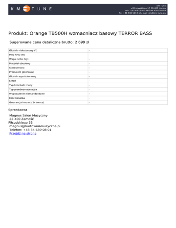KM-Tune ul.Dmowskiego 1C 18-400 Łomża NIP 718-005-09-01 REGON 450020149 Tel +48 502 511 618, mail [email protected] Produkt: Orange TB500H wzmacniacz basowy TERROR BASS Sugerowana cena detaliczna brutto: 2 699 zł Głośnik niskotonowy (") - Moc RMS (W) - Waga netto (kg) - Materiał obudowy - Stereo/mono - Producent głośników - Głośnik wysokotonowy - Skład - Typ końcówki mocy - Typ przedwzmacniacza - Wyposażenie niestandardowe - Ilość kanałów - Gwarancja inna niż 24 (m-ce) - o Sprzedawca Magnus Salon Muzyczny 22-400 Zamość Piłsudskiego 53 [email protected] Telefon: +48 84 639 08 01 Przejdź na stronę Powered by TCPDF (www.tcpdf.org)