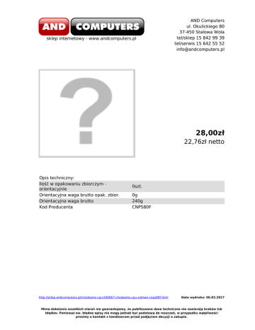 sklep internetowy - www.andcomputers.pl AND Computers ul. Okulickiego 80 37-450 Stalowa Wola tel/sklep 15 842 99 39 tel/serwis 15 642 55 52 [email protected] 28,00zł 22,76zł netto Opis techniczny: Ilość w opakowaniu zbiorczym orientacyjnie Orientacyjna waga brutto opak. zbior. Orientacyjna waga brutto Kod Producenta 0szt. 0g 240g CNPS80F http://sklep.andcomputers.pl/chodzenie-cpu/185667-chodzenie-cpu-zalman-cnps80f.html Data wydruku: 06.03.2017 Mimo dołożenia wszelkich starań nie gwarantujemy, że publikowane dane techniczne nie zawierają braków lub błędów. Ponieważ ew. błędne opisy nie mogą jednak być podstawą do roszczeń, w przypadku wątpliwości prosimy o kontakt z handlowcem przed podjęciem decyzji o zakupie.