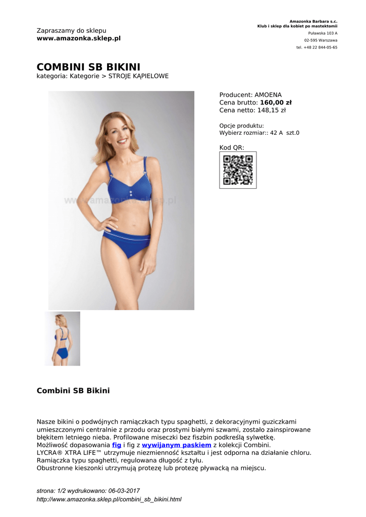 Amazonka Barbara s.c. Klub i sklep dla kobiet po mastektomii Zapraszamy do sklepu www.amazonka.sklep.pl Puławska 103 A 02-595 Warszawa tel. +48 22 844-05-65 COMBINI SB BIKINI kategoria: Kategorie > STROJE KĄPIELOWE Producent: AMOENA Cena brutto: 160,00 zł Cena netto: 148,15 zł Opcje produktu: Wybierz rozmiar:: 42 A szt.0 Kod QR: Combini SB Bikini Nasze bikini o podwójnych ramiączkach typu spaghetti, z dekoracyjnymi guziczkami umieszczonymi centralnie z przodu oraz prostymi białymi szwami, zostało zainspirowane błękitem letniego nieba. Profilowane miseczki bez fiszbin podkreślą sylwetkę. Możliwość dopasowania fig i fig z wywijanym paskiem z kolekcji Combini. LYCRA® XTRA LIFE™ utrzymuje niezmienność kształtu i jest odporna na działanie chloru. Ramiączka typu spaghetti, regulowana długość z tyłu. Obustronne kieszonki utrzymują protezę lub protezę pływacką na miejscu. strona: 1/2 wydrukowano: 06-03-2017 http://www.amazonka.sklep.pl/combini_sb_bikini.html TYLKO STANIK !!! Patrz wyżej. Kolor: Niebieski/Biały. Kolekcja Strojów 2015 oferuje szeroki wachlarz fasonów. Wszystkie zapewniają bezpieczeństwo i komfort noszenia, w niewidoczny sposób utrzymując protezę na swoim miejscu. Przemyślany krój to cecha wysokiej jakości kostiumów jedno- i dwuczęściowych , modnych i jednocześnie wygodnych w noszeniu . KOLEKCJA STROJÓW 2015 - TYLKO NA ZAMÓWIENIE i DO WYCZERPANIA ZAPASÓW ! strona: 2/2 wydrukowano: 06-03-2017 http://www.amazonka.sklep.pl/combini_sb_bikini.html