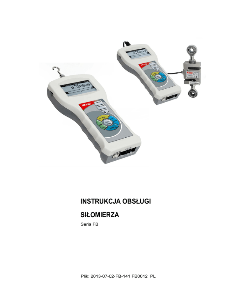 INSTRUKCJA OBSŁUGI SIŁOMIERZA Seria FB Plik: 2013-07-02-FB-141 FB0012 PL INSTRUKCJA OBSŁUGI SIŁOMIERZA FB 2 Spis treści: 1. 2. 3. 4. 5. 6. 7. 8. 9. 10. 11. 12. 12.1 12.2 12.3 13. 14. 14.1 Wstęp_________________________________________________________________________________3 Kompletacja ____________________________________________________________________________3 Zasady bezpieczeństwa___________________________________________________________________4 Szybki start ___________________________________________________________________________11 Widok siłomierza _______________________________________________________________________12 Szczegółowy opis klawiszy i wskaźników ____________________________________________________13 Dane techniczne _______________________________________________________________________14 Przygotowanie siłomierza do pracy ________________________________________________________16 Ogólne zasady eksploatacji _______________________________________________________________18 Wymiana akumulatorów__________________________________________________________________19 Uruchomienie siłomierza _________________________________________________________________20 Wykonywanie pomiarów _________________________________________________________________21 Pomiar wartości bieŜącej i szczytowej siły nacisku / ciągu _______________________________________21 Pomiar charakterystyki siły, rejestracja pomiarów w pamięci______________________________________23 Pomiar masy – wykorzystanie siłomierza jako wagi ____________________________________________24 Połączenia z urządzeniami zewnętrznymi ____________________________________________________27 Menu UŜytkownika______________________________________________________________________28 Pomiar _______________________________________________________________________________28 14.1.1 Szybkość pomiaru ________________________________________________________________ 29 14.1.2 Jednostki _______________________________________________________________________ 30 14.1.3 Autozerowanie ___________________________________________________________________ 31 14.1.4 Porównanie z wartościami progowymi MIN / OK / MAX __________________________________ 32 14.2 Pamięć_______________________________________________________________________________33 14.2.1 Zbieranie wyników _______________________________________________________________ 34 14.2.2 Ekspozycja zebranych pomiarów (Statystyka) __________________________________________ 35 14.2.3 Zapis, odczyt, kasowanie pomiarów (Statystyka) ________________________________________ 36 14.3 Konfiguracja___________________________________________________________________________37 14.3.1 Ustawianie parametrów interfejsów szeregowych________________________________________ 38 14.3.2 Kalibracja siłomierza ______________________________________________________________ 39 14.3.3 Informacje o wyrobie______________________________________________________________ 40 14.3.4 Ustawienie daty i godziny __________________________________________________________ 41 14.3.5 Ustawienia wyświetlacza LCD ______________________________________________________ 42 14.3.6 Wybór języka menu _______________________________________________________________ 43 14.3.7 Ustawianie wydruku ______________________________________________________________ 44 14.3.8 Włączenie/wyłączenie dźwięku podczas uŜywania klawiatury (beep) ________________________ 45 14.3.9 Automatyczne wyłączanie zasilania (Auto-OFF) ________________________________________ 45 14.3.10 Kontrola ładowania akumulatorów (Bateria) ___________________________________________ 46 14.3.11 Wejście zewnętrzne (Wejście zewn.) _________________________________________________ 48 14.3.12 Aktualizacja oprogramowania (Aktual.oprogram.) _______________________________________ 48 14.3.13 Ustawienia domyślne ______________________________________________________________ 49 15. Konserwacja i usuwanie drobnych uszkodzeń_________________________________________________49 16. Diagram menu siłomierza ________________________________________________________________51 Deklaracja zgodności _________________________________________________________________________54 Dodatek A 55 INSTRUKCJA OBSŁUGI SIŁOMIERZA FB 1. 3 Wstęp Siłomierze serii FB produkcji AXIS Sp. z o.o. są przeznaczone do pomiaru siły nacisku lub siły ciągu w laboratoriach, w produkcji oraz w kontroli jakości. Pomiary sił do 200N mogą być dokonywane siłomierzem trzymanym w ręku. Pomiary sił od 200N do 500N wymagają uŜycia uchwytu dwuręcznego (wyposaŜenie dodatkowe). MoŜliwe jest równieŜ umieszczenie siłomierza w statywie (wyposaŜenie dodatkowe). Do pomiaru sił powyŜej 500N stosuje się siłomierze z zewnętrznym czujnikiem siły, który zwykle montowany jest za pomocą elementów łączących do obiektów uŜytkownika. Wyniki pomiarów mogą być prezentowane w formie wykresów, histogramów i mogą być zapisywane na kartach typu microSD. Złącze szeregowe RS232C oraz USB umoŜliwia transmisję wyników pomiarów do komputera lub drukarki w celu ich dalszej analizy lub rejestracji. Siłomierz jest urządzeniem pomiarowym i nie jest przeznaczony do stosowania jako osprzęt do podnoszenia ładunków w sensie dyrektywy 2006/42/WE (maszynowej). Informacje uzupełniające dotyczące siłomierza FB00 zostały umieszczone w Dodatku A. 2. Kompletacja Podstawowy komplet stanowi: 1. Siłomierz , 2. Akumulatory NiMH 2700mAh – 4szt. 3. Zasilacz ~230V 50Hz / =12V; 1,25A, 4. Popychacz do karty microSD 5. Deklaracja zgodności, 6. Płyta CD z instrukcją obsługi i programem komputerowym, 7. Gwarancja. Ponadto: - do FB50-FB500: końcówki pchające – 4szt., hakowa – 1szt., przedłuŜka – 1szt. - do FB1k-FB50k: zawiesie z przegubem – 2szt. INSTRUKCJA OBSŁUGI SIŁOMIERZA FB 4 3. 3.1 Zasady bezpieczeństwa Ogólne zasady bezpieczeństwa Niezbędne jest uwaŜne zapoz