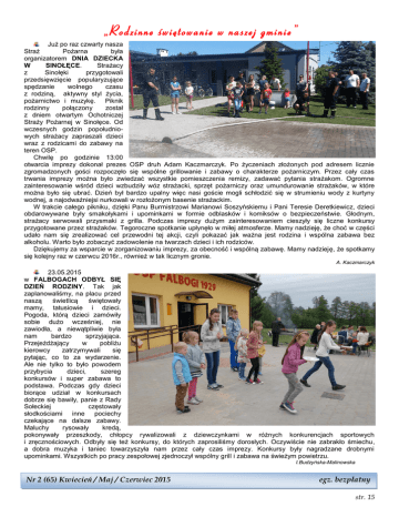 „Rodzinne świętowanie w naszej gminie ” Już po raz czwarty nasza Straż Pożarna była organizatorem DNIA DZIECKA W SINOŁĘCE. Strażacy z Sinołęki przygotowali przedsięwzięcie popularyzujące spędzanie wolnego czasu z rodziną, aktywny styl życia, pożarnictwo i muzykę. Piknik rodzinny połączony został z dniem otwartym Ochotniczej Straży Pożarnej w Sinołęce. Od wczesnych godzin popołudniowych strażacy zapraszali dzieci wraz z rodzicami do zabawy na teren OSP. Chwilę po godzinie 13:00 otwarcia imprezy dokonał prezes OSP druh Adam Kaczmarczyk. Po życzeniach złożonych pod adresem licznie zgromadzonych gości rozpoczęło się wspólne grillowanie i zabawy o charakterze pożarniczym. Przez cały czas trwania imprezy można było zwiedzać wszystkie pomieszczenia remizy, zadawać pytania strażakom. Ogromne zainteresowanie wśród dzieci wzbudziły wóz strażacki, sprzęt pożarniczy oraz umundurowanie strażaków, w które można było się ubrać. Dzień był bardzo upalny więc nasi goście mogli schłodzić się w strumieniu wody z kurtyny wodnej, a najodważniejsi nurkowali w rozłożonym basenie strażackim. W trakcie całego pikniku, dzięki Panu Burmistrzowi Marianowi Soszyńskiemu i Pani Teresie Deretkiewicz, dzieci obdarowywane były smakołykami i upominkami w formie odblasków i komiksów o bezpieczeństwie. Głodnym, strażacy serwowali przysmaki z grilla. Podczas imprezy dużym zainteresowaniem cieszyły się liczne konkursy przygotowane przez strażaków. Tegoroczne spotkanie upłynęło w miłej atmosferze. Mamy nadzieję, że choć w części udało nam się zrealizować cel przewodni tej akcji, czyli pokazać jak ważna jest rodzina i wspólna zabawa bez alkoholu. Warto było zobaczyć zadowolenie na twarzach dzieci i ich rodziców. Dziękujemy za wsparcie w zorganizowaniu imprezy, za obecność i wspólną zabawę. Mamy nadzieję, że spotkamy się kolejny raz w czerwcu 2016r., również w tak licznym gronie. A. Kaczmarczyk 23.05.2015 w FALBOGACH ODBYŁ SIĘ DZIEŃ RODZINY. Tak jak zaplanowaliśmy, na placu przed naszą świetlicą świętowały mamy, tatusiowie i dzieci. Pogoda, którą dzieci zamówiły sobie dużo wcześniej, nie zawiodła, a niewątpliwie była nam bardzo sprzyjająca. Przejeżdżający w pobliżu kierowcy zatrzymywali się pytając, co to za wydarzenie. Ale nie tylko to było powodem przybycia dzieci, szereg konkursów i super zabawa to podstawa. Podczas gdy dzieci biorące udział w konkursach dobrze się bawiły, panie z Rady Sołeckiej częstowały słodkościami inne pociechy czekające na dalsze zabawy. Maluchy rysowały kredą, pokonywały przeszkody, chłopcy rywalizowali z dziewczynkami w różnych konkurencjach sportowych i zręcznościowych. Odbyły się też konkursy, do których zaprosiliśmy dorosłych. Oczywiście nie zabrakło śmiechu, a dobra muzyka i taniec towarzyszyła nam przez cały czas imprezy. Konkursy były nagradzane drobnymi upominkami. Wszystkich po pracy zespołowej zjednoczył wspólny grill i zabawa na świeżym powietrzu. I.Budzyńska-Malinowska Nr 2 (65) Kwiecień / Maj / Czerwiec 2015 egz. bezpłatny str. 15