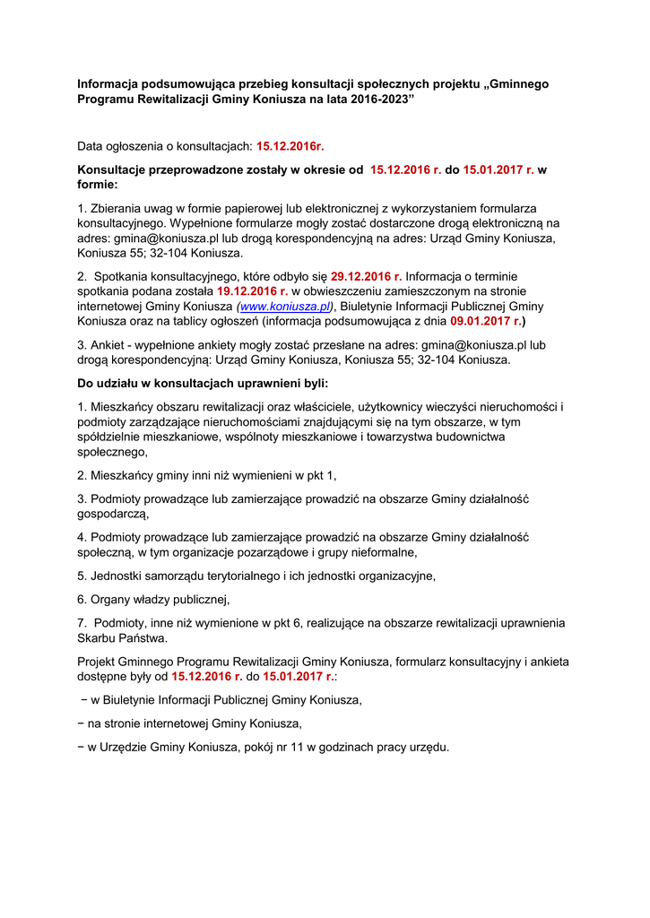 Informacja podsumowująca przebieg konsultacji społecznych projektu „Gminnego Programu Rewitalizacji Gminy Koniusza na lata 2016-2023” Data ogłoszenia o konsultacjach: 15.12.2016r. Konsultacje przeprowadzone zostały w okresie od 15.12.2016 r. do 15.01.2017 r. w formie: 1. Zbierania uwag w formie papierowej lub elektronicznej z wykorzystaniem formularza konsultacyjnego. Wypełnione formularze mogły zostać dostarczone drogą elektroniczną na adres: [email protected] lub drogą korespondencyjną na adres: Urząd Gminy Koniusza, Koniusza 55; 32-104 Koniusza. 2. Spotkania konsultacyjnego, które odbyło się 29.12.2016 r. Informacja o terminie spotkania podana została 19.12.2016 r. w obwieszczeniu zamieszczonym na stronie internetowej Gminy Koniusza (www.koniusza.pl), Biuletynie Informacji Publicznej Gminy Koniusza oraz na tablicy ogłoszeń (informacja podsumowująca z dnia 09.01.2017 r.) 3. Ankiet - wypełnione ankiety mogły zostać przesłane na adres: [email protected] lub drogą korespondencyjną: Urząd Gminy Koniusza, Koniusza 55; 32-104 Koniusza. Do udziału w konsultacjach uprawnieni byli: 1. Mieszkańcy obszaru rewitalizacji oraz właściciele, użytkownicy wieczyści nieruchomości i podmioty zarządzające nieruchomościami znajdującymi się na tym obszarze, w tym spółdzielnie mieszkaniowe, wspólnoty mieszkaniowe i towarzystwa budownictwa społecznego, 2. Mieszkańcy gminy inni niż wymienieni w pkt 1, 3. Podmioty prowadzące lub zamierzające prowadzić na obszarze Gminy działalność gospodarczą, 4. Podmioty prowadzące lub zamierzające prowadzić na obszarze Gminy działalność społeczną, w tym organizacje pozarządowe i grupy nieformalne, 5. Jednostki samorządu terytorialnego i ich jednostki organizacyjne, 6. Organy władzy publicznej, 7. Podmioty, inne niż wymienione w pkt 6, realizujące na obszarze rewitalizacji uprawnienia Skarbu Państwa. Projekt Gminnego Programu Rewitalizacji Gminy Koniusza, formularz konsultacyjny i ankieta dostępne były od 15.12.2016 r. do 15.01.2017 r.: − w Biuletynie Informacji Publicznej Gminy Koniusza, − na stronie internetowej Gminy Koniusza, − w Urzędzie Gminy Koniusza, pokój nr 11 w godzinach pracy urzędu. Uwagi w sprawie projektu Gminnego Programu Rewitalizacji Gminy Koniusza na lata 20162023: Formularz konsultacyjny projektu Gminnego Programu Rewitalizacji Gminy Koniusza nr 1.: Propozycje przedsięwzięć: 1. Udostępnienie i przygotowanie dla turystów zabytkowej kaplicy w Dalewicach 2. Zagospodarowanie budynku remizy OSP na potrzeby turystyki i integracji społeczności lokalnej Formularz konsultacyjny projektu Gminnego Programu Rewitalizacji Gminy Koniusza nr 2.: Propozycje przedsięwzięć: 1. Przegląd Tańców Regionalnych 2. Święto Biórkowa 3. Festiwal przemysłów kultury „Biórkowskie regionalna” Formularz konsultacyjny projektu Gminnego Programu Rewitalizacji Gminy Koniusza nr 3.: Propozycje przedsięwzięć: 1. Odnowienie Kapliczki Św. Floriana 2. Uporządkowanie i ogrodzenie cmentarza (tzw. cholerki), oraz wbudowanie kamienia z tablicą upamiętniającą Formularz konsultacyjny projektu Gminnego Programu Rewitalizacji Gminy Koniusza nr 4.: Propozycje przedsięwzięć: 1. Przywrócenie starej studni do użycia publicznego jako atrakcji turystycznej zatrzymującej przejezdnych rowerzystów na planowanej trasie rowerowej Eurovelo 11 2. Mała architektura oraz siłownia plenerowa w gminnej części parku 3. Oświetlenie ulic i chodników Biórkowa Wielkiego 4. Skanalizowanie miejscowości Biórków Wielki Ankieta konsultacyjna w sprawie projektu Gminnego Programu Rewitalizacji Gminy Koniusza nr 1: W odpowiedzi na pytanie w sprawie opinii na temat przedsięwzięć inwestycyjnych w obszarze rewitalizacji wyznaczonym na terenie Gminy Koniusza zaznaczono opcję: „Zdecydowanie się zgadzam” oraz nie wskazano uwag do projektu. Ankieta konsultacyjna w sprawie projektu Gminnego Programu Rewitalizacji Gminy Koniusza nr 2: W odpowiedzi na pytanie w sprawie opinii na temat przedsięwzięć inwestycyjnych w obszarze rewitalizacji wyznaczonym na terenie Gminy Koniusza zaznaczono opcję: „Raczej się zgadzam” oraz wskazano uwagi do Projektu dotyczące: - oświetlenia ulicznego, - ochrony zdegradowanego środowiska, - braku kanalizacji, - komunikacji Gminy z aglomeracją krakowską. Uwagi zostały uwzględnione i dokonano zmian w treści Gminnego Programu Rewitalizacji Gminy Koniusza na lata 2016-2023 w zakresie przedsięwzięć wpisujących się w założenia GPR.