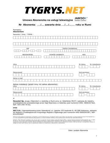 Umowa Abonencka na usługi telewizyjne Nr Abonenta: …./.... zawarta dnia …./..../........ roku w Rumi Pomiędzy: Abonentem Nazwisko I Imię / FIRMA : Telefon kontaktowy NIP - REGON/PESEL DOWÓD OSOBISTY KRS Ulica Nr domu Miejscowość Kod pocztowy Nr mieszkania ___ Adres e-mail Adres instalacji (jeżeli inny niż adres abonenta): Ulica Nr domu Miejscowość Kod pocztowy Nr mieszkania ___ a: Nowatel Sp. z o.o. (Operator) z siedzibą w Rumi przy ul. Gdańskiej 39/27, wpisaną do rejestru przedsiębiorców prowadzonego przez Sąd Rejonowy w Gdańsku pod numerem KRS: 0000167362, NIP: 593-240-70-62, oraz SGT S.A. (reprezentowaną przez Operatora) ul. Ligocka 103 budynek 8, 40-568 Katowice, wpisana do Rejestru Przedsiębiorców Krajowego Rejestru Sądowego pod numerem KRS 0000293307, NIP: 6312533927 Abonent wyraża zgodę na wystawianie i przesyłanie w formie elektronicznej, na wskazany adres e-mail, faktur lub rachunków za usługi świadczone przez firmę Nowatel Sp. z o.o. oraz na posłużenie się przez dostawcę usług podanym w umowie numerem telefonu w celu przekazywania informacji dot. konta abonenckiego. Operator i SGT informują, że zgodnie z art. 23 ust 1 pkt 3 i 5 oraz art. 23 ust 4 Ustawy z dnia 29 sierpnia 1997r. o ochronie danych osobowych (tekst jednolity: Dz. U. 2002r. Nr 101 poz. 926, ze zm.), dane osobowe Abonenta będą przetwarzane w bazach danych Operatora i SGT dla celów realizacji niniejszej umowy oraz marketingu Usług świadczonych przez Operatora i/lub SGT. Abonent oświadcza że został poinformowany o prawie kontroli przetwarzania danych, które go dotyczą, w szczególności o prawie do dostępu do treści swoich danych oraz ich poprawiania, żądania ich uzupełnienia, uaktualnienia i sprostowania. Data i podpis Abonenta 1 jPIN Operator zaleca zmianę podanych obok numerów tvPIN PIN na inne, znane jedynie Abonentowi. Wybrane produkty: Pakiet MINI HD Pakiet Wielotematyczny HD Pakiet Wielotematyczny SUPER HD Umowa zostaje zawarta na czas: Określony (12 miesięcy) Określony (24 miesiące) Nieokreślony Abonament miesięczny: zł Aktywacja: zł Multiroom: Ilość: szt. Abonament miesięczny: zł Aktywacja: zł Usługi dodatkowe (nie dotyczy pakietu Mini HD): Więcej muzyki 3,99 zł Więcej Filmów HD 9,99 zł Pakiet nHD 6,99 zł Pakiet Canal+ Sielect 49,99 zł TVP HD 5,99 zł Mezzo Live HD 5,99 zł Więcej Discovery 5,99 zł Więcej Seriali 9,99 zł Więcej HD 14,99 zł Pakiet Canal+ Prestige 59,99 zł Polsat Sport Extra HD 7,99 zł Discovery 5,99zł Channel HD Więcej Sportu HD 7,99 zł Więcej Luzu HD 7,99 zł Pakiet Next 3D HD 6,99 zł Pakiet Canal+ Platinum 68,99zł Polsat Sport HD 7,99 zł National 5,99 zł Geographic HD Więcej Bajek 5,99 zł Więcej Nauki HD 6,99 zł Pakiet HBO HD 29,99 zł Pakiet Cinemax HD 14,99 zł nSPORT HD 5,99 zł Nat Geo Wild HD 5,99 zł TV Republika 4,99 zł Pakiet VIASAT HD 9,99 zł Pakiet HBO HD+ OD+GO 36,99 zł Pakiet Filmbox HD 14,99 zł MTV Live HD 8,99 zł Animal Planet HD 5,99 zł PROTOKÓŁ PRZEKAZANIA SPRZĘTU W celu realizacji umowy o świadczenie usług telewizyjnych, Operator użycza Klientowi zestaw abonencki*, w składzie: Lp. Nazwa Ilość Numer seryjny / Adres MAC 1 2 3 4 * Zestaw abonencki stanowi własność Operatora, wartość zainstalowanych urządzeń określa Cennik usług telewizyjnych Operatora 1. Abonent oświadcza, że zapoznał się i w pełni akceptuje Cennik Usług świadczonych przez Operatora i SGT („Cennik”), Ogólny Regulamin Świadczenia Usług („Regulamin”), ewentualne Regulaminy Dodatkowe i Regulaminy Promocji. 2. Regulamin oraz ewentualnie Regulaminy Dodatkowe i Regulaminy Promocji stanowią integralna część niniejszej Umowy Abonenckiej. Regulaminy Dodatkowe lub Regulaminy Promocji dotyczą jedynie Usług lub ich części wyraźnie w tych regulaminach wskazanych i nie wiążą Abonenta, jeśli nie zamówił on tych Usług. 3. Abonent oświadcza, że posiada prawo do Lokalu, lub zgodę właściciela, pozwalające na wykonanie instalacji w Lokalu. 4. Wartość ulgi przyznanej Abonentowi jest określona w Regulaminie Promocji lub Cenniku. 5. Abonent oświadcza, że instalacja i aktywacja Usług jest zgodna z Zamówieniem na Zawarcie Umowy Abonenckiej, a Usługa jest w pełni sprawna. W chwili podpisania Umowy, zamówione przez Abonenta Usługi są już aktywne i świadczone przez Operatora lub SGT, o ile z przyczyn technicznych Strony w Uwagach do Umowy nie stwierdziły inaczej. W takim przypadku Usługi zostaną uruchomione nie później niż w przeciągu 24 godzin od podpisania Umowy. W przypadku, gdy Regulaminy Dodatkowe lub Regulaminy Promocji przewidują inny termin uruchomienia usługi, termin ten będzie nie dłuższy niż 30 dni od dnia podpisania Umowy. 6. Podpisując niniejszą Umowę, Abonent zobowiązuje się do zapłaty wyszczególnionych w Cenniku lub Regulaminach Promocji kosztów związanych z instalacją i aktywacją Usług oraz do zapłaty comiesięcznych Opłat za zakupione Pakiety i inne Usługi. 7. Okresem rozliczeniowym jest jednomiesięczny okres liczony od początku do końca miesiąca kalendarzowego. Opłaty dotyczące okresów krótszych niż Okres Rozliczeniowy są naliczane proporcjonalnie do czasu świadczenia Usług w danym Okresie Rozliczeniowym. 2 8. Abonentowi świadczone są usługi telewizyjne. Abonent posiada prawo do zakupu i rezygnacji z Pakietów Dodatkowych i innych Usług udostępnianych przez Operatora lub SGT. Minimalnym zakresem Usług świadczonym przez Operatora i SGT jest usługa telewizyjna zawierająca Pakiet Wielotematyczny. Na opłatę abonamentową składają się: opłata za Pakiet Wielotematyczny, opłata za udostępnienie urządzeń – o ile zostały udostępnione, opłata za dodatkowe usługi lub opcje usług. Regulaminy Dodatkowe mogą wprowadzać inne elementy składające się na opłatę abonamentową. Oprócz opłaty abonamentowej Abonentowi mogą być naliczane opłaty jednorazowe, stosownie do postanowień Cennika czy