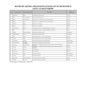 KONKURS JĘZYKA POLONISTYCZNEGO (ETAP REJONOWY) LISTA UCZESTNIKÓW Lp. Nazwisko ucznia Imię / imiona ucznia Nazwa szkoły Miejscowość 1. Jakubowska Oliwia Zespół Placówek Oświatowych Chociwel 2. Tabiś Joanna Weronika Zespół Placówek Oświatowych Chociwel 3. Cieślak Norbert Maciej Gimnazjum nr 2 z Oddziałami Mistrzostwa Sportowego Stargard 4. Skwara Alicja Gimnazjum nr 2 z Oddziałami Mistrzostwa Sportowego Stargard 5. Wiewióra Kacper Gimnazjum nr 3 Stargard Stargard 6. Kałuża Anna Gimnazjum nr 3 Stargard Stargard 7. Braszczyńska Klaudia Zespół Szkół w Dolicach - Gimnazjum Publiczne w Dolicach Dolice 8. But Ewa Zespół Szkół w Dolicach - Gimnazjum Publiczne w Dolicach Dolice 9. JURSKI KAROL KONRAD GIMNAZJUM INTEGRACYJNE STARGARD 10. SZCZEPAŃSKA AGATA GIMNAZJUM INTEGRACYJNE STARGARD 11. Fidos Szymon Gimnazjum Katolickie im. Kard. Augusta Hlonda Stargard 12. Podcaba Maja Gimnazjum Katolickie im. Kard. Augusta Hlonda Stargard 13. SZUNEJKO SYLWIA PUBLICZNE GIMNAZJUM W MARIANOWIE MARIANOWO KLATKIEWICZ BARTOSZ STANISŁAW PUBLICZNE GIMNAZJUM W MARIANOWIE MARIANOWO 14. Gimnazjum nr 4 z Oddziałami Mistrzostwa Sportowego im. Noblistów Polskich w Stargardzie Gimnazjum nr 4 z Oddziałami Mistrzostwa Sportowego im. Noblistów Polskich w Stargardzie 15. Ocalewska Julia Aleksandra 16. Gonerka Gabriela 17. Cierocka Zuzanna ZSP w Reptowie Reptowo 18. Kędzierska Julia ZSP w Reptowie Reptowo 19. Kochanowska Joanna Gimnazjum Publiczne Stara Dąbrowa 20. Jaremba Artur Gimnazjum Publiczne Stara Dąbrowa 21. Bardzińska Aleksandra Danuta Gimnazjum Publiczne w Suchaniu Suchań 22. Rucińska Weronika Gimnazjum Publiczne w Suchaniu Suchań Konkurs odbędzie się 22 listopada 2016 r. o godzinie 14.00 Stargrad Stargrad