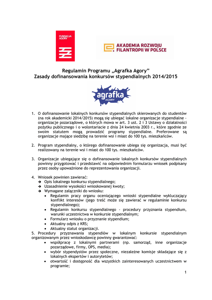 Regulamin Programu „Agrafka Agory” Zasady dofinansowania konkursów stypendialnych 2014/2015 1. O dofinansowanie lokalnych konkursów stypendialnych skierowanych do studentów (na rok akademicki 2014/2015) mogą się ubiegać lokalne organizacje stypendialne organizacje pozarządowe, o których mowa w art. 3 ust. 2 i 3 Ustawy o działalności pożytku publicznego i o wolontariacie z dnia 24 kwietnia 2003 r., które zgodnie ze swoim statutem mogą prowadzić programy stypendialne. Preferowane są organizacje mające siedzibę na terenie wsi i miast do 100 tys. mieszkańców. 2. Program stypendialny, o którego dofinansowanie ubiega się organizacja, musi być realizowany na terenie wsi i miast do 100 tys. mieszkańców. 3. Organizacje ubiegające się o dofinansowanie lokalnych konkursów stypendialnych powinny przygotować i przedstawić na odpowiednim formularzu wniosek podpisany przez osoby upoważnione do reprezentowania organizacji. 4. Wniosek powinien zawierać: è Opis lokalnego konkursu stypendialnego; è Uzasadnienie wysokości wnioskowanej kwoty; è Wymagane załączniki do wniosku: · Regulamin pracy organu oceniającego wnioski stypendialne wykluczający konflikt interesów (jego treść może się zawierać w regulaminie konkursu stypendialnego); · Regulamin konkursu stypendialnego - procedury przyznania stypendium, warunki uczestnictwa w konkursie stypendialnym; · Formularz wniosku o przyznanie stypendium; · Aktualny odpis z KRS; · Aktualny statut organizacji. 5. Procedury przyznawania stypendiów w lokalnym konkursie stypendialnym organizowanym przez wnioskodawcę powinny gwarantować: · współpracę z lokalnymi partnerami (np. samorząd, inne organizacje pozarządowe, firmy, OPS, media); · wybór stypendystów przez społeczne, niezależne komisje składające się z lokalnych ekspertów i autorytetów; · otwartość i dostępność dla wszystkich zainteresowanych uczestnictwem w programie; 1 · przejrzystość procedur konkursu (w tym wykluczenie konfliktu interesów). 6. Dotacja otrzymana w ramach Programu „Agrafka Agory” wraz z pozyskaną z innych źródeł wymaganą kwotą wkładu własnego może być przeznaczona wyłącznie na wypłatę stypendiów. 7. Wkład własny wnioskodawcy nie może pochodzić z innych ogólnopolskich programów stypendialnych. 8. Lokalny konkurs stypendialny, który dostanie dofinansowanie w ramach Programu, powinien nosić nazwę, której pierwsza część brzmi, „Agrafka Agory”. W drugiej części nazwę można rozwinąć o własny podtytuł. 9. Termin nadsyłania wniosków o dofinansowanie lokalnych konkursów stypendialnych upływa 03 marca 2014 r. (decyduje data doręczenia). Wnioski należy przesłać na adres: Program „Agrafka Agory” Akademia Rozwoju Filantropii w Polsce ul. Marszałkowska 6/6 00-590 Warszawa 10. Dodatkowe informacje można uzyskać pod numerem (22) 622 01 22 w.16 lub pod adresem email – [email protected] KRYTERIA OCENY WNIOSKÓW: 11. Oceny złożonych w terminie, zgodnie z zasadami Regulaminu, kompletnych wniosków dokona Komisja Konkursowa powołana przez Akademię Rozwoju Filantropii w Polsce. Wnioski o dofinansowanie lokalnych konkursów stypendialnych będą oceniane zgodnie z następującymi kryteriami: · przejrzystość kryteriów i procedur lokalnego konkursu stypendialnego; · stopień zaangażowania partnerów lokalnych; · rozpoznanie potrzeb lokalnych; · sposoby informowania o darczyńcy Programu; · różnorodność źródeł finansowania i wysokość wkładu własnego pozyskanego na stypendia; · obszar realizacji i odbiorcy; · warunki formalne przewidziane w niniejszym regulaminie. WYSOKOŚĆ DOTACJI: 12. Wysokość stypendium w programie „Agrafka Agory” dla każdego studenta biorącego udział w programie wynosi 380 zł miesięcznie (3420 zł na rok akademicki 2014/2015), wypłacane przez 9 miesięcy od października 2014 r. do czerwca 2015 r. włącznie. Wysokość dotacji uzależniona jest od zadeklarowanego wkładu własnego wedle poniższych wskazań: Wysokość wkładu własnego 3420,00 zł 6840,00 zł Wysokość dotacji 6840,00 zł 13680,00 zł Razem 10260,00 zł 20520,00 zł Liczba stypendiów razem 3 6 13. Minimalna kwota jaką może otrzymać organizacja w Programie „Agrafka Agory” wynosi 6840,00 zł (sześć tysięcy osiemset czterdzieści złotych), a maksymalna – 13680,00 zł (trzynaście tysięcy sześćset osiemdziesiąt złotych). 2 14. Komisja Konkursowa zastrzega sobie prawo przyznania dotacji w mniejszej kwocie niż wnioskowana. 15. Dofinansowanie jest przyznawane jednorazowo na okres od października 2014 r. do czerwca 2015 r. 16. Organizacje, które otrzymają dofinansowanie lokalnych konkursów stypendialnych, są zobowiązane do przekazania Akademii do 12 września 2014 r. dokumentów gwarantujących pozyskanie wkładu własnego (takich jak: list intencyjny podpisany przez darczyńcę, umowa darowizny). W przypadku niedostarczenia wspomnianych dokumentów w terminie, organizacja zobowiązana jest do zwrotu darowizny. TERMINY: 17. Informacje o wynikach posiedzenia Komisji Konkursowej zostaną przekazane aplikującym organizacjom w ciągu 7 dni roboczych od posiedzenia Komisji oraz opublikowane na stronie www.filantropia.org.pl. 18. Płatność z tytułu przyznania dotacji zostanie dokonana w ratach. I rata zostanie wypłacona do 30 września 2014 r. (pod warunkiem odesłania do Akademii podpisanej umowy darowizny i dokumentów gwarantujących pozyskanie wkładu własnego). II rata zostanie przekazana do dnia 13 lutego 2015 r. (pod warunkiem złożenia przez lokalna organizację sprawozdania okresowego). RAPORTOWANIE: 19. Organizacje złożą dwa sprawozdania z realizacji programu stypendialnego „Agrafka Agory” – okresowe do 02 lutego 2015 r. i końcowe do 01 lipca 2015 r., według formularzy przekazanych przez Akademię. HARMONOGRAM: 20. Harmonogram realizacji projektu: · 03 luty 2014 r.– ogłoszenie Programu „Agrafka Agory” · do 