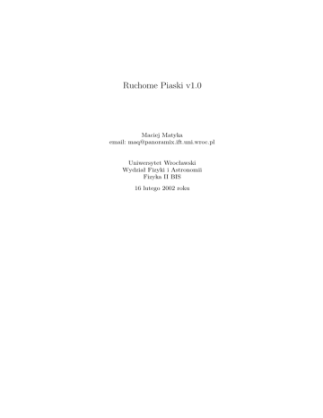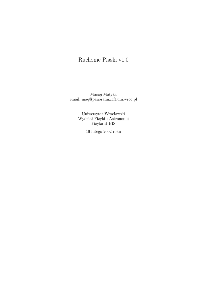 Ruchome Piaski v1.0 Maciej Matyka email: [email protected] Uniwersytet Wrocławski Wydział Fizyki i Astronomii Fizyka II BIS 16 lutego 2002 roku Spis treści 1 Teoria 1.1 Ogólne założenia . . . . . . . . . . . . . 1.2 Pętla czasowa . . . . . . . . . . . . . . . 1.3 Algorytm działania programu ”Ruchome 1.3.1 Fragmenty kodu źródłowego . . . . . . . . . . . . . Piaski”. . . . . . . . . . . . . . . . . . . . . . . . . . . . . . . . . . . . . . . . . . . . . . . . . . . . . . . . . . . . . . . . . . . . . . . . . . . . . . . . . . . . . . . . . . . . . . . . . . 4 4 4 5 6 2 Program ”Ruchome Piaski” 2.1 Wymagania sprzętowe . . . . . 2.2 Kod źródłowy programu . . . . 2.3 Opis programu . . . . . . . . . 2.3.1 Okno główne programu 2.3.2 Obsługa programu . . . . . . . . . . . . . . . . . . . . . . . . . . . . . . . . . . . . . . . . . . . . . . . . . . . . . . . . . . . . . . . . . . . . . . . . . . . . . . . . . . . . . . . . . . . . . . . . . . . . . . . . . . . . . . . . . . . . . . . . . . . 7 7 7 7 7 8 3 Efekty działania 3.1 Piach usypujący się na przeszkodach . . . . . . . . . . . . . . . . . . . . . . . . . . . . . . 3.2 Dowolna konfiguracji brzegów . . . . . . . . . . . . . . . . . . . . . . . . . . . . . . . . . . 3.3 Klepsydra . . . . . . . . . . . . . . . . . . . . . . . . . . . . . . . . . . . . . . . . . . . . . 8 8 9 10 4 Podsumowanie 10 . . . . . . . . . . . . . . . . . . . . . . . . . . . . . . 2 . . . . . . . . . . . . . . . Streszczenie W dokumentacji tej przedstawiam ogólne założenia modelu użytego do symulacji piasku przy użyciu metod stosowanych w symulacjach opartych na automatach komórkowych. Oprócz tego w pracy tej znajduje się opis funkcji programu ”Ruchome Piaski” napisanego na bazie przedstawionych algorytmów. W ostatniej części znajdują się przykłady gotowych symulacji stworzonych opisywanym programem. 3 1 1.1 Teoria Ogólne założenia Wykonanie symulacji piasku wymaga poczynienia kilku założeń co do modelu. Po pierwsze - zakładamy, że piasek składa się z równej wielkości ziaren o jednakowym kształcie, jednakowym ciężarze. Zakładamy, że cała symulacja odbywa się w polu grawitacyjnym, jednakże nie definiujemy przyspieszenia jako takiego - cząstki opadające będą miały stałą prędkość. Już w tym miejscu widać, jak duże uproszczenia stosujemy. Definiujemy przestrzeń zdefiniowaną jako siatka komórek, które mogą przyjąć tylko wartości 0 lub 1 (0 ziarna w komórce nie ma, 1 - ziarno jest). 1.2 Pętla czasowa Pętla czasowa programu jest bardzo prosta i sprowadza się do implementacji ogólnych zasad usypywania się piasku. Zasady te - przedstawione na rysunku (1). Już tu widać jaka jest ogólna idea naszego rozwiązania - pracować będziemy przy pomocy narzędzia 2x2, którego przejście przez całą tablicę spowoduje co najwyżej usypanie każdego z ziaren o jedną jednostkę w dół. Zasady te zawierają też w sobie sytuacje, gdy ziarno piasku usypuje się na boki. Dodatkowo, dla zwiększenia realizmu (pomysł zaczerpnięty z [1]) sytuację z rysunku (2) trochę komplikujemy. Otóż wprowadzamy warunek na opadanie podwójnego ziarna piasku - opadnie ono, ale z pewnym z góry określonym prawdopodobieństwem P . Takie potraktowanie podwójnych ziaren piasku zwiększa realizm symulacji. Rozsądną wydaje się wartość ok. P = 0.5. Rysunek 1: Ogólne zasady ruchu ziaren piasku. 4 Rysunek 2: Dwa zlepione ziarna piasku. 1.3 Algorytm działania programu ”Ruchome Piaski”. Algorytm działania programu przedstawia się nadzwyczaj prosto i taki w zasadzie jest. 67$57 8VWDOZDUXQNLSRF]ąWNRZH EU]HJRZHUR]ZLą]DQLD .URNSDU]\VW\ LPLQ LPD[ 1; MPLQ MPD[ 1< .URNQLHSDU]\VW\ LPLQ LPD[ 1; MPLQ MPD[ 1< 6XO 6XU 6OO 6OU " WDN 6XO 6XU 6OO 6OU ] SUDZGRSRGRELHĔVWZHP QLH QLH WDN ]DVWRVXMUyZQDQLDRSLVXMąFH SRV]F]HJyOQHNRPyUNLURERF]H XOXUOOOUNRSLXMąFZ\QLNQDVLDWNĊQ6 NRSLXMRWU]\PDQHZDUWRĞFLQDVLDWNĊ6 FDáDVLDWND" QLH VWHS VWHS WWPD[" QLH .21,(& Rysunek 3: Algorytm programu ”Ruchome Piaski”. Na rysunku (3) w formie diagramów pokazana jest struktura programu. Podział kroku czasowego na dwa oddzielne (dla kroków nieparzystych i parzystych z osobna) został wprowadzony, bo tego wymaga charakter zagadnienia. Co drugi krok czasowy należy działać komórką roboczą 2x2 wedle zasad z rysunku (1) obniżając startowy punkt o jedną jednostkę w dół. Gdybyśmy bowiem startowali zawsze z tego samego miejsca - żadne ziarno piasku nie opadło by o więcej niż jedną jednostkę w dół! 5 1.3.1 Fragmenty kodu źródłowego Zgodnie z podanym algorytmem zapiszemy teraz kompletną implementację kroku czasowego w języku c. Warto zdefiniować często używane oznaczenia komórek roboczych, by bezpośrednio w pętli czasowej używać zapisanych wcześniej równań, jak pokazujemy poniżej: #define Gul G[i][j] #define Gur G[i+1][j] #define Sul S[i][j] #define Sur S[i+1][j] #define Sll S[i][j-1] #define Slr S[i+1][j-1] Zgodnie z tą definicją krok czasowy przebiegu po całej siatce można zapisać w formie, jak poniżej: // dla kroku czasowego parzystego pętla dla y(NY-1;1) i x(2;NX-1) // dla kroku nieparzystego pętla dla y(NY-2;1) i x(3;NX-1) for(j=NY-1-(step%2);j>1;j-=2) for(i=2+(step%2);i<NX-1;i+=2) // nie wykonujemy operacji na komórkach brzegowych if(!Gul && !Gur) { if(Sul==C_SND && Sur==C_SND && Sll!=C_SND && Slr!=C_SND) { if(rand()/(float)RAND_MAX>0.4) { Sll=Sul; Slr=Sur; Sul=C_EMP; Sur=C_EMP; } } else { nSul nSur nSll nSlr Sul Sur Sll Slr = = = = = = = = Sul*(Gul + (1-Gul)*Sll*(Slr + (1-Slr) * Sur)); Sur*(Gur + (1-Gur)*Slr*(Sll + (1-Sll) * Sul)); Sll+(1-Sll)*(Sul*(1-Gul)+(1-Sul)*Sur*(1-Gur)*Slr); Slr+(1-Slr)*(Sur*(1-Gur)+(1-Sur)*Sul*(1-Gul)*Sll); nSul; nSur; nSll; nSlr; } } // zwiększenie indeksu kroku czasowego step++; 6 2 2.1 Program ”Ruchome Piaski” Wymagania sprzętowe Wymagania sprzętowe programu ”Ruchome Piaski” nie są duże, jednak szybki procesor bardzo dobrze wpływa na jakość symul