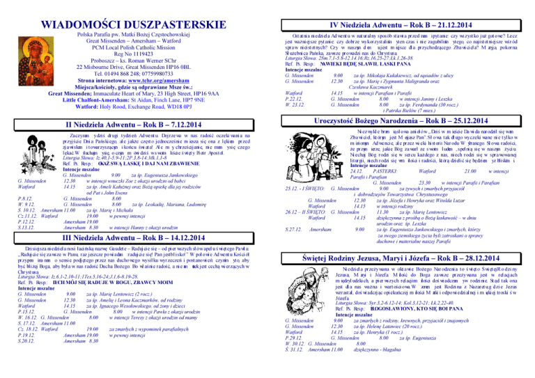 WIADOMOŚCI DUSZPASTERSKIE IV Niedziela Adwentu – Rok B – 21.12.2014 Polska Parafia pw. Matki Bożej Częstochowskiej Great Missenden – Amersham – Watford PCM Local Polish Catholic Mission Reg No 1119423 Proboszcz – ks. Roman Werner SChr 22 Misbourne Drive, Great Missenden HP16 0BL Tel. 01494 868 248; 07759980733 Strona internetowa: www.tchr.org/amersham Miejsca/kościoły, gdzie są odprawiane Msze św.: Great Missenden; Immaculate Heart of Mary, 23 High Street, HP16 9AA Little Chalfont-Amersham: St Aidan, Finch Lane, HP7 9NE Watford: Holy Rood, Exchange Road, WD18 0PJ Ost at ni a ni edzi el a Ad went u w nat ural ny sposób st a wi a pr zed nam i pyt anie: czy ws zyst ko j uż got owe? Lecz jest ważni ejsze pyt ani e: czy dobr ze wykor zyst aliśm yten czas i ni e zagubiliśm ytego, co najist ot ni ejsze wśr ód spra w ni eist ot nych? Czy w naszym d m o u jest m iejsce dl a pr zychodzącego Zba wi ci el a? M aryja, pokor na Sł użebni ca Pańska, za wsze pr owadzi nas do Chr yst usa. Liturgia Słowa: 2Sm.7,1-5.8-12.14.16;Rz.16,25-27;Łk.1,26-38. Ref. Ps. Resp.: NAWIEKI BĘDĘ SŁAWIŁ ŁASKI PANA Intencje mszalne G. Missenden 9.00 za śp. Mikołaja Kułakiewicz, od sąsiadów z ulicy G. Missenden 12.30 za śp. Marię i Zygmunta Maligranda oraz Czesława Kaczmarek Watford 14.15 w intencji Parafian i Parafii P.22.12. G. Missenden 8.00 w intencji Janiny i Leszka W. 23.12. G. Missenden 8.00 za śp. Ferdynanda (30 rocz.) i Patrika Bielów (7 mies.) II Niedziela Adwentu – Rok B – 7.12.2014 Zaczynam y dziś dr ugi t ydzi eń Ad we nt u. Doj rze wa w nas radość oczeki wani a na pr zyjści e Dni a Pański ego, al e jakże częst o jednocześni e m iesza si ę ona z lęki em pr zed zj a wi skam i t owarzyszącym i końcu świ at a! Al e m y, chrześcij ani e, ni e mam ysi ę czego lękać. W słuchajm ysię, o czym m ówi dziś w s woim liści e ś wi ęt y Pi otr Apost oł. Liturgia Słowa: Iz.40,1-5.9-11;2P.3,8-14;Mk.1,1-8 Ref. Ps. Resp.: OKAŻ SWĄ ŁASKĘ I DAJ NAM ZBAWIENIE Intencje mszalne G. Missenden 9.00 za śp. Eugeniusza Jankowskiego G. Missenden 12.30 w intencji wnuczki Zoe z okazji urodzin od babci Watford 14.15 za śp. Ameli Kałużnej oraz Bożą opiekę dla jej rodziców od Pat i John Evens P.8.12. G. Missenden 8.00 W. 9.12. G. Missenden 8.00 za śp. Leokadię, Mariana, Ludomirę S. 10.12. Amersham 11.00 za śp. Marię i Michała Cz.11.12. Watford 19.00 w pewnej intencji P.12.12. Amersham 19.00 S.13.12. Amersham 8.30 w intencji Hanny z okazji urodzin III Niedziela Adwentu – Rok B – 14.12.2014 Dzi si ejsza ni edzi el a nosi łaci ńską nazwę Gaudet e – Raduj ci e si ę – od pi er wszych sł ów apel u ś wi ęt ego Pa wł a: „ Raduj ci e si ę za wsze w Panu, raz jeszcze po wi adam :raduj ci e si ę! Pan jest bl i sko! ” W poł owi e Ad went u Kości ół pr zypom ina nam o sensi e podj ęt ego pr zez nas ducho wego wysił ku wyr zeczeń i post ano wi eń: czynim yt o, aby być bli żej Boga, aby był a w nas radość Ducha Bożego. Bo wł aśni e radość, a ni e sm utek jest cechą wi erzących w Chr yst usa. Liturgia Słowa: Iz.6,1-2.10-11;1Tes.5,16-24;J.1,6-8.19-28. Ref. Ps. Resp.: DUCH MÓJ SIĘ RADUJE W BOGU, ZBAWCY MOIM Intencje mszalne G. Missenden 9.00 za śp. Marię Lentowicz (2 rocz.) G. Missenden 12.30 za śp. Amelię i Leona Kaczmarków, od rodziny Watford 14.15 za śp. Ignacego Wesołowskiego, od żony i dzieci P.15.12. G. Missenden 8.00 w intencji Pawła z okazji urodzin W. 16.12. G. Missenden 8.00 w intencji Teresy z okazji urodzin od mamy S. 17.12. Amersham 11.00 Cz. 18.12. Watford 19.00 za zmarłych z wypominek parafialnych P.19.12. Amersham 19.00 w pewnej intencji S.20.12. Amersham 8.30 Uroczystość Bożego Narodzenia – Rok B – 25.12.2014 Ni ez wykl e br zm ią sł owa ani oł ów „ Dziś w m ieście Da wi da nar odził się wam Zba wi ci el, kt ór ym jest M esjasz Pan”. Sł o wa tak dł ugo wyczeki wane ni e t yl ko w m ini onym Ad wenci e, al e pr zez wi eki hi st orii Nar odu W ybranego. Sł owa radości, że pr zym ierze, jaki e Bóg za warł ze s woim l udem , speł ni ą si ę w naszym życi u. Ni echaj Bóg rodzi si ę w sercu każdego z nas, ni ech rodzi si ę w spra wowa nej lit urgii, ni ech rodzi się wm iłości i radości, kt órą dzi elić się będzi em yz bliskim i. Intencje mszalne 24.12. PASTERKI: Watford 21.00 w intencji Parafii i Parafian G. Missenden 23.30 w intencji Parafii i Parafian 25.12. - I ŚWIĘTO: G. Missenden 9.00 za żywych i zmarłych przyjaciół i dobrodziejów Towarzystwa Chrystusowego G. Missenden 12.30 za śp. Józefa i Henryka oraz Witolda Luzar Watford 14.15 w intencji rodziny 26.12 – II ŚWIĘTO: G. Missenden 11.30 za śp. Marię Lentowicz Watford 14.15 dziękczynna z prośbą o Bożą łaskawość – w dniu urodzin oraz śp. Leszka S.27.12. Amersham 9.00 za śp. Eugeniusza Jankowskiego i zmarłych, którzy za swego ziemskiego życia byli zatroskani o sprawy duchowe i materialne naszej Parafii Świętej Rodziny Jezusa, Maryi i Józefa – Rok B – 28.12.2014 Ni edzi el a pr zeży wana w okt a wi e Bożego Nar odzeni a t o ś wi ęt o Świ ęt ej R o dzi ny Jezusa, M aryi i Józefa. M iłość do Boga za wsze pr zeży wana jest w rel acj ach m iędzyl udzki ch, a pi er wszych rel acjim iłości doś wi adczam yw rodzi ni e. St ąd tak ona jest dl a nas ważna i wart ości owa. W zorem jest Rodzi na z Nazar et u, g d zi e Jezus wzr ast ał, doś wi adczj ąc opi ekuńczej m iłości M atki i odpo wi edzi al nej i m ęski ej troski ś w. Józefa. Liturgia Słowa: Syr.3,2-6.12-14; Kol.3,12-21; Łk.2,22-40. Ref. Ps. Resp.: BŁOGOSŁAWIONY, KTO SIĘ BOI PANA Intencje mszalne G. Missenden 9.00 za zmarłych z rodziny, krewnych, przyjaciół i znajomych G. Missenden 12.30 za śp. Helenę Latawiec (20 rocz.) Watford 14.15 za śp. Henryka (1 rocz.) P.29.12. G. Missenden 8.00 za śp. Eugeniusza W. 30.12. G. Missenden 8.00 Ś. 31.12. Amersham 11.00 dziękczynno - błagalna Uroczystość