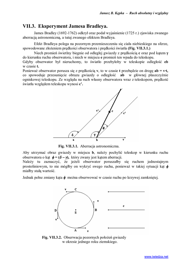 Janusz B. Kępka – Ruch absolutny i względny VII.3. Eksperyment Jamesa Bradleya. James Bradley (1692-1762) odkrył oraz podał wyjaśnienie (1725 r.) zjawiska zwanego aberracją astronomiczną, a tutaj zwanego efektem Bradleya. Efekt Bradleya polega na pozornym przemieszczeniu się ciała niebieskiego na sferze, spowodowane złożeniem prędkości obserwatora i prędkości światła (Fig. VII.3.1.) Niech promień świetlny biegnie od odległej gwiazdy z prędkością c oraz pod kątem g do kierunku ruchu obserwatora, i niech w miejscu e promień ten wpada do teleskopu. Gdyby obserwator był nieruchomy, to światło przebyłoby w teleskopie odległość eb w czasie t. Ponieważ obserwator porusza się z prędkością v, to w czasie t przebędzie on drogę ab = v·t, co spowoduje przesunięcie obrazu gwiazdy o odległość ab w głównej płaszczyźnie ogniskowej teleskopu. Ze względu na ruch własny obserwatora wraz z teleskopem, prędkość światła względem teleskopu wynosi c’. Fig. VII.3.1. Aberracja astronomiczna. Aby utrzymać obraz gwiazdy w miejscu b, należy pochylić teleskop w kierunku ruchu obserwatora o kąt f = (d - g), który zwany jest kątem aberracji. Należy tu zaznaczyć, że jeżeli obserwator poruszałby się ruchem jednostajnym prostoliniowym, to nie mógłby on wykryć swego ruchu, ponieważ w takiej sytuacji kąt f miałby stałą wartość. Jednak pełne zmiany kąta f można obserwować w czasie ruchu po krzywej zamkniętej. Fig. VII.3.2. Obserwacja pozornych położeń gwiazdy w okresie jednego roku ziemskiego. www.iwiedza.net Janusz B. Kępka – Ruch absolutny i względny Na rys. VII.3.2. przedstawiony jest schemat obserwacji położeń gwiazdy g-Draconis, wykonanych przez J. Bradleya. Przyjmuje się, że ze względu na ogromną odległość gwiazdy od naszego układu słonecznego, dobiegające światło tworzy wiązkę promieni równoległych z dostateczną dokładnością. Niech Ziemia znajduje się w miejscu A na orbicie i porusza się dokładnie naprzeciwko biegu promieni świetlnych. W miejscu A teleskop nachylony jest pod kątem d do płaszczyzny ekliptyki (Fig. VII.3.1.). Aby utrzymać obraz gwiazdy w tym samym miejscu pola widzenia w teleskopie w miarę przemieszczania się z miejsca A do miejsca B na orbicie, należy stopniowo obracać teleskop jednocześnie w dół (prędkość Ziemi na wprost gwiazdy maleje) i w lewo, i.e. w kierunku ruchu Ziemi na orbicie (prędkość Ziemi równolegle do gwiazdy rośnie). W miejscu B teleskop nachylony jest do płaszczyzny ekliptyki pod kątem g = d + f,’, i jednocześnie skręcony w płaszczyźnie ekliptyki o kąt f w kierunku ruchu Ziemi. W astronomicznym układzie współrzędnych ekliptycznych, położenie ciała niebieskiego na sferze określone jest przez podanie szerokości astronomicznej b, a także długości astronomicznej l , liczonej od punktu równonocy wiosennej. Przyjmując, że prawdziwe położenie gwiazdy jest (b, l), aberracji, obserwowane położenia gwiazdy są w miejscach: to ze względu na zjawisko A - (b - f’), l; C - (b + f’), l; B - b, (l + f); D - b, (l - f). Bardziej szczegółowa analiza zjawiska pokazuje, że dla 0o < b < 90o gwiazda zakreśla krzywą zamkniętą, bardzo podobną do elipsy, której połowa małej osi prostopadłej do ekliptyki jest maksymalną wartością kąta f’, a która z kolei zależy od szerokości astronomicznej b. Połowa wielkiej osi równoległej do ekliptyki, wyznacza maksymalną wartość kąta f = fa i jest jednakowa dla wszystkich gwiazd: fa = 20,4958’’. Stała wartość aberracji rocznej dla wszystkich gwiazd zwana jest aberratio fixarum. Dla b = 90o, i.e. dla bieguna ekliptycznego, gwiazda zakreśla małe koło o promieniu równym stałej aberracji fa . Dla b = 0o gwiazda leży w płaszczyźnie ekliptyki i oscyluje względem średniego położenia. Z powyższego widać, że obserwowany, pozorny ruch gwiazdy na sferze, a wynikający ze zjawiska aberracji, jest odzwierciedleniem ruchu Ziemi po orbicie widzianej od strony gwiazdy pod różnymi kątami b we współrzędnych ekliptycznych. Znając z obserwacji wartość stałej aberracji rocznej fa dla gwiazd, w roku 1729 James Bradley obliczył wartość prędkości światła, która według jego pomiarów wynosiła: c = 304 000 km/s. Wartość c została obliczona ze wzoru: sin f a = v sin d c zwanego wzorem na aberrację światła. Wartość prędkości v Ziemi przyjęto z innych pomiarów. Obecnie, wartość prędkości c światła znana jest z bardzo dużą dokładnością. www.iwiedza.net Janusz B. Kępka – Ruch absolutny i względny Z tego względu, powyższy wzór wykorzystywany jest do obliczania średniej wartości prędkości orbitalnej Ziemi wokół Słońca: vf = 29,789 km/s . Wartość powyższą można więc uznać jako stałą wartość prędkości Ziemi wokół Słońca absolutnie nieruchomego w Kosmosie. W 1748 r. James Bradley odkrył zmiany położenia (kierunku) osi ziemskiej względem płaszczyzny ekliptyki, co zwane jest nutacją. Zmiany te powtarzają się co 19 lat. Ponadto, oś ziemska zatacza stożek. Jeden taki obrót trwa ok. 26 000 lat, i jest to tzw. rok Platona. Na zakończenie warto tu zauważyć, że teoria heliocentryczna Arystarcha z Samos oraz system heliocentryczny Mikołaja Kopernika z Torunia są teoretycznymi założeniami ruchu Ziemi względem (wokół) nieruchomego w Kosmosie Słońca. Są to rozważania – nie ujmując ich wartości i znaczenia – w rodzaju: „co by było, gdyby…” Natomiast James Bradley udowodnił eksperymentalnie, że właśnie Ziemia krąży wokół Słońca, a nie odwrotnie. www.iwiedza.net