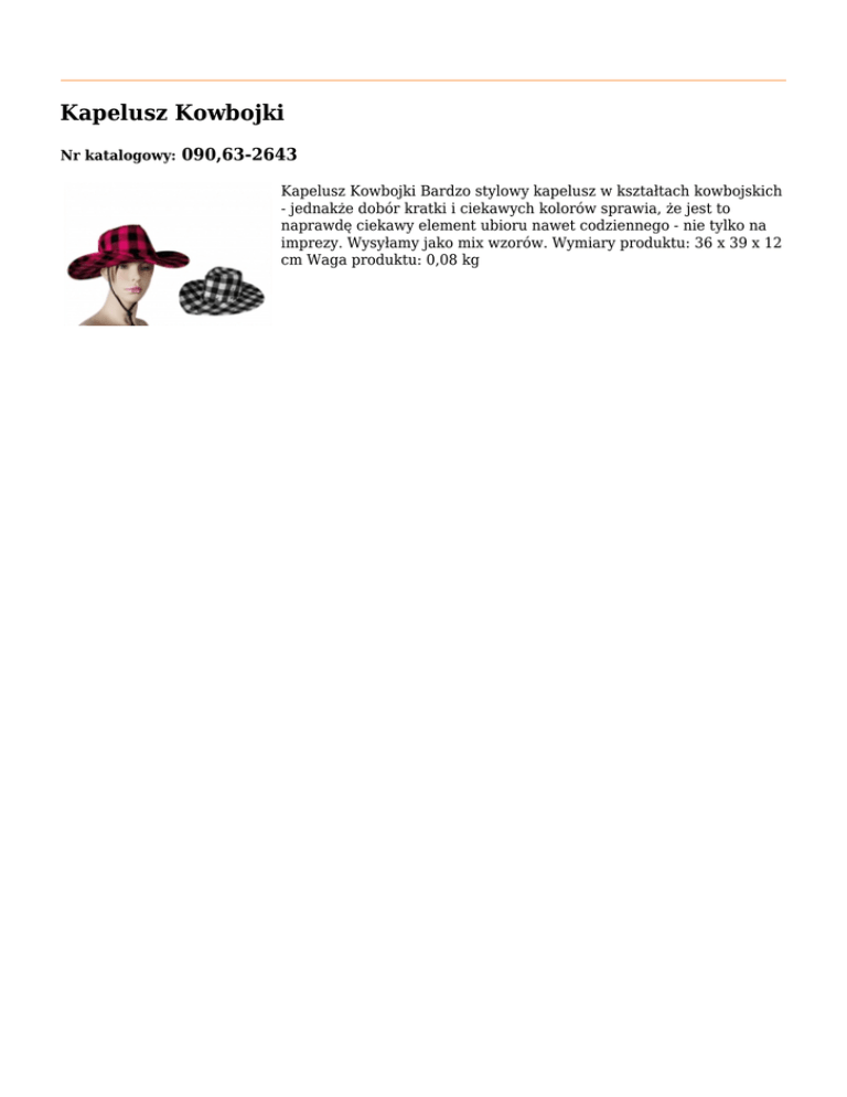 Kapelusz Kowbojki Nr katalogowy: 090,63-2643 Kapelusz Kowbojki Bardzo stylowy kapelusz w kształtach kowbojskich - jednakże dobór kratki i ciekawych kolorów sprawia, że jest to naprawdę ciekawy element ubioru nawet codziennego - nie tylko na imprezy. Wysyłamy jako mix wzorów. Wymiary produktu: 36 x 39 x 12 cm Waga produktu: 0,08 kg
