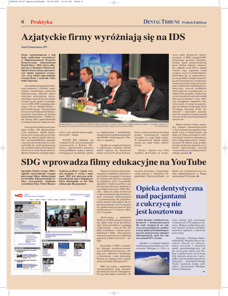 DTP0109_04-07_Opinie_Praktyka 6 16.02.2009 11:32 Uhr Seite 6 DENTAL TRIBUNE Praktyka Polish Edition Azjatyckie firmy wyróżniają się na IDS Daniel Zimmermann, DTI wym rynku dostawców dentystycznych – w 2008 r. osiągnęły 80% światowego poziomu sprzedaży. Ostatni raport przeprowadzony przez Global Industry Analysts, Inc. zakłada, że do 2015 r. ogólna wartość tego segmentu rynku zwiększy się do 21,8 mld dolarów. Przewiduje się, że zapotrzebowanie na produkty i usługi stomatologiczne pozostanie na wysokim poziomie z powodu rosnących wymagań w dziedzinie stomatologii kosmetycznej, nowych produktów wpływających na polepszenie samopoczucia pacjenta, zwiększającej się świadomości prozdrowotnej oraz powszechności i coraz większej dostępności implantów dentystycznych. Z uwagi na pojawiające się zabiegi i technologie, które wymagają mniejszej liczby dostawców i materiałów, możemy mieć do czynienia z ograniczeniem wzrostu liczby konwencjonalnych dostawców. Firmy stomatologiczne z Azji będą najliczniej uczestniczyć w Międzynarodowej Wystawie Dentystycznej (International Dental Show – IDS), która odbędzie się w w Kolonii w Niemczech. Oprócz Korei, którą reprezentować będzie najwięcej wystawców, swój udział zapowiedziały również firmy z Australii, Chin, Indii i Tajwanu. Na ostatniej europejskiej konferencji prasowej w Kolonii, reprezentanci niemieckiego przemysłu dentystycznego odrzucili obawy dotyczące spowolnienia ekonomicznego z powodu kryzysu finansowego. Są oni zgodni, że perspektywy na IDS 2009 wyglądają obiecująco. Wg dr. Martina Rickert – przewodniczącego Niemieckiego Towarzystwa Producentów Dentystycznych (Association of German Dental Manufacturers – VDDI), nadal istnieje duże zapotrzebowanie na usługi medyczne i dentystyczne. Przemysł ten jednak może podlegać krótko- lub długoterminowym wahaniom. „Rynek dentystyczny jest ważną częścią rozwijającego się sektora opieki zdrowotnej” – powiedział Ricket. „Zgodnie z naszym doświadczeniem z ostatnich kilku lat, nadal spodziewamy się, że ludzie intensywniej będą inwestować w swoje własne zdrowie. Sprawy finansowe nie będą odgry- Dr Martin Rickert – przewodniczacy VDDI, dr Markus Heibach – dyrektor wykonawczy VDDI oraz Oliver P. Kuhrt – wiceprezes wykonawczy Koelnmesse (od strony prawej do lewej) na europejskiej konferencji prasowej w grudniu 2008 r. Fot.: Koelnmesse wały w tym zakresie pierwszoplanowej roli” – dodał. XXXIII IDS odbędzie się w dniach 24-28. marca na terenach wystawowych w Kolonii. Wystawcy zapowiedzieli premiery wielu produktów i usług z zakresu rozwijających się dziedzin, jakimi są implantologia i profilaktyka, a organizatorzy spodziewają się ponad 80.000 zwiedzających z Niemiec i z zagranicy. Zgodnie ze wstępnymi danymi, w tegorocznej wystawie weźmie udział większa niż dotychczas liczba wystawców spoza Niemiec. Nowy system nawigacji powinien pomóc zwiedzającym znaleźć wszystko to, czego będą szukać. W internetowym sklepie targów można już kupić bilety elektroniczne. Niemcy, Japonia oraz USA wspólnie przewodzą na świato- Mimo istnienia różnic pomiędzy rynkami stomatologicznymi w Azji, dynamiczna poprawa standardu życia w krajach takich, jak Indie czy Chiny powoduje w ostatnich latach wzrost świadomości jakości usług medycznych i dentystycznych. W efekcie, kraje te odnotowują zwiększone potrzeby w zakresie wprowadzania nowych i coraz bardziej wyszukanych technologii i sprzętu. DT SDG wprowadza filmy edukacyjne na YouTube Specialist Dental Group (SDG) ogłosiła wprowadzenie swojego pierwszego filmu edukacyjnego na YouTube. Film prezentuje zabieg wszczepiania implantu szwedzkiej firmy Nobel Biocare Teeth-in-an-Hour i będzie również dostępny w wersji z napisami. SDG jest pierwszą praktyką dentystyczną w Singapurze, która udostępniła on line film edukacyjny dla pacjentów. W przeciwieństwie do konwencjonalnych implantów dentystycznych, które wymagają 4-6 miesięcy do zakończenia procesu wgajania się implantu w kość, w przypadku implantów Teeth-in-an-Hour czas ten znacznie skrócono. Implanty te są produkowane przez Nobel Biocare – lidera na rynku światowym w zakresie innowacyjnych estetycznych rozwiązań dentystycznych i są przeznaczone dla pacjentów, którzy utracili wiele zębów. Jak zapewnia producent, czas wymagany od zaplanowania leczenia do jego zakończenia to 2-3 wizyty w okresie 2-3 tygodni. „Korzystając z implantów Teeth-in-an-Hour, pacjent czuje się tak, jakby miał swoje prawdziwe zęby, które prawidłowo wyglądają i funkcjonują” - mówi dr Neo Tee Khin, konsultant z zakresu periodontologii w SDG. „Nasi pacjenci odnoszą z tego korzyści i naprawdę poprawia to jakość ich życia” – dodaje. Konsultant w SDG w dziedzinie chirurgii szczękowo-twarzowej, dr Ho Kok Sen zauważa: „Zabieg jest całkowicie bezbolesny, a krwawienie i uraz minimalne. Pacjent po zabiegu może natychmiast normalnie funkcjonować”. SDG jest jedną z najbardziej wszechstronnych grup specjalistów dentystycznych w Singapurze. W tym roku będzie obchodzić 30. rocznicę powstania, wzmacniając swoją pozycję w dziedzinie implantologii. Założyciel kliniki – dr Henry Lee wykonał pierwszy zabieg implantologiczny w Singapurze ponad 20 lat temu. DT Opieka dentystyczna nad pacjantami z cukrzycą nie jest kosztowna Całość kosztów świadczeń medycznych i farmaceutycznych dla osób cierpiących na cukrzycę, korzystających z podstawowej opieki periodontologicznej, bez zastosowania zabiegów chirurgicznych, może być niższa o ponad 10% rocznie. Zgodnie z wynikami badania wykonanego przez badaczy z Uniwersytetu Michigan w USA, te same zabiegi były powiązane w mniejszym o 19% stopniu z cukrzycą. Badacze podkreślają przy tym ważność związku pomiędzy zdrowiem ogólnym a zdrowiem jamy ustnej. „Pracując z Michigan Blues, znaleźliśmy 
