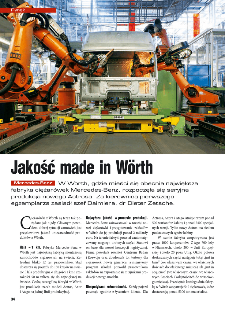 Rynek Jakość made in Wörth Mercedes-Benz W Wörth, gdzie mieści się obecnie największa fabryka ciężarówek Mercedes-Benz, rozpoczęła się seryjna produkcja nowego Actrosa. Za kierownicą pierwszego egzemplarza zasiadł szef Daimlera, dr Dieter Zetsche. C iężarówki z Wörth są teraz tak pożądane jak nigdy. Głównym powodem dobrej sytuacji zamówień jest przysłowiowa jakość i niezawodność produktów z Wörth. Hala – 1 km. Fabryka Mercedes-Benz w Wörth jest największą fabryką montażową samochodów ciężarowych na świecie. Zatrudnia blisko 12 tys. pracowników. Stąd dostarcza się pojazdy do 150 krajów na świecie. Hala produkcyjna o długości 1 km i szerokości 50 m zalicza się do największej na świecie. Cechą szczególną fabryki w Wörth jest produkcja trzech modeli Actros, Axor i Atego na jednej linii produkcyjnej. 34 Najwyższa jakość w procesie produkcji. Mercedes-Benz zainwestował w rozwój nowej ciężarówki i przygotowanie zakładów w Wörth do jej produkcji ponad 2 miliardy euro. Na terenie fabryki powstał zautomatyzowany magazyn drobnych części. Stanowi on bazę dla nowej koncepcji logistycznej. Firma powołała również Centrum Badań i Rozwoju oraz zbudowała tor testowy dla ciężarówek nowej generacji, a intensywny program szkoleń pozwolił pracownikom zakładów na zapoznanie się z tajnikami produkcji nowego modelu. Niespotykana różnorodność. Każdy pojazd powstaje zgodnie z życzeniem klienta. Dla Actrosa, Axora i Atego istnieje razem ponad 500 wariantów kabiny i ponad 2400 specjalnych wersji. Tylko nowy Actros ma siedem podstawowych typów kabiny. W sumie fabryka zaopatrywana jest przez 1000 kooperantów. Z tego 700 leży w Niemczech, około 200 w Unii Europejskiej i około 20 poza Unią. Około połowa dostarczanych części następuje tutaj „just in time” (we właściwym czasie, we właściwych ilościach do właściwego miejsca) lub „just in sequence” (we właściwym czasie, we właściwych ilościach i kolejnościach do właściwego miejsca). Przeciętnie każdego dnia fabrykę w Wörth zaopatruje 540 ciężarówek, które dostarczają ponad 5300 ton materiałów. Przykładowo dostawa siedzeń do nowego Actrosa następuje „just in sequence”. Z naczep za pomocą techniki transportu bliskiego z prowadnicą rolkową są one dostarczane we właściwej kolejności bezpośrednio na taśmy. Błędy w zabudowie czy kolejności są wykluczone w 100 procentach przez zarządzanie numeryczne. Bezpieczeństwo procesów dla czołowych produktów. Jakość musi być zaplanowana, zaprojektowana, wyprodukowana i nadzorowana. Ważnym założeniem są przy tym certyfikacje fabryki Wörth według norm DIN i ISO, które powtarzane są w regularnych odstępach czasowych. Nowinki w produkcji kabiny. Zanim kabina przyjmie swoją ostateczną postać, w różnych centrach produkowane są poszczególne komponenty jak podłoga, dach, pokrycia boczne i struktury szkieletowe. Transport tych części do poszczególnych centrów przebiega w pełni automatycznie, z pomocą systemów transportowych sterowanych indukcyjnie, bez kierowcy. Sprawdzanie przed procesem spawania czy wszystkie części są kompletne i prawidłowo ułożone następuje maszynowo w tzw. check stacjach. Kolejnym highlightem, nowinką, jest tzw. technika pomiaru in-line. Dzięki niej poprzez sterowane robotem sensory pomiarowe we wszystkich kabinach wychwytywane są zdefiniowane, zgodne z przypisaną funkcją cechy, tak żeby umożliwić wyraźne kontrole procesów. Technicy pomiarowi sprawdzają, czy wartości spełniają ostre kryteria tolerancji i czy poszczególne cechy charakterystycznych procesów jak trendy, skoki czy przesunięcia wartości średnich są do zaobserwowania. Jeśli tak się stanie, podejmują natychmiastowe reakcje, żeby uniknąć poprawek. Automatyzacja w lakierze. Inwestycje ponad 100 milionów euro od roku 2005 zapewniają przysłowiową jakość nowego Mercedes-Benz Actros także pod względem lakierowania. Bazą dla długotrwałej ochrony nowego Actrosa przed korozją są do 100 procent cynkowane blachy karoserii. W lakierowni po kilkustopniowym czyszczeniu i odtłuszczaniu jako pierwsze następuje gruntowanie kabiny KTL (katodowe malowanie zanurzeniowe). Dla kabiny do dyspozycji jest prawie 400 różnych kolorów, dla podwozia 160. Do tego części z tworzywa sztucznego są lakierowane w kolorze pojazdu. Nowe centrum elektryki i elektroniki. Dzięki centrum elektryki i elektroniki (E/E-Center) stworzono w fabryce w Wörth nową organizacyjną jednostkę, która znajduje się w codziennym kontakcie z obszarem rozwojowym. W sumie 200 pracowników zostało solidnie przeszkolonych odnośnie nowego świata systemowego Actrosa. Do tego dochodzą nowe programy sprawdzające i stanowiska, które nowy Actros musi przejść po zakoń- zbudował na ponad 6600 m² zautomatyzowany magazyn drobnych części (AKL). AKL tworzy podstawę dla nowego konceptu logistycznego, jaki Mercedes-Benz wciela w życie – elastyczna produkcja nowego Actrosa wraz z innymi aktualnymi seriami produkcyjnymi na tych samych taśmach montażowych. Ponadto ma to wpływ na znaczne polepszenia w dostępności części i jednoczesne zabezpieczenie procesów produkcji. Nowe centrum testowe. Dzięki centrum rozwoju i testów (EVZ) powstało w Wörth specjalne centrum testowe dla nowych ge- Za kierownicą pierwszego egzemplarza zasiadł szef Daimlera, dr Dieter Zetsche czeniu produkcji. Po napełnieniu paliwem wszystkie funkcje jezdne razem z systemami asystenckimi są sprawdzane w procesie kontrolnym na stanowisku rolkowym. Informacje kontrolne są dokumentowane w check liście, zapisywane i przechowywane do 20 lat. Dodatkowo codziennie pojazdy odbywają jazdy próbne w realnym ruchu drogowym na odcinku 50 km, także przy złych warunkach drogowych. Zautomatyzowany magazyn. Za 26 mln euro Daimler w minionych 18 miesiącach neracji ciężarówek. Ma ono na celu zapewnienie najl
