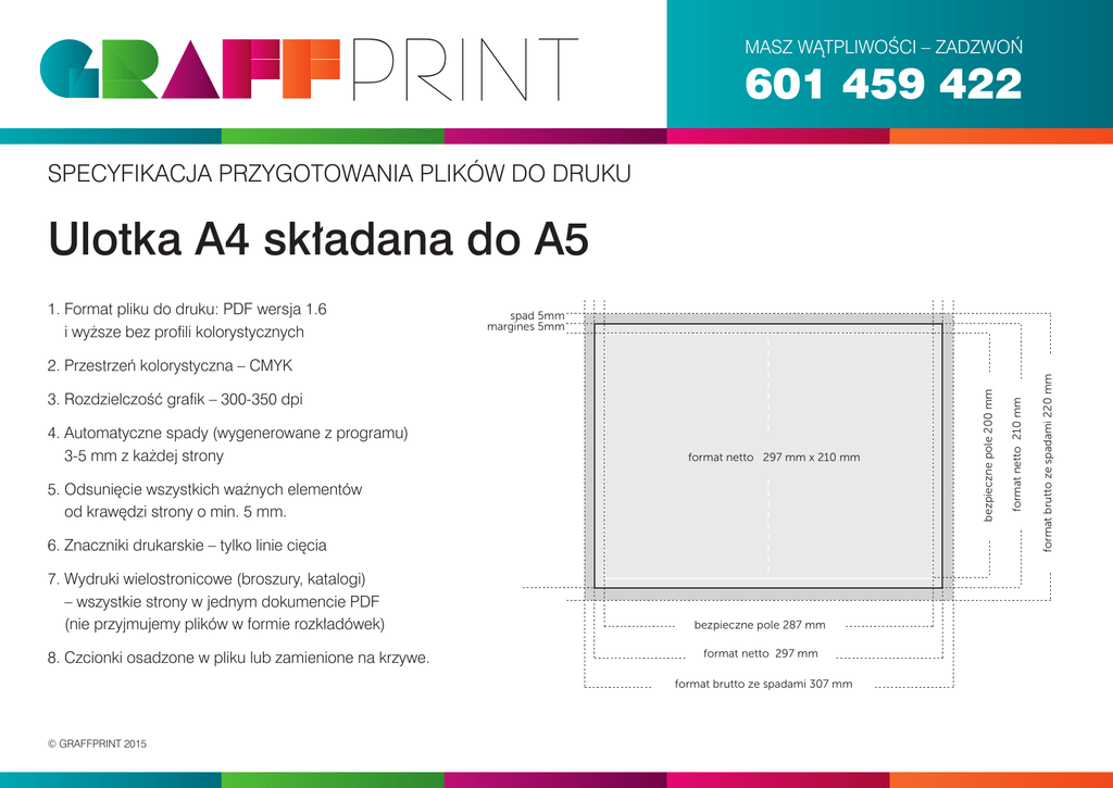 PRINT MASZ WĄTPLIWOŚCI – ZADZWOŃ 601 459 422 SPECYFIKACJA PRZYGOTOWANIA PLIKÓW DO DRUKU Ulotka A4 składana do A5 spad 5mm margines 5mm 4. Automatyczne spady (wygenerowane z programu) 3-5 mm z każdej strony format netto 297 mm x 210 mm 5. Odsunięcie wszystkich ważnych elementów od krawędzi strony o min. 5 mm. 6. Znaczniki drukarskie – tylko linie cięcia 7. Wydruki wielostronicowe (broszury, katalogi) – wszystkie strony w jednym dokumencie PDF (nie przyjmujemy plików w formie rozkładówek) 8. Czcionki osadzone w pliku lub zamienione na krzywe. bezpieczne pole 287 mm format netto 297 mm format brutto ze spadami 307 mm © GRAFFPRINT 2015 format netto 210 mm 3. Rozdzielczość grafik – 300-350 dpi bezpieczne pole 200 mm 2. Przestrzeń kolorystyczna – CMYK format brutto ze spadami 220 mm 1. Format pliku do druku: PDF wersja 1.6 i wyższe bez profili kolorystycznych