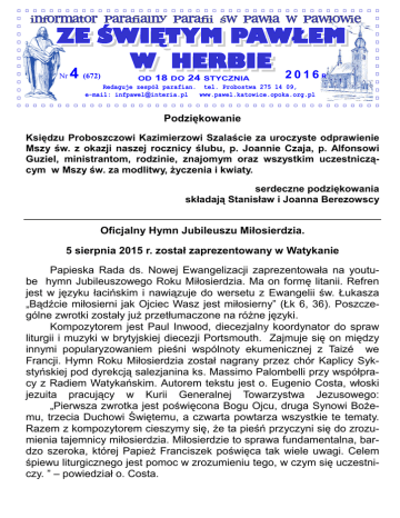 Nr 4 (672) 2016 R. OD 18 DO 24 STYCZNIA Redaguje zespół parafian. tel. Probostwa 275 14 09, www.pawel.katowice.opoka.org.pl e-mail: [email protected] Podziękowanie Księdzu Proboszczowi Kazimierzowi Szalaście za uroczyste odprawienie Mszy św. z okazji naszej rocznicy ślubu, p. Joannie Czaja, p. Alfonsowi Guziel, ministrantom, rodzinie, znajomym oraz wszystkim uczestniczącym w Mszy św. za modlitwy, życzenia i kwiaty. serdeczne podziękowania składają Stanisław i Joanna Berezowscy Oficjalny Hymn Jubileuszu Miłosierdzia. 5 sierpnia 2015 r. został zaprezentowany w Watykanie Papieska Rada ds. Nowej Ewangelizacji zaprezentowała na youtube hymn Jubileuszowego Roku Miłosierdzia. Ma on formę litanii. Refren jest w języku łacińskim i nawiązuje do wersetu z Ewangelii św. Łukasza „Bądźcie miłosierni jak Ojciec Wasz jest miłosierny” (Łk 6, 36). Poszczególne zwrotki zostały już przetłumaczone na różne języki. Kompozytorem jest Paul Inwood, diecezjalny koordynator do spraw liturgii i muzyki w brytyjskiej diecezji Portsmouth. Zajmuje się on między innymi popularyzowaniem pieśni wspólnoty ekumenicznej z Taizé we Francji. Hymn Roku Miłosierdzia został nagrany przez chór Kaplicy Sykstyńskiej pod dyrekcją salezjanina ks. Massimo Palombelli przy współpracy z Radiem Watykańskim. Autorem tekstu jest o. Eugenio Costa, włoski jezuita pracujący w Kurii Generalnej Towarzystwa Jezusowego: „Pierwsza zwrotka jest poświęcona Bogu Ojcu, druga Synowi Bożemu, trzecia Duchowi Świętemu, a czwarta powtarza wszystkie te tematy. Razem z kompozytorem cieszymy się, że ta pieśń przyczyni się do zrozumienia tajemnicy miłosierdzia. Miłosierdzie to sprawa fundamentalna, bardzo szeroka, której Papież Franciszek poświęca tak wiele uwagi. Celem śpiewu liturgicznego jest pomoc w zrozumieniu tego, w czym się uczestniczy. ” – powiedział o. Costa. ORYGINALNY TEKST HYMNU Wersja polska Miłosierni jak Ojciec (refren) Dziękujmy Ojcu ponieważ jest dobry Stworzył świat mądrze Prowadzi swój lud przez historię Przebacza swoim dzieciom i je przyjmuje Wersja łacińska Misericordes sicut Pater! (x4) 1. Rendiamo grazie al Padre, perché è buono, in aeternum misericordia eius ha creato il mondo con sapienza in aeternum misericordia eius conduce il Suo popolo nella storia in aeternum misericordia eius perdona e accoglie i Suoi figli in aeternum misericordia eius Dziękujemy Synowi, światłu ludów Ukochał nas sercem z ciała Od Niego otrzymujemy i Jemu dajemy Misericordes sicut Pater! (x4) Serce się otwiera na głodnych 2. Rendiamo grazie al Figlio, luce delle i spragnionych Prosimy Ducha o siedem świętych darów Źródło każdego dobra, najsłodsze orzeźwienie Przez Niego wzmocnieni, my sami wzmacniamy Miłość ma nadzieję i wszystko znosi Prosimy o pokój Boga wszelkiego pokoju Ziemia oczekuje Ewangelii o Królestwie Łaska i radość tym, którzy kochają i przebaczają Nadejdą nowe niebo i ziemia (przetłumaczył Jacek Siepsiak SJ) genti, in aeternum misericordia eius ci ha amati con un cuore di carne in aeternum misericordia eius da Lui riceviamo, a Lui ci doniamo in aeternum misericordia eius il cuore si apra a chi ha fame e sete in aeternum misericordia eius Misericordes sicut Pater! (x4) 3. Chiediamo allo Spirito i sette santi doni, in aeternum misericordia eius fonte di ogni bene, dolcissimo sollievo in aeternum misericordia eius da Lui confortati, offriamo conforto in aeternum misericordia eius l’amore spera e tutto sopporta in aeternum misericordia eius Misericordes sicut Pater! (x4) 4. Chiediamo la pace al Dio di ogni pace in aeternum misericordia eius la terra aspetta il vangelo del Regno in aeternum misericordia eius grazia e gioia a chi ama e perdona in aeternum misericordia eius saranno nuovi i cieli e la terra in aeternum misericordia eius OGŁOSZENIA DUSZPASTERSKIE ● Zapraszam dzisiaj o godz. 1600 na nieszpory kolędowe z udziałem chóru „Lutnia” oraz na Jasełka w wykonaniu dzieci szkolnych. ● W środę o godz. 800 Msza św. szkolna. ● W czwartek Adoracja Przenajświętszego Sakramentu o godz. 1730. ● 21 stycznia w czwartek obchodzić będziemy Dzień Babci, w piątek 22 stycznia Dzień Dziadka. Pamiętajmy o nich w naszych modlitwach. ● W tym tygodniu modlimy się o Jedność Chrześcijan. Włączmy tę intencję do naszych modlitw. ● Okazja do Spowiedzi Świętej przed każdą Mszą św. ● 6 lutego odbędzie się XVII Bal Charytatywny organizowany przez Zespół Caritas naszej parafii. Zwracamy się z serdeczną prośbą do parafian o dary na odbywającą się w trakcie balu loterię fantową. Dostarczać je można do Kancelarii Parafialnej, Zakrystii lub członkiniom Zespołu Charytatywnego. ● W przyszłą niedzielę odbędzie się doroczna adoracja Apostolstwa Chorych przy żłóbku w Panewnikach o godz. 1400. ● Dodatkowa kolęda rozpocznie się w niedzielę 23 stycznia o godz. 1300. Zgłoszenia przyjmowane są w zakrystii. ● W dzisiejszym „Gościu Niedzielnym”: - Kto otrzyma, a kto nie otrzyma 500 złotych na dziecko? Jakie są faktyczne założenia projektu 500+ oraz jaki jest podstawowy cel programu? Ponadto w Gościu - Bóg jest czuły i „gotowy przyjąć każdego, kto pragnie wykonać choć jeden krok w stronę domu”. O najnowszym wywiadzie papieża Franciszka, który prostym językiem mówi o miłosierdziu Boga; - dlaczego Żydzi ciągle płaczą pod ścianą nieistniejącej od prawie dwóch tysięcy lat świątyni jerozolimskiej? ● Kolekta w przyszłą niedzielę przeznaczona będzie na potrzeby parafii. Bóg zapłać za dzisiejsze ofiary. INTENCJE MSZY św. od 18 do 24 stycznia 2016 r. 18 I g. 1800 Poniedziałek -Za + Antoniego Niesporek jako 30-dniowa g. 1800 - Za + Floriana Jaskółka jako 30-dniowa g. 800 Msza św. szkolna - Za ++ Krzysztofa Tomczyk, Elżbietę Rolnik, rodziców Widera, Tomczyk, pokrewieństwo z obu stron oraz dusze w czyśćcu cierpiące g. 1730 g. 1800 Adoracja Najś