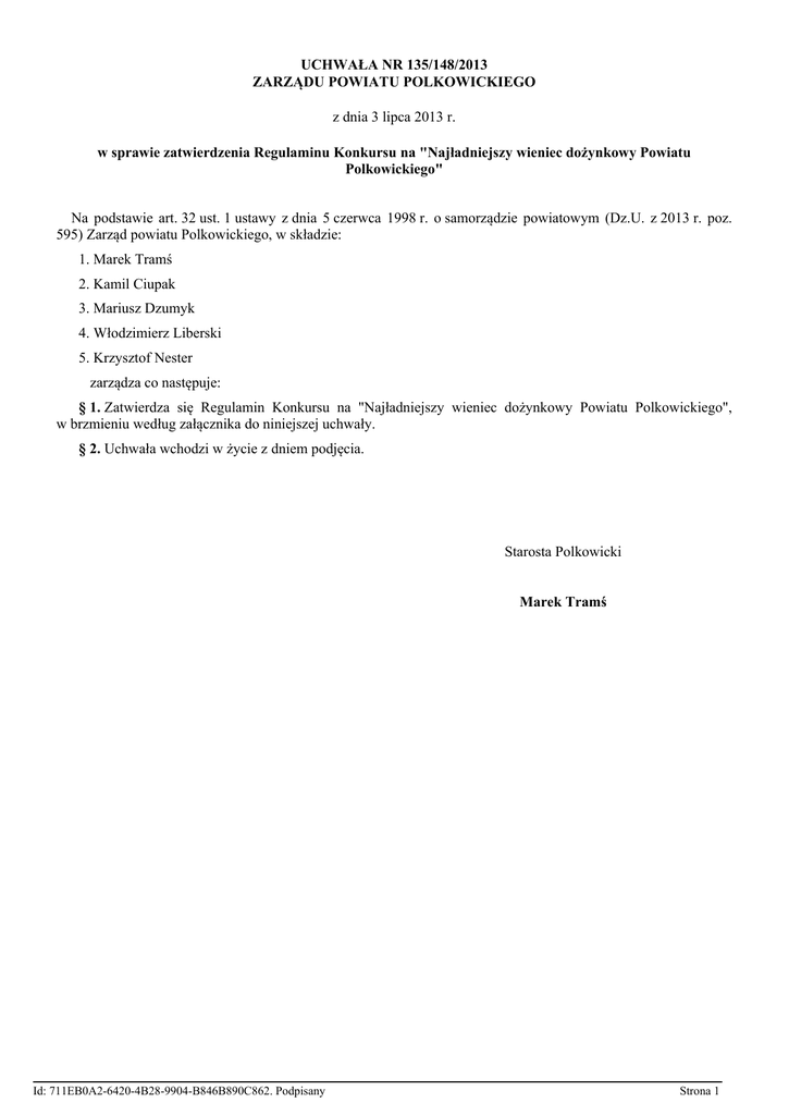 UCHWAŁA NR 135/148/2013 ZARZĄDU POWIATU POLKOWICKIEGO z dnia 3 lipca 2013 r. w sprawie zatwierdzenia Regulaminu Konkursu na "Najładniejszy wieniec dożynkowy Powiatu Polkowickiego" Na podstawie art. 32 ust. 1 ustawy z dnia 5 czerwca 1998 r. o samorządzie powiatowym (Dz.U. z 2013 r. poz. 595) Zarząd powiatu Polkowickiego, w składzie: 1. Marek Tramś 2. Kamil Ciupak 3. Mariusz Dzumyk 4. Włodzimierz Liberski 5. Krzysztof Nester zarządza co następuje: § 1. Zatwierdza się Regulamin Konkursu na "Najładniejszy wieniec dożynkowy Powiatu Polkowickiego", w brzmieniu według załącznika do niniejszej uchwały. § 2. Uchwała wchodzi w życie z dniem podjęcia. Starosta Polkowicki Marek Tramś Id: 711EB0A2-6420-4B28-9904-B846B890C862. Podpisany Strona 1 Załącznik do Uchwały Nr 135/148/2013 Zarządu Powiatu Polkowickiego Z dnia 03 lipca 2013 r. REGULAMIN KONKURSU NA „NAJŁADNIEJSZY WIENIEC DOŻYNKOWY POWIATU POLKOWICKIEGO” Miejsce Konkursu Gmina –Organizator dożynek Termin Konkursu Pierwsza niedziela września Cel konkursu 1. Kultywowanie oraz popularyzacja kulturowych tradycji regionalnych oraz najciekawszych dziedzin plastyki ludowej. 2. Prezentacja bogactwa plonów wkomponowanych w wieniec dożynkowy. 3. Promocja dorobku kulturowego polskiej wsi. 4. Popularyzacja twórczości ludowej. 5. Pozyskiwanie przez organizatora Konkursu prac o wysokich walorach artystycznych i etnograficznych. Zakres przedmiotowy Na Konkurs należy wykonać wieniec dożynkowy, który formą i użytym materiałem nawiązuje do tradycji wieńców dożynkowych, występujących na terenie Polski. Wszystkie zgłoszone wieńce uczestniczyć będą w korowodzie dożynkowym i zostaną ustawione przed sceną główną podczas trwania uroczystości dożynkowych. Komisja konkursowa Organizator powołuje Komisję Konkursową. Skład Komisji jest jawny i podany podczas uroczystości dożynkowych. Komisja składa się z maksymalnie 5 członków. Pracami Komisji kieruje Przewodniczący wskazany przez Starostę Polkowickiego. Z prac Komisji Konkursowej zostanie sporządzony protokół. Decyzja Komisji Konkursowej jest ostateczna i nie przysługuje od niej odwołanie. Kryteria oceny Komisja Konkursowa oceniając wieńce dożynkowe będzie brać pod uwagę następujące kryteria: 1. Zgodność z tradycją w zakresie kompozycji, formy, materiału i techniki – od 0 do 5 pkt. 2. Różnorodność użytych do wykonania wieńca dożynkowego podstawowych materiałów naturalnych, takich jak: kłosy, ziarna zbóż, owoce, warzywa, kwiaty, zioła itp. – od 0 do 5 pkt. 3. Walory estetyczne, w tym kompozycja, dobór barw, architektura bryły – od 0 do 5 pkt. Id: 711EB0A2-6420-4B28-9904-B846B890C862. Podpisany Strona 2 4. Ogólny wyraz artystyczny, nawiązujący formą do tradycyjnych wieńców dożynkowych – od 0 do 5 pkt. 5. Sposób prezentacji wieńca, w tym stroje grupy wieńcowej i ośpiewanie (nie może trwać dłużej niż 5 minut) – od 0 do 5 pkt. Wieńce dożynkowe biorące udział w konkursie nie powinny przekraczać rozmiarów: wysokość 180 cm, szerokość w podstawie oraz w średnicy na całej wysokości wieńca do 150 cm. Wieńce nie mogą być wykonane z wykorzystaniem plastiku, styropianu, sztucznych kwiatów etc. i swoim wyglądem nie powinny budzić negatywnych skojarzeń, obrażać uczuć religijnych, gloryfikować przemocy i nienawiści. Z uwagi na przemarsz korowodu dożynkowego, konstrukcja wieńców musi umożliwiać ich przenoszenie. Każdy wieniec powinien być zaopatrzony w planszę informacyjną zawierającą nazwę gminy. Warunki uczestnictwa W Konkursie może uczestniczyć tylko 1 grupa wieńcowa reprezentująca daną gminę. Gminy zainteresowane udziałem w Konkursie powinny przesłać zgłoszenie, do Gminy – Organizatora dożynek Każda grupa wieńcowa prezentuje 1 wieniec dożynkowy. Każda grupa wieńcowa występuje w strojach odświętnych. W skład grupy wieńcowej może wchodzić maksymalnie 15 osób. Przebieg Konkursu Grupa wieńcowa przyjeżdża na koszt delegującej ją gminy. Rozstrzygnięcie Konkursu i jego ogłoszenie nastąpi podczas uroczystości dożynkowych. Nagrody i wyróżnienia Dla uczestników Konkursu przewidziane są następujące trzy, główne nagrody pieniężne ufundowane przez Powiat Polkowicki. Pozostałe wieńce uczestniczące w konkursie otrzymują wyróżnienia. Nagrodzony pierwszym miejscem wieniec będzie przez okres do 3 miesięcy prezentowany mieszkańcom w holu Starostwa. Z dniem rozstrzygnięcia Konkursu Starostwo Powiatowe w Polkowicach uzyskuje tytuł własności do wieńca. Uwagi końcowe Biorący udział w Konkursie wyrażają zgodę na zasady Konkursu zawarte w Regulaminie i w pełni je akceptują. W sprawach nieregulowanych niniejszym Regulaminem rozstrzyga Gmina -Organizator lub Starostwo Powiatowe w Polkowicach. Starosta Polkowicki Marek Tramś Id: 711EB0A2-6420-4B28-9904-B846B890C862. Podpisany Strona 3