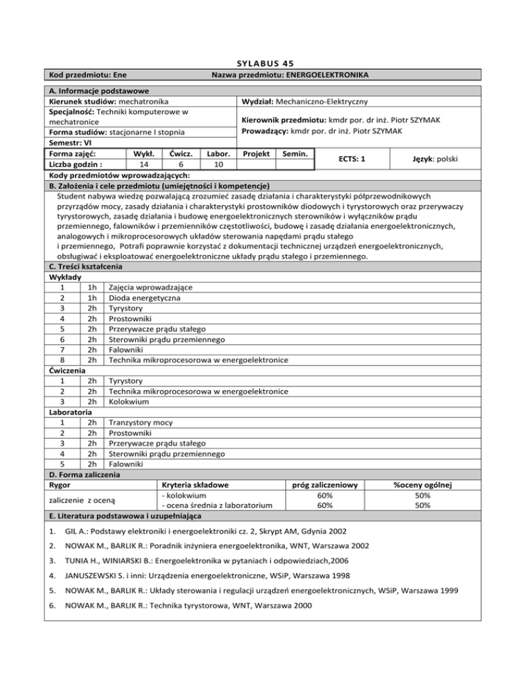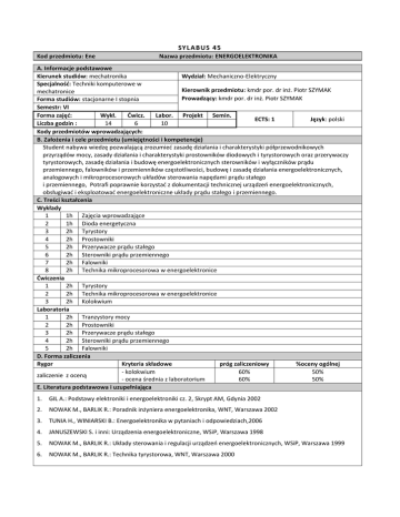 SYL ABUS 45 Kod przedmiotu: Ene Nazwa przedmiotu: ENERGOELEKTRONIKA A. Informacje podstawowe Kierunek studiów: mechatronika Wydział: Mechaniczno-Elektryczny Specjalność: Techniki komputerowe w Kierownik przedmiotu: kmdr por. dr inż. Piotr SZYMAK mechatronice Prowadzący: kmdr por. dr inż. Piotr SZYMAK Forma studiów: stacjonarne I stopnia Semestr: VI Forma zajęć: Wykł. Dwicz. Labor. Projekt Semin. ECTS: 1 Język: polski Liczba godzin : 14 6 10 Kody przedmiotów wprowadzających: B. Założenia i cele przedmiotu (umiejętności i kompetencje) Student nabywa wiedzę pozwalającą zrozumied zasadę działania i charakterystyki półprzewodnikowych przyrządów mocy, zasady działania i charakterystyki prostowników diodowych i tyrystorowych oraz przerywaczy tyrystorowych, zasadę działania i budowę energoelektronicznych sterowników i wyłączników prądu przemiennego, falowników i przemienników częstotliwości, budowę i zasadę działania energoelektronicznych, analogowych i mikroprocesorowych układów sterowania napędami prądu stałego i przemiennego, Potrafi poprawnie korzystad z dokumentacji technicznej urządzeo energoelektronicznych, obsługiwad i eksploatowad energoelektroniczne układy prądu stałego i przemiennego. C. Treści kształcenia Wykłady 1 1h Zajęcia wprowadzające 2 1h Dioda energetyczna 3 2h Tyrystory 4 2h Prostowniki 5 2h Przerywacze prądu stałego 6 2h Sterowniki prądu przemiennego 7 2h Falowniki 8 2h Technika mikroprocesorowa w energoelektronice Dwiczenia 1 2h Tyrystory 2 2h Technika mikroprocesorowa w energoelektronice 3 2h Kolokwium Laboratoria 1 2h Tranzystory mocy 2 2h Prostowniki 3 2h Przerywacze prądu stałego 4 2h Sterowniki prądu przemiennego 5 2h Falowniki D. Forma zaliczenia Rygor Kryteria składowe próg zaliczeniowy %oceny ogólnej - kolokwium 60% 50% zaliczenie z oceną - ocena średnia z laboratorium 60% 50% E. Literatura podstawowa i uzupełniająca 1. GIL A.: Podstawy elektroniki i energoelektroniki cz. 2, Skrypt AM, Gdynia 2002 2. NOWAK M., BARLIK R.: Poradnik inżyniera energoelektronika, WNT, Warszawa 2002 3. TUNIA H., WINIARSKI B.: Energoelektronika w pytaniach i odpowiedziach,2006 4. JANUSZEWSKI S. i inni: Urządzenia energoelektroniczne, WSiP, Warszawa 1998 5. NOWAK M., BARLIK R.: Układy sterowania i regulacji urządzeo energoelektronicznych, WSiP, Warszawa 1999 6. NOWAK M., BARLIK R.: Technika tyrystorowa, WNT, Warszawa 2000