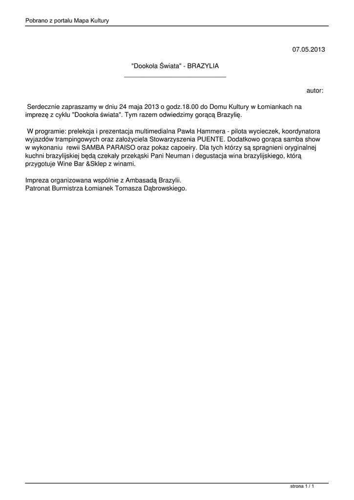 Pobrano z portalu Mapa Kultury 07.05.2013 "Dookoła Świata" - BRAZYLIA ____________________________ autor: Serdecznie zapraszamy w dniu 24 maja 2013 o godz.18.00 do Domu Kultury w Łomiankach na imprezę z cyklu "Dookoła świata". Tym razem odwiedzimy gorącą Brazylię. W programie: prelekcja i prezentacja multimedialna Pawła Hammera - pilota wycieczek, koordynatora wyjazdów trampingowych oraz założyciela Stowarzyszenia PUENTE. Dodatkowo gorąca samba show w wykonaniu rewii SAMBA PARAISO oraz pokaz capoeiry. Dla tych którzy są spragnieni oryginalnej kuchni brazylijskiej będą czekały przekąski Pani Neuman i degustacja wina brazylijskiego, którą przygotuje Wine Bar &Sklep z winami. Impreza organizowana wspólnie z Ambasadą Brazylii. Patronat Burmistrza Łomianek Tomasza Dąbrowskiego. strona 1 / 1