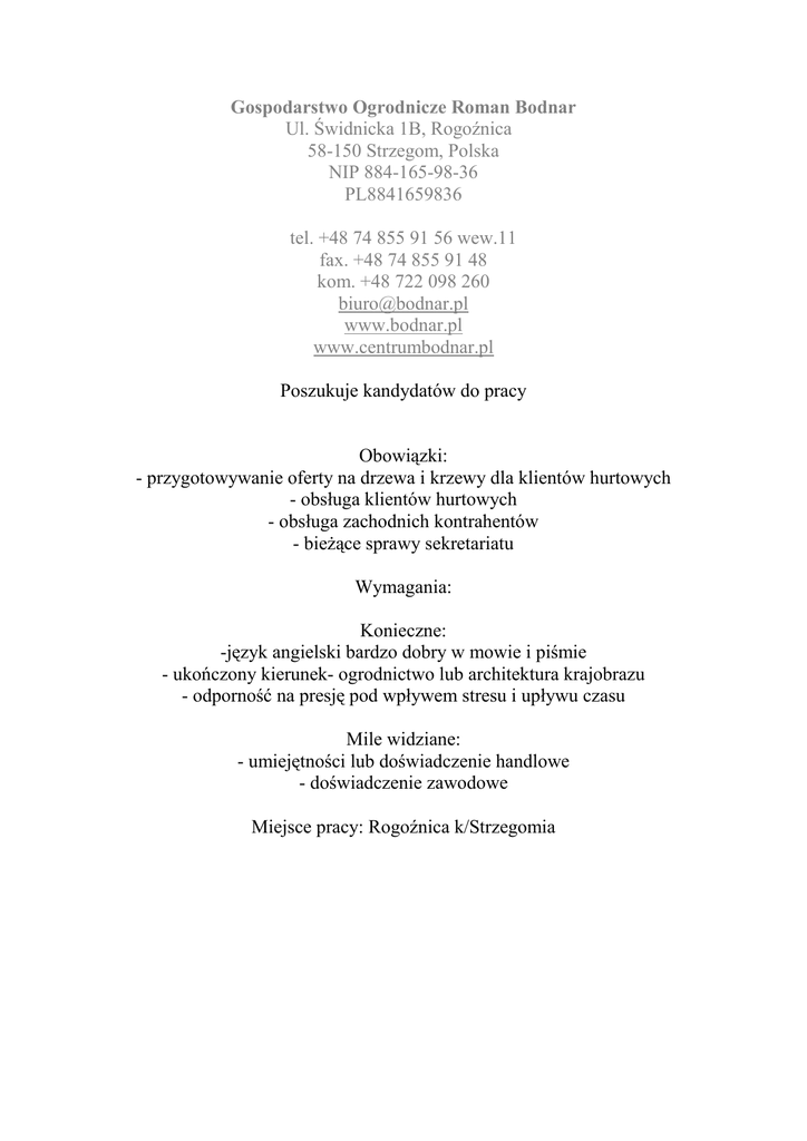 Gospodarstwo Ogrodnicze Roman Bodnar Ul. Świdnicka 1B, Rogoźnica 58-150 Strzegom, Polska NIP 884-165-98-36 PL8841659836 tel. +48 74 855 91 56 wew.11 fax. +48 74 855 91 48 kom. +48 722 098 260 [email protected] www.bodnar.pl www.centrumbodnar.pl Poszukuje kandydatów do pracy Obowiązki: - przygotowywanie oferty na drzewa i krzewy dla klientów hurtowych - obsługa klientów hurtowych - obsługa zachodnich kontrahentów - bieŜące sprawy sekretariatu Wymagania: Konieczne: -język angielski bardzo dobry w mowie i piśmie - ukończony kierunek- ogrodnictwo lub architektura krajobrazu - odporność na presję pod wpływem stresu i upływu czasu Mile widziane: - umiejętności lub doświadczenie handlowe - doświadczenie zawodowe Miejsce pracy: Rogoźnica k/Strzegomia