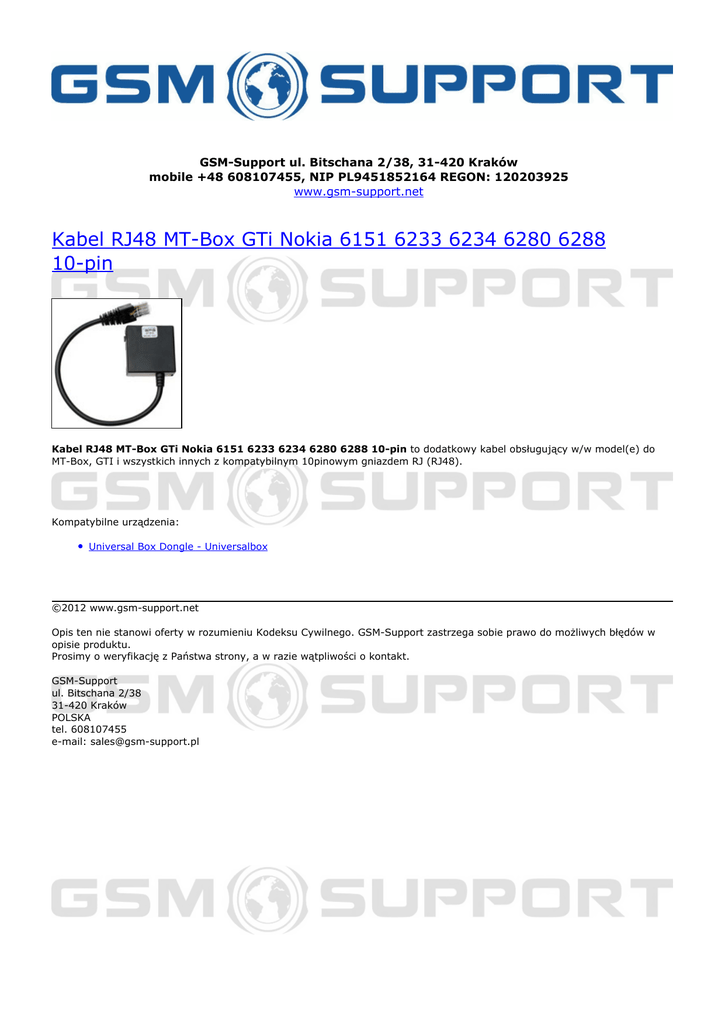 GSM-Support ul. Bitschana 2/38, 31-420 Kraków mobile +48 608107455, NIP PL9451852164 REGON: 120203925 www.gsm-support.net Kabel RJ48 MT-Box GTi Nokia 6151 6233 6234 6280 6288 10-pin Kabel RJ48 MT-Box GTi Nokia 6151 6233 6234 6280 6288 10-pin to dodatkowy kabel obsługujący w/w model(e) do MT-Box, GTI i wszystkich innych z kompatybilnym 10pinowym gniazdem RJ (RJ48). Kompatybilne urządzenia: Universal Box Dongle - Universalbox ©2012 www.gsm-support.net Opis ten nie stanowi oferty w rozumieniu Kodeksu Cywilnego. GSM-Support zastrzega sobie prawo do możliwych błędów w opisie produktu. Prosimy o weryfikację z Państwa strony, a w razie wątpliwości o kontakt. GSM-Support ul. Bitschana 2/38 31-420 Kraków POLSKA tel. 608107455 e-mail: [email protected] Powered by TCPDF (www.tcpdf.org)