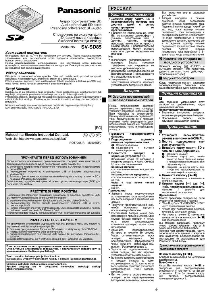 РУССКИЙ Вы поместите его в зарядное устройство. • Аппарат находится в режиме ожидания, когда подсоединен адаптер питания переменного тока. Первичный контур всегда “живой” до тех пор, пока адаптер питания переменного тока подсоединен к электрической розетке. Если аппарат не будет использоваться в течение длительного времени, выключите его и отсоедините адаптер питания переменного тока от бытовой сетевой розетки. Адаптер питания переменного тока потребляет 2 Вт даже тогда, когда аппарат выключен. Уход и использование Aудио проигрыватель SD Audio přehrávač SD karet Przenośny odtwarzacz SD Audio Cправочник по эксплуатации Zkrácený návod k obsluze Skrócona instrukcja obsługi Model No. SV-SD85 Уважаемый покупатель Благодарим Вас за то, что Вы приобрели эту систему. Перед подсоединением, управлением или регулировкой этого продукта прочитайте, пожалуйста, полностью этот справочник. Перед подсоединением, использованием или настройкой этого изделия, пожалуйста, внимательно прочитайте эти инструкции. Пожалуйста, сохраните это руководство для дальнейших справок. Vážený zákazníku Děkujeme za zakoupení tohoto výrobku. Dříve než budete tento produkt zapojovat, obsluhovat nebo nastavovat, přečtěte si prosím celý tento návod. Před zapojením, zapnutím nebo nastavováním tohoto produktu si laskavě přečtěte celý tento návod. Tento návod si uschovejte k pozdějšímu použití. Drogi Kliencie Dziękujemy Ci za zakupienie tego produktu. Przed podłączeniem, uruchomieniem lub regulacją urządzenia, prosimy o dokładne przeczytanie niniejszej instrukcji. Przed podłączeniem, obsługą lub regulacją niniejszego wyrobu prosimy o przeczytanie w całoci instrukcji obsługi. Prosimy o zachowanie instrukcji obsługi do korzystania w przyszłoci. Niniejsza instrukcja została opracowana na podstawie oryginalnej publikacji firmy MATSUSHITA ELECTRIC INDUSTRIAL CO., LTD. EG Matsushita Electric Industrial Co., Ltd. Web site: http://www.panasonic.co.jp/global/ RQT7095-R M0503SF0 После проверки прилагаемых принадлежностей, следуйте этим пунктам для записи (выполнить передачу) на прилагаемую карту памяти SD. 1. Установите программное обеспечение Panasonic SD-Jukebox с прилагаемого диска CD-ROM. 2. Подсоедините устройство чтения/записи USB к Вашему персональному компьютеру. 3. Запишите (выполнить передачу) какую-нибудь музыку на карту памяти SD с помощью Panasonic SD-Jukebox. Относительно подробностей прочитайте инструкцию по эксплуатации (PDF) для Panasonic SD-Jukebox. PŘEČTĚTE SI PŘED POUŽITÍM Po zkontrolování přiloženého příslušenství při záznamu na přiloženou pamě:ovou kartu SD Memory Card postupujte podle uvedeného popisu. 1. Instalujte software Panasonic SD-Jukebox z přiloženého disku CD-ROM. 2. Čtečku/zapisovací zařízení připojte prostřednictvím rozhraní USB ke svému osobnímu počítači. 3. Pomocí programového vybavení Panasonic SD-Jukebox zapište (zkušebně) nějakou hudbu na pamě:ovou kartu SD Memory Card. Podrobnosti najdete v návodu k provozu (soubor PDF) k software Panasonic SD-Jukebox. PRZECZYTAJ PRZED UŻYCIEM Po sprawdzeniu dołączonego wyposażenia wykonaj poniższe kroki, aby nagrać na (wykasować z) dołączoną kartę pamięci SD. 1. Zainstaluj oprogramowanie Panasonic SD-Jukebox z dołączonej płyty CD-ROM. 2. Podłącz czytnik/nagrywarkę USB do komputera. 3. Nagraj (skasuj) fragment muzyczny na kartę pamięci SD przy użyciu Panasonic SDJukebox. Ze szczegółami zapoznaj się w instrukcji obsługi (PDF) Panasonic SD-Jukebox. Этот справочник по эксплуатации описывает основные операции. Относительно иллюстраций обращайтесь к прилагаемому справочнику на немецком языке (Bedienungsanleitung). Tento návod k obsluze popisuje hlavní funkce. Ilustrace jsou uvedeny v německém návodu k obsluze (Bedienungsanleitung). -1- instrukcji obsługi D Извлечение аппарата из зарядного устройства Нажмите кнопку [e] (EJECT) и вытащите аппарат. (Не пытайтесь удалить аппарат, пока действуют запирающие штыри.) E Индикатор батареи Когда индикатор мигает, зарядите перезаряжаемую батарею или замените батарею сухих элементов. Батареи Функция блокировки C Зарядка поставляемой перезаряжаемой батареи F Эта функция удерживает этот аппарат от срабатывания, когда нажимается кнопка. Предотвращается следующее: • Внезапное вкл