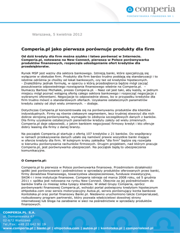 Warszawa, 5 kwietnia 2012 Comperia.pl jako pierwsza porównuje produkty dla firm Od dziś kredyty dla firm można szybko i łatwo porównać w Internecie. Comperia.pl, notowana na New Connect, pierwsza w Polsce porównywarka produktów finansowych, rozpoczęła udostępnianie ofert kredytów dla przedsiębiorstw. Rynek MSP jest ważny dla sektora bankowego. Istnieją banki, które specjalizują się wyłącznie w obsłudze firm. Produkty dla firm bardzo trudno poddają się standaryzacji i to istotnie odróżnia je choćby od lokat bankowych, czy też od kredytów hipotecznych. - Znaleźliśmy jednak formułę, w oparciu o którą przedsiębiorca będzie mógł zacząć poszukiwania odpowiedniego rozwiązania finansowego właśnie na Comperia.pl. – tłumaczy Bartosz Michałek, prezes Comperia.pl. - Nasz cel jest taki, aby każdy, w jednym miejscu mógł poznać wstępną ofertę całego sektora bankowego i rozpocząć negocjacje z wybranymi oferentami. Negocjacje to odpowiednie słowo, bo w przypadku kredytów dla firm trudno mówić o standardowych ofertach. Uzyskanie ostatecznych parametrów kredytu zależy od zbyt wielu zmiennych. – dodaje. Dotychczas Comperia.pl koncentrowała się na porównywaniu produktów dla klientów indywidualnych. Firmy są równie ciekawym segmentem, lecz trudniej stworzyć dla nich dobrze skrojoną porównywarkę, wymagało to zdobycia szczegółowych danych z banków. Dla firmy uzyskanie ostatecznych parametrów kredytu zależy od wielu zmiennych. Comperia.pl daje odpowiedź, z jakim bankiem negocjować firmowy kredyt i kto oferuje dobry leasing dla firmy z danej branży. Na początek Comperia.pl startuje z ofertą 107 kredytów z 21 banków. Do współpracy w ramach przekazywania danych udało się namówić prawie wszystkie banki mające w ofercie kredyty dla firm. W kolejnym kroku zakładka "dla firm" będzie się rozwijała w kierunku porównywania rachunków firmowych. Drugim projektem, nad którym pracuje Comperia.pl, jest porównywarka ubezpieczeń. Na początek będą to ubezpieczenia komunikacyjne. O Comperia.pl: Comperia.pl to pierwsza w Polsce porównywarka finansowa. Przedmiotem działalności spółki jest porównywanie i pośrednictwo w sprzedaży produktów oferowanych przez banki, firmy doradztwa finansowego, towarzystwa ubezpieczeniowe, fundusze inwestycyjne, SKOK-i i inne instytucje finansowe. Comperia istnieje od marca 2008 roku, od 5 grudnia 2011 r. spółka jest notowana na rynku New Connect. Obecnie za jej pośrednictwem do banków trafia co miesiąc kilka tysięcy klientów. W skład Grupy Comperia, oprócz porównywarki finansowej Comperia.pl, wchodzi portal poświęcony kredytom hipotecznym eHipoteka.com oraz serwis motoryzacyjny Autoa.pl, serwis porównujący konta bankowe Kontoteka.pl oraz portal finansowy Banki.pl. Niedawno uruchomiono także ComperiaLead, rozbudowany program partnerski, który pozwala właścicielowi dowolnej strony internetowej lub bloga na zarabianie w sieci na pośrednictwie w sprzedaży produktów finansowych.
