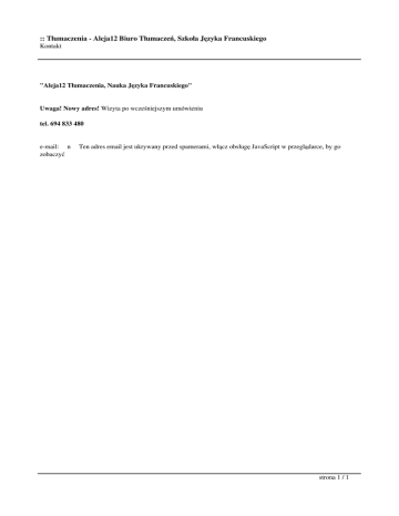 :: Tłumaczenia - Aleja12 Biuro Tłumaczeń, Szkoła Języka Francuskiego Kontakt "Aleja12 Tłumaczenia, Nauka Języka Francuskiego" Uwaga! Nowy adres! Wizyta po wcześniejszym umówieniu tel. 694 833 480 e-mail: n zobaczyć Ten adres email jest ukrywany przed spamerami, włącz obsługę JavaScript w przeglądarce, by go strona 1 / 1