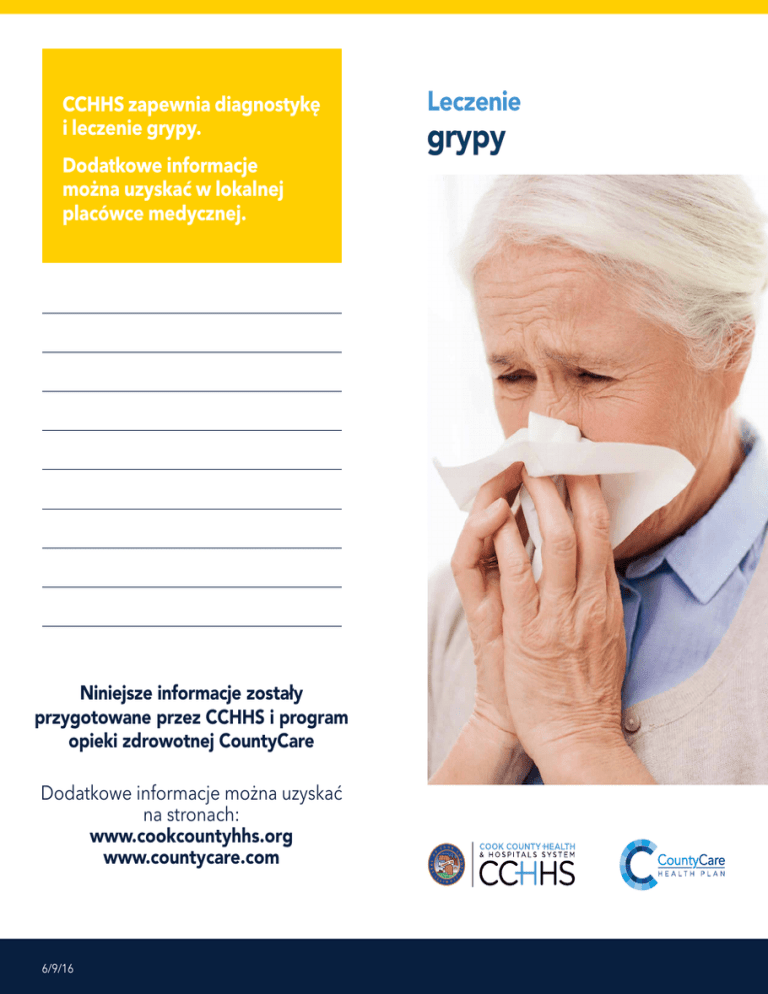 CCHHS zapewnia diagnostykę i leczenie grypy. Dodatkowe informacje można uzyskać w lokalnej placówce medycznej. Niniejsze informacje zostały przygotowane przez CCHHS i program opieki zdrowotnej CountyCare Dodatkowe informacje można uzyskać na stronach: www.cookcountyhhs.org www.countycare.com 6/9/16 Leczenie grypy Grypa Większość dorosłych przynajmniej raz w swoim życiu zachoruje na grypę. Grypa łatwo przenosi się z osoby na osobę drogą kropelkową w wyniku kaszlu, kichania, oddychania lub poprzez kontakt z przedmiotami wcześniej dotkniętymi przez osobę chorą. Zaczynamy zakażać innych grypą na dobę przed pogorszeniem się naszego samopoczucia, a czasami nawet wiele tygodni przez pojawieniem się objawów. Czy choruję na grypę? Objawy grypy przypominają objawy przeziębienia, ale są bardziej zaostrzone. Po grypie możemy czuć się osłabieni i wycieńczeni nawet przez kilka tygodni. Jeśli zaobserwujesz, któryś z poniższych objawów, natychmiast zgłoś się do lekarza: • Ból gardła • Gorączka • Bóle głowy • Bóle mięśni • Kaszel • Katar Jak leczyć lub unikać grypy? • Myj ręce regularnie • Zaszczep się przeciwko grypie • Pij duże ilości wody • Bierz leki zgodnie z zaleceniami • R egularnie umawiaj się na wizyty u lekarza z CCHHS Dodatkowe informacje można uzyskać na stronach: www.cookcountyhhs.org www.countycare.com