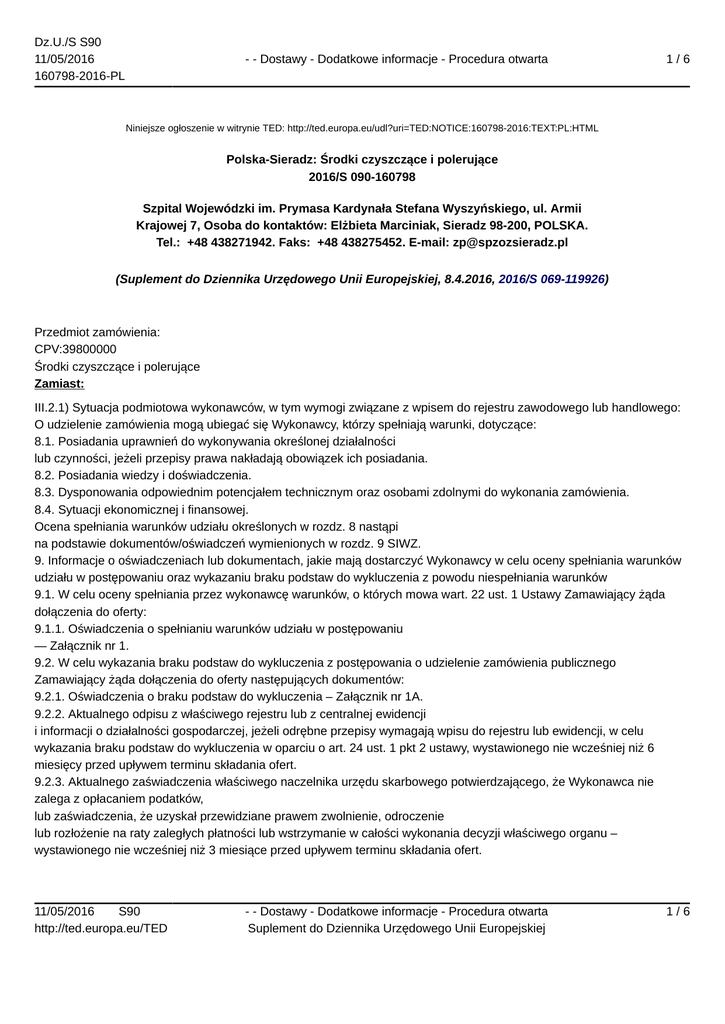 Dz.U./S S90 11/05/2016 160798-2016-PL - - Dostawy - Dodatkowe informacje - Procedura otwarta 1/6 Niniejsze ogłoszenie w witrynie TED: http://ted.europa.eu/udl?uri=TED:NOTICE:160798-2016:TEXT:PL:HTML Polska-Sieradz: Środki czyszczące i polerujące 2016/S 090-160798 Szpital Wojewódzki im. Prymasa Kardynała Stefana Wyszyńskiego, ul. Armii Krajowej 7, Osoba do kontaktów: Elżbieta Marciniak, Sieradz 98-200, POLSKA. Tel.: +48 438271942. Faks: +48 438275452. E-mail: [email protected] (Suplement do Dziennika Urzędowego Unii Europejskiej, 8.4.2016, 2016/S 069-119926) Przedmiot zamówienia: CPV:39800000 Środki czyszczące i polerujące Zamiast: III.2.1) Sytuacja podmiotowa wykonawców, w tym wymogi związane z wpisem do rejestru zawodowego lub handlowego: O udzielenie zamówienia mogą ubiegać się Wykonawcy, którzy spełniają warunki, dotyczące: 8.1. Posiadania uprawnień do wykonywania określonej działalności lub czynności, jeżeli przepisy prawa nakładają obowiązek ich posiadania. 8.2. Posiadania wiedzy i doświadczenia. 8.3. Dysponowania odpowiednim potencjałem technicznym oraz osobami zdolnymi do wykonania zamówienia. 8.4. Sytuacji ekonomicznej i finansowej. Ocena spełniania warunków udziału określonych w rozdz. 8 nastąpi na podstawie dokumentów/oświadczeń wymienionych w rozdz. 9 SIWZ. 9. Informacje o oświadczeniach lub dokumentach, jakie mają dostarczyć Wykonawcy w celu oceny spełniania warunków udziału w postępowaniu oraz wykazaniu braku podstaw do wykluczenia z powodu niespełniania warunków 9.1. W celu oceny spełniania przez wykonawcę warunków, o których mowa wart. 22 ust. 1 Ustawy Zamawiający żąda dołączenia do oferty: 9.1.1. Oświadczenia o spełnianiu warunków udziału w postępowaniu — Załącznik nr 1. 9.2. W celu wykazania braku podstaw do wykluczenia z postępowania o udzielenie zamówienia publicznego Zamawiający żąda dołączenia do oferty następujących dokumentów: 9.2.1. Oświadczenia o braku podstaw do wykluczenia – Załącznik nr 1A. 9.2.2. Aktualnego odpisu z właściwego rejestru lub z centralnej ewidencji i informacji o działalności gospodarczej, jeżeli odrębne przepisy wymagają wpisu do rejestru lub ewidencji, w celu wykazania braku podstaw do wykluczenia w oparciu o art. 24 ust. 1 pkt 2 ustawy, wystawionego nie wcześniej niż 6 miesięcy przed upływem terminu składania ofert. 9.2.3. Aktualnego zaświadczenia właściwego naczelnika urzędu skarbowego potwierdzającego, że Wykonawca nie zalega z opłacaniem podatków, lub zaświadczenia, że uzyskał przewidziane prawem zwolnienie, odroczenie lub rozłożenie na raty zaległych płatności lub wstrzymanie w całości wykonania decyzji właściwego organu – wystawionego nie wcześniej niż 3 miesiące przed upływem terminu składania ofert. 11/05/2016 S90 http://ted.europa.eu/TED - - Dostawy - Dodatkowe informacje - Procedura otwarta Suplement do Dziennika Urzędowego Unii Europejskiej 1/6 Dz.U./S S90 11/05/2016 160798-2016-PL - - Dostawy - Dodatkowe informacje - Procedura otwarta 2/6 9.2.4. Aktualnego zaświadczenia właściwego oddziału Zakładu Ubezpieczeń Społecznych lub Kasy Rolniczego Ubezpieczenia Społecznego potwierdzające, że wykonawca nie zalega z opłacaniem składek na ubezpieczenia zdrowotne i społeczne, lub potwierdzenia, że uzyskał przewidziane prawem zwolnienie, odroczenie lub rozłożenie na raty zaległych płatności lub wstrzymanie w całości wykonania decyzji właściwego organu – wystawionego nie wcześniej niż 3 miesiące przed upływem terminu składania ofert. 9.2.5. Aktualnej informacji z Krajowego Rejestru Karnego w zakresie określonym w art. 24 ust. 1 pkt 4-8 ustawy, wystawionej nie wcześniej niż 6 miesięcy przed upływem terminu składania ofert. 9.2.6. Aktualnej informacji z Krajowego Rejestru Karnego w zakresie określonym w art. 24 ust. 1 pkt 9 ustawy, wystawionej nie wcześniej niż 6 miesięcy przed upływem terminu składania ofert. 9.2.7. Aktualnej informacji z Krajowego Rejestru Karnego w zakresie określonym w art. 24 ust. 1 pkt 10 i 11 ustawy, wystawionej nie wcześniej niż 6 miesięcy przed upływem terminu składania ofert. 9.2.8. Listy podmiotów należących do tej samej grupy kapitałowej, w rozumieniu ustawy z 16 lutego 2007 r. o ochronie konkurencji i konsumentów (Dz. U. nr 50, poz. 331 z późn. zm.) albo informacji o tym, że nie należy do grupy kapitałowej. W przypadku: 1. Wykonawcy mającego siedzibę na terytorium Rzeczypospolitej Polskiej, osoby, o których mowa w art. 24 ust. 1 pkt 5-8, 10 i 11 Pzp, mają miejsce zamieszkania poza terytorium Rzeczypospolitej Polskiej, Wykonawca składa w odniesieniu do nich zaświadczenie właściwego organu sądowego albo administracyjnego miejsca zamieszkania dotyczące niekaralności tych osób w zakresie określonym w art. 24 ust. 1 pkt 5-8, 10 i 11 Pzp, wystawione nie wcześniej niż 6 miesięcy przed upływem terminu składania ofert, z tym że w przypadku gdy w miejscu zamieszkania tych osób nie wydaje się takich zaświadczeń – zastępuje się je dokumentem zawierającym oświadczenie złożone właściwym organem sądowym, administracyjnym albo organem samorządu zawodowego lub gospodarczego miejsca zamieszkania tych osób lub przed notariuszem. 2. Jeżeli Wykonawca ma siedzibę lub miejsce zamieszkania poza terytorium Rzeczypospolitej Polskiej, zamiast dokumentów, o których mowa w pkt 9.2.2, 9.2.3, 9.2.4 oraz 9.2.6 – składa dokument lub dokumenty wystawione w kraju, w którym ma siedzibę lub miejsce zamieszkania, potwierdzające odpowiednio, że: a) nie otwarto jego likwidacji ani nie ogłoszono upadłości, (Wystawione nie wcześniej niż 6 miesięcy przed upływem terminu do składania ofert.) b) nie zalega z uiszczaniem podatków, opłat, składek na ubezpieczenie społeczne i zdrowotne albo że uzyskał przewidziane prawem zwolnienie, odroczenie lub rozłożenie na raty zaległych płatności lub wstrzymanie w całości wyko