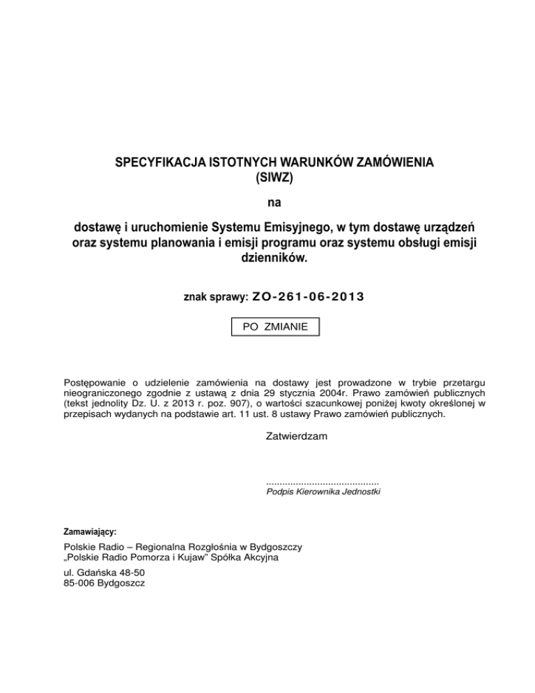 SPECYFIKACJA ISTOTNYCH WARUNKÓW ZAMÓWIENIA (SIWZ) na dostawę i uruchomienie Systemu Emisyjnego, w tym dostawę urządzeń oraz systemu planowania i emisji programu oraz systemu obsługi emisji dzienników. znak sprawy: Z O - 2 6 1 - 0 6 - 2 0 1 3 PO ZMIANIE Postępowanie o udzielenie zamówienia na dostawy jest prowadzone w trybie przetargu nieograniczonego zgodnie z ustawą z dnia 29 stycznia 2004r. Prawo zamówień publicznych (tekst jednolity Dz. U. z 2013 r. poz. 907), o wartości szacunkowej poniżej kwoty określonej w przepisach wydanych na podstawie art. 11 ust. 8 ustawy Prawo zamówień publicznych. Zatwierdzam .......................................... Podpis Kierownika Jednostki Zamawiający: Polskie Radio – Regionalna Rozgłośnia w Bydgoszczy „Polskie Radio Pomorza i Kujaw” Spółka Akcyjna ul. Gdańska 48-50 85-006 Bydgoszcz Radio PiK S.A. Specyfikacja Istotnych Warunków Zamówienia – PO ZMIANIE SPIS TREŚCI ZO-261-06-2013 strona 1. NAZWA I ADRES ZAMAWIAJĄCEGO ............................................................................................................... 3 2. 3. TRYB UDZIELENIA ZAMÓWIENIA .................................................................................................................... 3 OPIS PRZEDMIOTU ZAMÓWIENIA .................................................................................................................. 3 4. TERMIN WYKONANIA ZAMÓWIENIA ............................................................................................................... 3 5. OPIS WARUNKÓW UDZIAŁU W POSTĘPOWANIU ORAZ OPIS SPOSOBU DOKONYWANIA OCENY SPEŁNIANIA TYCH WARUNKÓW ....................................................................................................... 4 DOKUMENTY SKŁADAJĄCE SIĘ NA OFERTĘ ................................................................................................ 4 6. 6.1. WYKAZ OŚWIADCZEŃ LUB DOKUMENTÓW, JAKIE MAJĄ DOSTARCZYĆ WYKONAWCY W CELU POTWIERDZENIA SPEŁNIENIA WARUNKÓW UDZIAŁU W POSTĘPOWANIU: ......................................................... 4 6.2. POZOSTAŁE DOKUMENTY: ............................................................................................................................ 5 6.6. POZOSTAŁE WYMAGANIA.............................................................................................................................. 5 7. INFORMACJA O SPOSOBIE POROZUMIEWANIA SIĘ ZAMAWIAJĄCEGO Z WYKONAWCAMI ORAZ PRZEKAZYWANIA OŚWIADCZEŃ LUB DOKUMENTÓW ..................................................................... 6 8. 9. OSOBA UPRAWNIONA DO POROZUMIEWANIA SIĘ Z WYKONAWCAMI ..................................................... 6 WYMAGANIA DOTYCZĄCE WADIUM .............................................................................................................. 6 10. 11. TERMIN ZWIĄZANIA OFERTĄ.......................................................................................................................... 7 OPIS SPOSOBU PRZYGOTOWANIA OFERTY ................................................................................................ 7 12. 13. MIEJSCE ORAZ TERMIN SKŁADANIA I OTWARCIA OFERT .......................................................................... 8 OPIS SPOSOBU OBLICZENIA CENY ............................................................................................................... 8 14. OPIS KRYTERIÓW, KTÓRYMI ZAMAWIAJĄCY BĘDZIE SIĘ KIEROWAŁ PRZY WYBORZE OFERTY, WRAZ Z PODANIEM ZNACZENIA TYCH KRYTERIÓW I SPOSOBU OCENY OFERT ................... 9 15. INFORMACJE O FORMALNOŚCIACH, JAKIE POWINNY ZOSTAĆ DOPEŁNIONE PO WYBORZE OFERTY W CELU ZAWARCIA UMOWY W SPRAWIE ZAMÓWIENIA PUBLICZNEGO................................... 9 WYMAGANIA DOTYCZĄCE ZABEZPIECZENIA NALEŻYTEGO WYKONANIA UMOWY.............................. 10 16. 17. ISTOTNE DLA STRON POSTANOWIENIA, KTÓRE ZOSTANĄ WPROWADZONE DO TREŚCI ZAWIERANEJ UMOWY W SPRAWIE ZAMÓWIENIA PUBLICZNEGO........................................................... 10 18. POUCZENIE O ŚRODKACH OCHRONY PRAWNEJ PRZYSŁUGUJĄCYCH WYKONAWCY W TOKU POSTĘPOWANIA O UDZIELENIE ZAMÓWIENIA................................................................................ 10 ZAŁĄCZNIKI DO SIWZ:.................................................................................................................................... 11 19. Dostawa i uruchomienie Systemu Emisyjnego, w tym dostawa urządzeń oraz systemu planowania i emisji programu oraz systemu obsługi emisji dzienników 2 Radio PiK S.A. 1. Specyfikacja Istotnych Warunków Zamówienia – PO ZMIANIE ZO-261-06-2013 NAZWA I ADRES ZAMAWIAJĄCEGO Polskie Radio – Regionalna Rozgłośnia w Bydgoszczy „Polskie Radio Pomorza i Kujaw” Spółka Akcyjna z siedzibą w Bydgoszczy, adres: 85-006 Bydgoszcz, ul. Gdańska 48-50, wpisana do rejestru przedsiębiorców KRS przez Sąd Rejonowy w Bydgoszczy, XIII Wydział Gospodarczy KRS pod nr KRS 0000183992. Zarząd: Prezes Zarządu: Michał Jagodziński. Wysokość kapitału zakładowego i wpłaconego 703.900,00 zł. NIP 554-03-16-293, Regon: 090449804. 2. TRYB UDZIELENIA ZAMÓWIENIA Przetarg nieograniczony. 3. OPIS PRZEDMIOTU ZAMÓWIENIA 3.1. Przedmiot zamówienia Wspólny Słownik Zamówień CPV: 48:00:00:00-8 Pakiety oprogramowania i systemy informatyczne 72:21:00:00-0 Usługi programowania pakietów oprogramowania 48:60:00:00-4 Pakiety oprogramowania dla baz danych i operacyjne 48:33:20:00-4 Pakiety oprogramowania do opracowywania harmonogramów Przedmiotem zamówienia jest dostawa i uruchomienie Systemu Emisyjnego, w tym dostawa urządzeń oraz systemu planowania i emisji programu oraz systemu obsługi emisji dzienników. Szczegółowy opis przedmiotu zamówienia został zamieszczony w załączniku nr 1 do SIWZ. Zamawiający wymaga aby instalacja i wdrożenie Systemu do fazy umożliwiającej testowanie przez przedstawicieli Zamawiającego nastąpiła w ci