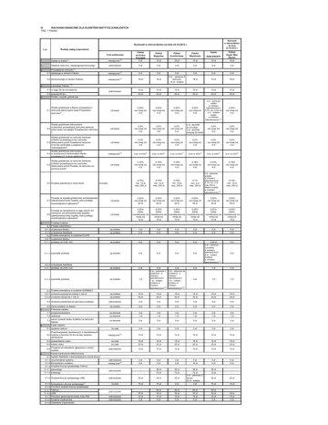 III RACHUNKI BANKOWE DLA KLIENTÓW INSTYTUCJONALONYCH TAB. 1 Pakiety Rachunki w ofercie Banku do dnia 23.10.2012 r. Rachunki w ofercie Banku od dnia 24.10.2012 r. Rodzaj usług (czynności) L.p. Pakiet Wygodny Pakiet Komfortowy Pakiet Wspólnota NON-PROFIT Pakiet Super Max Biznes miesięcznie13) Pakiet na Dobry Początek 0 zł 15 zł 35 zł 10 zł 15 zł 10 zł jednorazowo 0 zł 0 zł 0 zł 0 zł 0 zł 0 zł Tryb pobierania 1. Opłata za Pakiet1): 2. Otwarcie rachunku bieżącego/pomocniczego 3. Prowadzenie rachunku1): 3.1 bieżącego w ramach Pakietu miesięcznie 3.2 pomocniczego w ramach Pakietu miesięcznie 13) 0 zł 0 zł 0 zł 0 zł 0 zł 0 zł 13) 18 zł 18 zł 0 zł – pierwsze 2 rachunki; 18 zł - kolejne 18 zł 10 zł 18 zł 10 zł 10 zł 10 zł 10 zł 10 zł 10 zł 20 zł 20 zł 20 zł 20 zł 20 zł 20 zł 0,30% nie mniej niż 4 zł Likwidacja Pakietu: 16) 4. 4.1 w ciągu 90 dni od otwarcia 5. Pakiet jednorazowo 4.2 powyżej 90 dni Wpłaty i wypłaty gotówkowe Wpłaty gotówkowe w Banku prowadzącym 5.1 rachunek dokonywane przez Posiadacza 2) rachunku Wpłaty gotówkowe dokonywane w placówce prowadzącej rachunek bankowy 5.2 przez osoby nie będące Posiadaczami rachunku od kwoty 0,30% nie mniej niż 4 zł 0,30% nie mniej niż 4 zł 0,30% nie mniej niż 4 zł 0,30% nie mniej niż 4 zł 0 zł – pierwsza wpłata w miesiącu kalendarzowym; 0,3% nie mniej niż 4 zł - kolejne wpłaty w miesiącu kalendarzowym 14) od kwoty 0,5% nie mniej niż 5 zł 0,5% nie mniej niż 5 zł 0,5% nie mniej niż 5 zł 0 zł - dla WM do 20 lokali, 2 zł - dla WM powyżej 20 lokali 0,5% nie mniej niż 5 zł 0,5% nie mniej niż 5 zł od kwoty 0,2% nie mniej niż 4 zł 0,2% nie mniej niż 4 zł 0,2% nie mniej niż 4 zł 0,2% nie mniej niż 4 zł 0,2% nie mniej niż 4 zł 0,2% nie mniej niż 4 zł miesięcznie14) 0 zł / 0,15%4) 0 zł / 0,15%4) 0 zł / 0,15%4) 0 zł / 0,15%4) 0 zł / 0,15%4) 0 zł / 0,15%4) od kwoty 0,18% nie mniej niż 4 zł 0,18% nie mniej niż 4 zł 0,18% nie mniej niż 4 zł 0,18% nie mniej niż 4 zł 0,18% nie mniej niż 4 zł 0,18% nie mniej niż 4 zł 0,15% min. 10 zł max. 250 zł 0,15% min. 10 zł max. 250 zł 0,15% min. 10 zł max. 250 zł 0,1% min. 4 zł max. 250 zł 0,25% nie mniej niż 50 zł 0,25% nie mniej niż 50 zł 0,25% nie mniej niż 50 zł 0,25% nie mniej niż 50 zł 3) Wpłaty gotówkowe na rachunki bankowe w Banku prowadzącym ten rachunek 5.3 dokonywane przez Posiadacza rachunku w formie zamkniętej z podpisanym "zobowiązaniem" Wpłaty gotówkowe dokonywane 5.4 w oznaczonych bankomatach Banku posiadających funkcję wpłatomatu 5.5 Wpłaty gotówkowe na rachunki bankowe w Banku prowadzącym ten rachunek dokonywane przez Posiada- za rachunku za pomocą wrzutni 5.6 Wypłaty gotówkowe z rachunku5) od kwoty Prowizja za wypłatę gotówki bez wcześniejszego 5.7 zaawizowania kwoty wypłaty, która podlega wcześniejszemu zgłoszeniu6) od kwoty Prowizja za nieodebranie w ciągu dwóch dni roboczych (od planowanej daty wypłaty) zaawizowanej kwoty wypłaty, która podlega wcześniejszemu zgłoszeniu od kwoty 5.8 0,25% 0,25% 0,25% 0,25% kwoty kwoty kwoty kwoty nieodebranej nie nieodebranej nie nieodebranej nie nieodebranej nie mniej niż mniej niż mniej niż mniej niż 10 zł 10 zł 10 zł 10 zł 0 zł - pierwsza wypłata w miesiącu kalendarzowym; 0,1% min. 4 zł max. 250 zł kolejne wypłaty w miesiącu kalendarzowym 14) 0,15% min. 10 zł max. 250 zł 0,25% nie mniej niż 50 zł 0,25% nie mniej niż 50 zł 0,25% kwoty nieodebranej nie mniej niż 10 zł 0,25% kwoty nieodebranej nie mniej niż 10 zł Przelewy krajowe 6. 6.1 Przelew wewnętrzny: 6.1.1 w placówce Banku za przelew 4 zł 4 zł 4 zł 4 zł 0 zł 4 zł 6.1.2 w Systemie Net-Bank 6.2 Przelew zewnętrzny w systemie ELIXIR za przelew 0 zł 0 zł 0 zł 0 zł 0 zł 0 zł za przelew 6 zł 6 zł 6 zł 6 zł 6.2.1 w placówce Banku 6.2.1.1 6.2.1.2 przelewy do ZUS i US pozostałe przelewy za przelew 6 zł za przelew 0 zł 6 zł 3,50 zł 0 zł – pierwsze 3 przelewy w miesiącu kalendarzowym 4 zł – kolejne przelewy w miesiącu kalendarzowym 14) 6 zł 6 zł 6 zł 6 zł 0 zł 0 zł – pierwsze 5 0 zł 0 zł – pierwsze 30 0 zł 1 zł 0 zł przelewów w miesiącu kalendarzowym 1 zł – kolejne przelewy w miesiącu przelewów w miesiącu kalendarzowym 1 zł – kolejne przelewy w miesiącu 0 zł 1 zł 1 zł 6.2.2 w Systemie Net-Bank 6.2.2.1 przelewy do ZUS i US za przelew 1 zł 6.3.1 w kwocie wyższej lub równej 1 mln zł za przelew 15 zł 15 zł 15 zł 15 zł 15 zł 15 zł 6.3.2 w kwocie niższej niż 1 mln zł za przelew 30 zł 30 zł 30 zł 30 zł 30 zł 30 zł jednorazowo 5 zł 5 zł 5 zł 5 zł 5 zł 5 zł 6.5 Zwrot przelewu do Banku Polecenie zapłaty za przelew 0 zł 0 zł 0 zł 0 zł 0 zł 0 zł 7.1 przyjęcie/odwołanie za zlecenie 3 zł 3 zł 3 zł 3 zł 3 zł 3 zł 7.2 realizacja za zlecenie 1 zł 1 zł 1 zł 1 zł 1 zł 1 zł zwrot z powodu braku środków na rachunku 7.3 Klienta za zlecenie 0 zł 0 zł 0 zł 0 zł 0 zł 0 zł 6.2.2.2 pozostałe przelewy kalendarzowym 14) kalendarzowym 14) 6.3 Przelew zewnętrzny w systemie SORBNET 6.4 Wydanie potwierdzenia wykonania przelewu 7. Czeki krajowe 8. 8.1 wydanie czeków Przechowywanie zamówionych a nieodebranych 8.2 czeków w terminie 30 dni od daty złożenia zamówienia za czek 13) miesięcznie 2 zł 2 zł 2 zł 2 zł 2 zł 2 zł 10 zł 10 zł 10 zł 10 zł 10 zł 10 zł 8.3 potwierdzenie czeku za czek 15 zł 15 zł 15 zł 15 zł 15 zł 15 zł 8.4 inkaso czeku za czek 20 zł 20 zł 20 zł 20 zł 20 zł 20 zł jednorazowo 10 zł 10 zł 10 zł 10 zł 10 zł 10 zł jednorazowo 0 zł 0 zł 0 zł 0 zł 0 zł 0 zł miesięcznie13) 0 zł 0 zł 0 zł 10 zł 0 zł 0 zł - 36 zł 36 zł 36 zł 36 zł - - 72 zł 72 zł 72 zł - jednorazowo 25 zł 25 zł 25 zł 72 zł 0 zł – pierwsze 2 klucze 25 zł - kolejne 25 zł 25 zł rocznie 15 zł 15 zł 0 zł 0 zł 15 zł 15 zł - 80 zł 80 zł 80 zł 80 zł - Przyjęcie lub odwołanie zgłoszenia o utracie 8.5 czeków