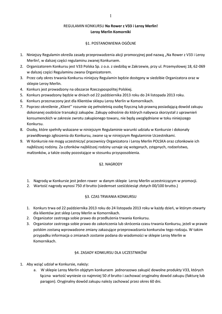 1 REGULAMIN KONKURSU Na Rower z V33 i Leroy Merlin! Leroy Merlin Komorniki §1. POSTANOWIENIA OGÓLNE 1. Niniejszy Regulamin określa zasady przeprowadzenia akcji promocyjnej pod nazwą „Na Rower z V33 i Leroy Merlin!, w dalszej części regulaminu zwanej Konkursem. 2. Organizatorem Konkursu jest V33 Polska Sp. z o.o. z siedzibą w Zakrzewie, przy ul. Przemysłowej 18, 62-069 w dalszej części Regulaminu zwana Organizatorem. 3. Przez cały okres trwania Konkursu niniejszy Regulamin będzie dostępny w siedzibie Organizatora oraz w sklepie Leroy Merlin. 4. Konkurs jest prowadzony na obszarze Rzeczypospolitej Polskiej. 5. Konkurs prowadzony będzie w dniach od 22 października 2013 roku do 24 listopada 2013 roku. 6. Konkurs przeznaczony jest dla Klientów sklepu Leroy Merlin w Komornikach. 7. Poprzez określenie „Klient’’ rozumie się pełnoletnią osobę fizyczną lub prawną posiadającą dowód zakupu dokonanej osobiście transakcji zakupów. Zakupy odnośnie do których nabywca skorzystał z uprawnień konsumenckich w zakresie zwrotu zakupionego towaru, nie będą uwzględniane w toku niniejszego Konkursu. 8. Osoby, które spełniły wskazane w niniejszym Regulaminie warunki udziału w Konkursie i dokonały prawidłowego zgłoszenia do Konkursu, zwane są w niniejszym Regulaminie Uczestnikami. 9. W Konkursie nie mogą uczestniczyć pracownicy Organizatora i Leroy Merlin POLSKA oraz członkowie ich najbliższej rodziny. Za członków najbliższej rodziny uznaje się wstępnych, zstępnych, rodzeństwo, małżonków, a także osoby pozostające w stosunku przysposobienia. §2. NAGRODY 1. Nagrodą w Konkursie jest jeden rower w danym sklepie Leroy Merlin uczestniczącym w promocji. 2. Wartość nagrody wynosi 750 zł brutto (siedemset sześćdziesiąt złotych 00/100 brutto.) §3. CZAS TRWANIA KONKURSU 1. Konkurs trwa od 22 października 2013 roku do 24 listopada 2013 roku w każdy dzień, w którym otwarty dla klientów jest sklep Leroy Merlin w Komornikach. 2. Organizator zastrzega sobie prawo do przedłużenia trwania Konkursu. 3. Organizator zastrzega sobie prawo do zakończenia lub skrócenia czasu trwania Konkursu, jeżeli w prawie polskim zostaną wprowadzone zmiany zakazujące przeprowadzania konkursów tego rodzaju. W takim przypadku informacja o zmianach zostanie podana do wiadomości w sklepie Leroy Merlin w Komornikach. §4. ZASADY KONKURSU DLA UCZESTNIKÓW 1. Aby wziąć udział w Konkursie, należy: a. W sklepie Leroy Merlin objętym konkursem jednorazowo zakupić dowolne produkty V33, których łączna wartość wyniesie co najmniej 50 zł brutto i zachować oryginalny dowód zakupu (fakturę lub paragon). Oryginalny dowód zakupu należy zachować przez okres 60 dni. 2 2. 3. 4. 5. 6. 7. 8. b. Dokończyć zdanie, znajdujące się na Formularzu Zgłoszeniowym „Wycieczki rowerowe to …” Wypełniony Formularz Zgłoszeniowy należy wrzucić do urny wystawionej przy produktach V33 w Dziale Farb i Lakierów sklepu Leroy Merlin w Komornikach. Kupony wypełnione nieprawidłowo, nieczytelne lub niekompletne nie będą brały udziału w Konkursie. Zwycięzca Konkursu zostanie poproszony o przedstawienie w ciągu 7 dni oryginału dowodu zakupu w sklepie Leroy Merlin w Komornikach. Dowód zakupu budzący wątpliwość co do jego oryginalności zostaje odrzucony, a Uczestnik, który przedstawił taki dowód traci prawo do nagrody. Brak oryginału dowodu zakupu dyskwalifikuje Zwycięzcę. Każdy Uczestnik może wziąć udział w Konkursie wielokrotnie, dokonując kolejnych zakupów produktów V33 o jednorazowej minimalnej wartości 50 zł brutto. Jeden dowód zakupu upoważnia do wypełnienia jednego Formularza Zgłoszeniowego. W Konkursie biorą udział tylko Formularze Zgłoszeniowe złożone w urnie wystawionej w sklepie Leroy Merlin w Komornikach. Uczestnik, który wygra w Konkursie nagrodę zostanie poinformowany o wygranej drogą telefoniczną na wskazany na Formularzu Zgłoszeniowym numer telefonu. Organizator podejmuje 3 próby połączenia w godzinach od 9 do 17 tego samego dnia i oczekuje za każdym razem przez 6 sygnałów na odebranie połączenia. Nieodebranie połączenia, uruchomienie poczty głosowej, automatycznej sekretarki itp. jest traktowane jako brak nawiązania połączenia i powoduje utratę prawa do nagrody. §5. SPOSÓB ROZSTRZYGNIĘCIA KONKURSU 1. Zwycięzcę Konkursu wyłoni Komisja Konkursowa w terminie 10 dni od dnia zakończenia Konkursu. 2. Ze wszystkich prawidłowo wypełnionych Formularzy Zgłoszeniowych, zawierających dokończone zdanie konkursowe, które zostały złożone w urnie w sklepie Leroy Merlin, zostanie wyłoniony przez Komisję konkursową autor najciekawszej odpowiedzi i nagrodzony nagrodą określoną w §2 pkt. 1 3. Zwycięzca Konkursu zostanie poproszony o przedstawienie w terminie 7 dni od daty poinformowania o wygranej, oryginału dowodu zakupu w sklepie Leroy Merlin w Komornikach. 4. Brak oryginału dowodu zakupu dyskwalifikuje Zwycięzcę i traci on prawo do nagrody. 5. Dowód zakupu potwierdzający zakup musi mieć datę i godzinę potwierdzającą zakup w czasie trwania Konkursu. 6. Uczestnik Konkursu jest zobowiązany, pod rygorem utraty prawa do otrzymania nagrody, do przechowywania dowodu zakupu potwierdzającego zakup przez okres 60 dni od daty zakupu. 7. Informacja o zwycięzcy konkursu będzie dostępna w sklepie Leroy Merlin objętym konkursem w terminie 7 dni od daty rozstrzygnięcia konkursu. §5. TERMIN I SPOSÓB PRZEKAZANIA NAGRÓD 1. Nagroda przyznana Zwycięzcy Konkursu zostanie przekazana w sklepie Leroy Merlin w Komornikach, po uprzednim przedstawieniu oryginału dowodu zakupu, spełniającym wymagania określone w niniejszym regulaminie. 2. Uczestnik, który został powiadomiony przez Organizatora Konkursu o przyznanej nagrodzie zobowiązany jest do przesłania na adres Organizatora Konkursu następujących danych osobowych: 1) Imię i Nazwisko 2) Adres zameldowania 3) Numer Pesel 3 3. Zwycięzca nie 