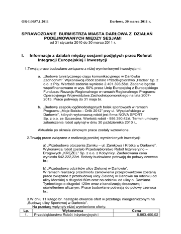 OR-I.0057.1.2011 Darłowo, 30 marca 2011 r. SPRAWOZDANIE BURMISTRZA MIASTA DARŁOWA Z DZIAŁAŃ PODEJMOWANYCH MIĘDZY SESJAMI od 31 stycznia 2010 do 30 marca 2011 r. I. Informacje z działań między sesjami podjętych przez Referat Integracji Europejskiej i Inwestycji 1.Trwają prace budowlane związane z niżej wymienionymi inwestycjami: a. „Budowa turystycznego ciągu komunikacyjnego w Darłówku Zachodnim”. Wykonawcą robót zostało Przedsiębiorstwo „Hades” Sp. z o.o. z Piły. Wartość zadania wyniesie 2.401.393,58zł. Zadanie będzie współfinansowane w wys. 50% przez Unię Europejską z Europejskiego Funduszu Rozwoju Regionalnego w ramach Regionalnego Programu Operacyjnego Województwa Zachodniopomorskiego na lata 20072013. Prace potrwają do 31 maja br. b. „Budowę zespołu ogólnodostępnych boisk sportowych w ramach Programu „Moje Boisko - Orlik 2012” przy ul. Wyspiańskiego w Darłowie”, których wykonawcą robót jest firma NOVA SPORT Sp. z o.o. ze Szczecina. Wartość robót - 986.390,42zł. Termin umowny zakończenia robót upłynął w dniu 30 października 2010 r.. Aktualnie po okresie zimowym prace zostały wznowione. 2.Trwają prace związane z realizacją poniżej wymienionych inwestycji: a) „Przebudowa otoczenia Zamku – ul. Zamkowa i Krótka w Darłowie”. Wykonawcą robót zostało Przedsiębiorstwo Robót Inżynieryjno – Drogowych „KRĘŻEL” Sp. z o.o. z Kobylnicy. Zaoferowana cena wyniosła 542.222,22zł. Roboty budowlane potrwają do połowy czerwca br.; b) „Przebudowa odcinków ulicy Zielonej w Darłowie”. W ramach realizacji przedmiotu zamówienia przeprowadzone zostaną prace związane z przebudową ulicy Zielonej w Darłowie na odcinku od ulicy Morskiej o długości 50m oraz na odcinku od ulicy o. Damiana Tynieckiego o długości 120m wraz z kanalizacją deszczową i oświetleniem ulicznym. Prace budowlane potrwają do połowy czerwca br.; 3.W dniu 11 lutego br. nastąpiło otwarcie ofert w przetargu nieograniczonym na „Budowę ulicy Sportowej w Darłowie”. Na przetarg wpłynęły niżej wymienione oferty: Lp. Wykonawca Cena 1. Przedsiębiorstwo Robót Inżynieryjnych i 6.863.400,02 2. 3. 4. 5. Budowlanych INFRABUD, Koszalin EUROVIA POLSKA S.A., Szczecin Konsorcjum firm: POL-DRÓG Człuchów” Sp. z o.o. oraz „PBI KORNAS” Sp. z o.o.. Kołobrzeg Przedsiębiorstwo Robót Inżynieryjno – Budowlanych „Krężel” Sp. z o.o., Kobylnica COLAS POLSKA Sp. z o.o., Palędzie 8.096.967,52 6.216.841,52 6.142.055,84 6.694.010,19 Komisja wybrała ofertę Przedsiębiorstwa Robót Inżynieryjno – Drogowych „Krężel” Sp. z o.o. z Kobylnicy. W dniu 08 marca br. przekazany został plac budowy związany z realizacją w/w. inwestycji. Prace budowlane potrwają do 15 listopada br. Zadanie jest współfinansowane w ramach Narodowego Programu Budowy Dróg Lokalnych 2008 – 2011. 4.W dniu 16 marca br. nastąpiło otwarcie ofert w przetargu nieograniczonym na „Budowę ulicy Flisackiej w Darłowie”. Na przetarg wpłynęły niżej wymienione oferty: Lp. Wykonawca Cena 1. Zakład Inżynieryjno – Budowlany, Franciszek 139.963,37 Dorosiński, Darłowo 2. Firma Budowlana, Krzysztof Gomułka, Nowe 124.998,63 Bielice 3. Przedsiębiorstwo Drogowe „DROBET” 108.569,47 Tadeusz Broś, Sławno 4. Przedsiębiorstwo Robót Inżynieryjno – 123.641,33 Drogowych „KRĘŻEL” Sp. z o.o., Kobylnica 5. Zakład Urządzania i Renowacji Terenów, 121.087,58 Koszalin 6. P.H.U. „DOMEK” Krzysztof Bobrowski, Darłowo 139.652,85 Komisja wybrała ofertę złożoną przez Pana Tadeusza Brosia ze Sławna. Prace budowlane rozpoczną się na początku kwietnia br. i potrwają do dnia 30 maja br. 5.W dniu 17 marca br. nastąpił odbiór robót związanych z realizacją inwestycji p.n. „Przeprowadzenie prac budowlanych związanych ze zmianą pokrycia dachu oraz wykonanie elewacji budynku Ratusza Miejskiego w Darłowie”. Wykonawcą prac był Pan Edward Koziński, prowadzący działalność gospodarczą p.n. Zakład Ogólnobudowlany z siedzibą w Dobrzanach. Koszt robót wyniósł 572.551,71zł. 6.W dniu 17 marca br. ogłoszony został przetarg nieograniczony na realizację inwestycji p.n. „Budowa boiska sportowego w Darłowie”. Otwarcie ofert nastąpi w dniu 31 marca br. Prace budowlane potrwają do końca lipca 2011 roku. II. Referat Gospodarki Nieruchomościami i Planowania 1. Sprzedano trzy lokale mieszkalne przy ulicy: - Zachodnia 13/6 – za kwotę 303.000,00 zł, - Kowalska 15/6 – za kwotę 6.279,00 zł, - Powstańców Warszawskich 29/1 – za kwotę 10.635,00 zł. 2. Sprzedano na polepszenie warunków zagospodarowania: - w drodze bezprzetargowej dwie nieruchomości: ul. Henryka Wieniawskiego 17 - działka 277 obręb 13 - za kwotę 10.491,90 zł, ul. Jana Henryka Dąbrowskiego – działka 77/18, 77/10, 77/21 obręb 12 – za kwotę 1.056,91 zł. 3. Wydano 1 decyzję naliczającą opł atę adiacencką (nieruchomość poł ożona przy ulicy Leśnej – dział ka 134/68 obręb 12). 4. W dniu 17 lutego 2011r. zawarto umowę użyczenia ze Starostą Sł awieńskim na dział ki gruntu poł ożone w obrębie nr 2 m. Darł owo, oznaczone w ewidencji gruntów jako dział ki nr 345/2 i 345/13 celem przeprowadzenia inwestycji pod nazwą: „Poł ączenie dolnej części rybackiego portu Darł owo drogami lokalnymi poprzez budowę ul. Nadmorskiej”. 5. W dniu 17 lutego 2011r. zawarto umowę użyczenia z Dyrektorem Miejskiego Przedsiębiorstwa Gospodarki Komunalnej w Darł owie na dział ki gruntu poł ożone w obrębie nr 2 m. Darł owo, oznaczone w ewidencji gruntów jako dział ki nr: 344/1, 344/2 i 344/5, celem przeprowadzenia inwestycji pod nazwą: „Poł ączenie dolnej części rybackiego portu Darł owo drogami lokalnymi poprzez budowę ul. Nadmorskiej”. 6. W dniu 04 marca 2011r. zawarto umowę użyczenia ze Starostą Sł awieńskim na dział kę gruntu poł ożoną w obrębie nr 2 m. Darł owo, oznaczoną w ewidencji gruntów jako dzi