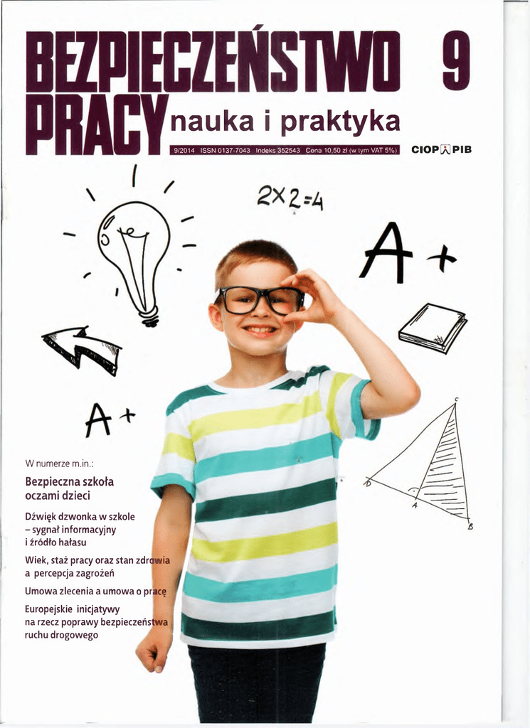 nauka i praktyka 9/2014 ISSN 0137-7043 Indeks 352543 Cena 10,50 zł (w tym VAT 5%) W numerze m.in.: Bezpieczna szkoła oczami dzieci Dźwięk dzwonka w szkole - sygnał informacyjny i źródło hałasu Wiek, staż pracy oraz stan zdrowia a percepcja zagrożeń Umowa zlecenia a umowa o pracę Europejskie inicjatywy na rzecz poprawy bezpieczeństwa ruchu drogowego CIOP[A]PIB OS No. 9 (516) September 2014 BP nr 9 (516) wrzesień 2014 Międzynarodowa konferencja "XVI International Biodeterioration and Biodegradation Symposium", Łódź, 3-5 września 2014. Biomechanizmy bezpieczeństwa.................................................................... II s. okł. International conference "XVI International Biodeterioration and Biodegradation Symposium". tódź, September 3-5,2014. Safety biomechanisms Aktualności z kraju ............................................................................................................................................. 2 Local reports Bezpieczna szkoła oczami dzieci Safe school in the eyes of children Morto Derlicko................................................................................................................................................... 3 Wybrane narzędzia wspomagające zarządzanie zagrożeniami psychospołecznymi dostępne w Internecie Chosen tools supporting psychosocial risk martagement available in the Internet Wioleto Klimaszewska.......................................................................................................................................6 Jak skutecznie przeprowadzić dostosowanie środowiska pracy do potrzeb osób niepełnosprawnych Effective work environment's adjustment towards the needs of disabled people Joanna Bugajska, Wiktor M. Zawieska.......................................................... ...................................................8 Dźwięk dzwonka w szkole - sygnał informacyjny i źródło hałasu. Wyniki badań własnych Sound of school beli - information signal and source of noise. Original research Izabela Jakubowska.......................................................................................................................................... 12 Wiek, staż pracy oraz stan zdrowia jako czynniki wpływające na percepcję zagrożeń związanych z pracą Age, tenure and generał health as factors influencing occupational risk perception Szymon Ordysiński............................................................................................................................................ 16 Umowa zlecenia a umowa o pracę Contract of mandate and contract of employment Karolina Aromińska.......................................................................................................................................... 20 Europejskie inicjatywy na rzecz poprawy bezpieczeństwa ruchu drogowego European initiatives for road traffic safety improvement Krzysztof Goniewicz, Mariusz Goniewicz........................................................................................................24 4 OBRADOWAŁA RADA OCHRONY PRACY PRZY SEJMIE RP Wspólne działania Państwowej Inspekcji Pracy i Zakładu Ubezpieczeń Społecznych na rzecz ochrony pracy.....................................................................................................................................30 LABOUR PROTECTION COUNCIL IN SESSION Joint action of the National Labour Inspectorate and the Social Insurance Institution in the benefit of OSH ODPOWIADAMY NA PYTANIA CZYTELNIKÓW ANSWERING OUR READERS’ QUESTIONS Wiesława Lem pska........................................................................................................................................... 31 DONIESIENIA Z ZAG RANICY............................................................................................................................32 REPORTS FROMABROAD