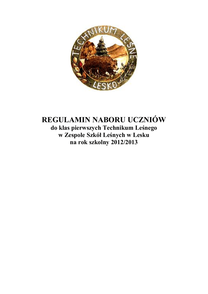 REGULAMIN NABORU UCZNIÓW do klas pierwszych Technikum Leśnego w Zespole Szkół Leśnych w Lesku na rok szkolny 2012/2013 Podstawa prawna: Ustawa z dnia 19 sierpnia 2011r. o zmianie ustawy o systemie oświaty oraz niektórych innych ustaw (Dz. U. Nr.205 z 2011r., poz.1206); Rozporządzenie Ministra Edukacji Narodowej i Sportu z dnia 20 lutego 2004r. w sprawie warunków i trybu przyjmowania uczniów do publicznych przedszkoli i szkół oraz przechodzenia z jednych typów szkół do innych (Dz. U. Nr 26 z 2004r., poz.232); Rozporządzenie Ministra Edukacji Narodowej z dnia 28 maja 2010r. w sprawie świadectw, dyplomów państwowych i innych druków szkolnych (Dz. U. Nr 97 z 2010r. poz. 624); Zarządzenie Nr 1/2012 Podkarpackiego Kuratora Oświaty z dnia 10 lutego 2012 r. w sprawie terminów rekrutacji do szkół na rok szkolny 2012/2013, sposobu przeliczania na punkty ocen, wyników egzaminów i innych osiągnięć uczniów. § 1. Postanowienia ogólne Warunkiem ubiegania się o przyjęcie do klas pierwszych 4 –letniego Technikum Leśnego dla młodzieży kształcącego w zawodzie technik leśnik w Zespole Szkół Leśnych w Lesku w roku szkolnym 2012/2013 jest: ukończenie gimnazjum publicznego lub niepublicznego z uprawnieniami szkoły publicznej lub szkoły za granicą równorzędnej polskiemu publicznemu gimnazjum; złożenie kompletu wymaganych przez szkołę dokumentów oraz brak przeciwwskazań zdrowotnych do nauki w zawodzie technik leśnik. § 2. Wymagane dokumenty Dokumenty obowiązujące kandydata ubiegającego się o przyjęcie do Technikum Leśnego w roku szkolnym 2012/2013 można składać bezpośrednio w sekretariacie Zespołu Szkół Leśnych w Lesku w terminie od 21 maja 2012r. do 22 czerwca 2012r. do godz. 15.00. (Uwaga! Kandydaci z gimnazjów objętych scentralizowanym- elektronicznym systemem naboru do szkół ponadgimnazjalnych składają podanie tylko do szkoły pierwszego wyboru). Kandydat ubiegający się o przyjęcie do technikum winien złożyć następujące dokumenty: 1. kwestionariusz osobowy wygenerowany w systemie VULCAN na stronie internetowej https://podkarpacie.edu.com.pl/Kandydat 2. ewentualne orzeczenie poradni psychologiczno-pedagogicznej, 3. kartę badania rozwoju i zdrowia ucznia kl. III gimnazjum, 4. 3 fotografie, 5. świadectwo ukończenia gimnazjum, 6. zaświadczenie o szczegółowych wynikach egzaminu gimnazjalnego, 7. zaświadczenie o braku przeciwwskazań do podjęcia nauki w zawodzie technika leśnika wydane przez lekarza medycyny pracy na podstawie skierowania na badania wystawionego przez Zespół Szkół Leśnych w Lesku, § 3. Kryteria przyjęcia kandydatów Kandydat ubiegający się o przyjęcie do klasy pierwszej Technikum Leśnego może otrzymać w postępowaniu rekrutacyjno-kwalifikacyjnym maksymalnie 200 punktów, w tym: a) za wyniki egzaminu przeprowadzanego w ostatnim roku nauki w gimnazjum 100 pkt b) za oceny z j. polskiego i trzech wybranych przedmiotów oraz inne osiągnięcia 100 pkt Z egzaminu gimnazjalnego wyniki procentowe, uzyskane z egzaminu przeliczane są na punkty w następujący sposób: 1% = 1punkt. Maksymalna liczba punktów z całego egzaminu wynosi 500 tj. po 100 punktów za każdy zakres i za egzamin z języka obcego na poziomie podstawowym. Wynik jest równy liczbie punktów procentowych uzyskanych z egzaminu podzielonych przez 5 po zaokrągleniu do liczby całkowitej. Z ocen z języka polskiego oraz trzech obowiązkowych zajęć edukacyjnych (matematyka, biologia, język angielski) na świadectwie ukończenia gimnazjum: a) celujący 20 punktów, b) bardzo dobry 16 punktów, c) dobry 12 punktów, d) dostateczny 8 punktów. Za inne osiągnięcia odnotowane na świadectwie ukończenia gimnazjum kandydat może uzyskać łącznie, co najwyżej 20 punktów za: a) ukończenie gimnazjum z wyróżnieniem (6 punktów), b) uzyskanie tytułu finalisty konkursów organizowanych przez kuratora oświaty: (5 punktów), za uzyskanie więcej niż jednego tytułu finalisty: (8 punktów). c) uzyskanie wysokiego miejsca - nagrodzonego lub określonego zwycięskim tytułem w zawodach: wiedzy, artystycznych lub sportowych, organizowanych co najmniej na szczeblu powiatowym przez inne podmioty działające na terenie szkół (do 3 punktów), I miejsce (tytuł laureata): (3 punkty), II miejsce (tytuł finalisty): (2 punkty), III miejsce (wyróżnienie): (1 punkt.). d) stała aktywność na rzecz innych ludzi lub środowiska szkolnego (do 3 punktów). W wyniku rekrutacji można uzyskać nie więcej niż 200 punktów Podkarpacki Kurator Oświaty organizuje dla uczniów gimnazjów konkursy przedmiotowe: a) polonistyczny, b) historyczny, c) chemiczny, d) biologiczny, e) geograficzny, f) g) h) i) j) k) l) m) matematyczny, informatyczny, fizyczny, języka angielskiego, języka niemieckiego. interdyscyplinarny konkurs z matematyki, fizyki, chemii, informatyki „Sapere Aude”, historyczny „Drogi Polaków do Niepodległości w latach 1795- 1989”, prac modelowo- konstrukcyjnych. Tytuł finalisty konkursu organizowanego przez Podkarpackiego Kuratora Oświaty potwierdzony jest stosownym zaświadczeniem wydanym przez Kuratora. §4 Kryteria w sytuacjach uzyskania wyników ex-aequo podczas postępowania kwalifikacyjnego Pierwszeństwo przyjęć: 1. sieroty, osoby przebywające w placówkach opiekuńczo-wychowawczych oraz osoby umieszczone w rodzinach zastępczych (zgodnie z dz. u. 2004 nr 26 poz 232 par. 10 pkt. 1 z późniejszymi zmianami); 2. kandydaci o ukierunkowanych i udokumentowanych zdolnościach, którym ustalono indywidualny program lub tok nauki (zgodnie z dz. u. 2004 nr 26 poz 232 par. 10 pkt. 2 z późniejszymi zmianami); 3. ocena zachowania; 4. procentowy wynik sumaryczny z egzaminu gimnazjalnego; 5. średnia punktowa z przedmiotów obowiązkowych. §5 Zespół Szkół Leśnych w Lesku nie określa progu punktowego uprawniającego do ubiegania się o przyjęcie do klasy pierwszej technikum. W pierwszej kolejności przyjmowani są u