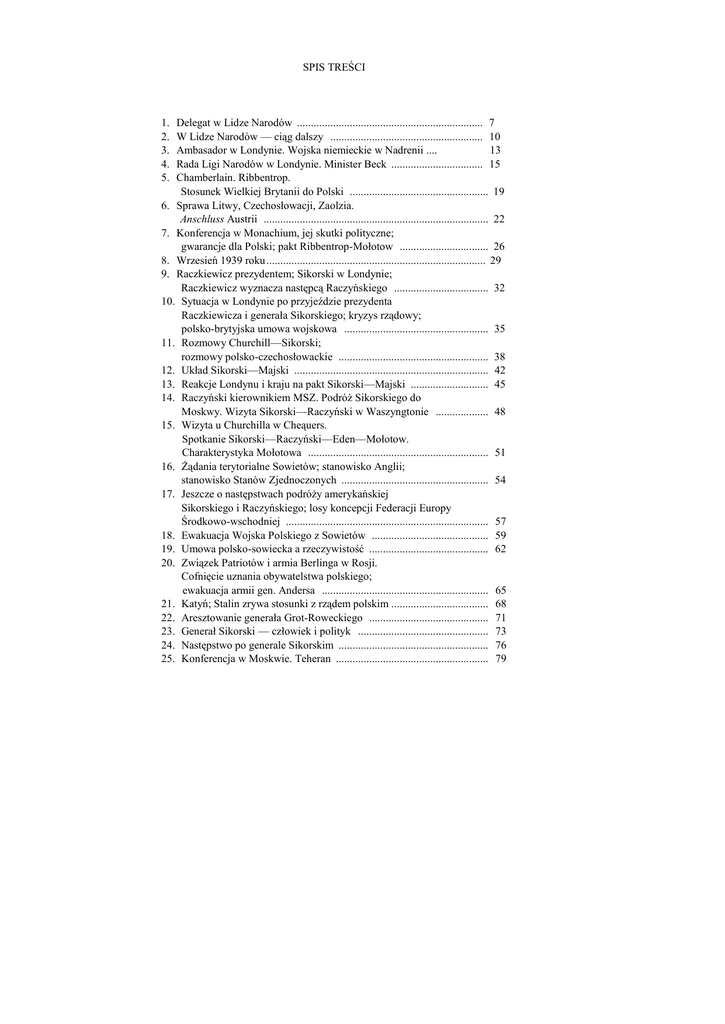 SPIS TREŚCI Delegat w Lidze Narodów ................................................................... 7 W Lidze Narodów — ciąg dalszy ....................................................... 10 Ambasador w Londynie. Wojska niemieckie w Nadrenii .... 13 Rada Ligi Narodów w Londynie. Minister Beck ................................. 15 Chamberlain. Ribbentrop. Stosunek Wielkiej Brytanii do Polski .................................................. 19 6. Sprawa Litwy, Czechosłowacji, Zaolzia. Anschluss Austrii ................................................................................. 22 7. Konferencja w Monachium, jej skutki polityczne; gwarancje dla Polski; pakt Ribbentrop-Mołotow ................................ 26 8. Wrzesień 1939 roku ............................................................................... 29 9. Raczkiewicz prezydentem; Sikorski w Londynie; Raczkiewicz wyznacza następcą Raczyńskiego .................................. 32 10. Sytuacja w Londynie po przyjeździe prezydenta Raczkiewicza i generała Sikorskiego; kryzys rządowy; polsko-brytyjska umowa wojskowa .................................................... 35 11. Rozmowy Churchill—Sikorski; rozmowy polsko-czechosłowackie ...................................................... 38 12. Układ Sikorski—Majski ...................................................................... 42 13. Reakcje Londynu i kraju na pakt Sikorski—Majski ............................ 45 14. Raczyński kierownikiem MSZ. Podróż Sikorskiego do Moskwy. Wizyta Sikorski—Raczyński w Waszyngtonie ................... 48 15. Wizyta u Churchilla w Cheąuers. Spotkanie Sikorski—Raczyński—Eden—Mołotow. Charakterystyka Mołotowa ................................................................. 51 16. Żądania terytorialne Sowietów; stanowisko Anglii; stanowisko Stanów Zjednoczonych ..................................................... 54 17. Jeszcze o następstwach podróży amerykańskiej Sikorskiego i Raczyńskiego; losy koncepcji Federacji Europy Środkowo-wschodniej ......................................................................... 57 18. Ewakuacja Wojska Polskiego z Sowietów .......................................... 59 19. Umowa polsko-sowiecka a rzeczywistość ........................................... 62 20. Związek Patriotów i armia Berlinga w Rosji. Cofnięcie uznania obywatelstwa polskiego; ewakuacja armii gen. Andersa ............................................................ 65 21. Katyń; Stalin zrywa stosunki z rządem polskim ................................... 68 22. Aresztowanie generała Grot-Roweckiego ........................................... 71 23. Generał Sikorski — człowiek i polityk ............................................... 73 24. Następstwo po generale Sikorskim ...................................................... 76 25. Konferencja w Moskwie. Teheran ....................................................... 79 1. 2. 3. 4. 5. 26. Alianci wobec przyszłości Polski ........................................................ 82 27. Mikołajczyk u Roosevelta; Akcja Lebiediewa w Londynie ............................................................ 84 28. Walka AK o Wilno. PKWN w Lublinie. Mikołajczyk w Moskwie ..................................................................... 87 29. Powstanie Warszawskie ...................................................................... 90 30. Październikowa Konferencja w Moskwie. Mikołajczyk—Churchill—Stalin ........................................................ 93 31. Nowy Rząd Polski. Sytuacja polityczna u schyłku 1944 roku ............................................................................ 96 32. Przed Jałtą ........................................................................................... 100 33. Uchwały jałtańskie .............................................................................. 102 34. Polska i angielska reakcja na uchwały jałtańskie ................................. 104 35. Narady Komisji Trzech w Moskwie Uchwały Rady Jedności Narodowej .................................................... 107 36. Porwanie Szesnastu. Śmierć prezydenta Roosevelta ............................ 111 37. Sytuacja polityczna w obozie aliantów bezpośrednio po zakończeniu działań wojennych ........................................................... 115 38. Proces Szesnastu w Moskwie, jego echa oraz konsekwencje w Londynie ........................................................... 118 39. San Francisco i jego skutki ................................................................... 121 40. Cofnięcie uznania rządowi RP. Powstanie emigracji niepodległościowej .............................................................. 123 41. Podsumowanie ...................................................................................... 127 Fotografie ............................................................................................ 131