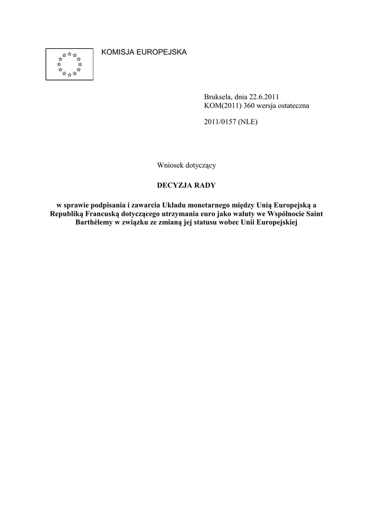 KOMISJA EUROPEJSKA Bruksela, dnia 22.6.2011 KOM(2011) 360 wersja ostateczna 2011/0157 (NLE) Wniosek dotyczący DECYZJA RADY w sprawie podpisania i zawarcia Układu monetarnego między Unią Europejską a Republiką Francuską dotyczącego utrzymania euro jako waluty we Wspólnocie Saint Barthélemy w związku ze zmianą jej statusu wobec Unii Europejskiej UZASADNIENIE Po złożeniu wniosku przez prezydenta Republiki Francuskiej Rada Europejska wyraziła w październiku 2010 r. zgodę na zmianę statusu wyspy Saint-Barthélemy, która jest obecnie regionem najbardziej oddalonym UE, aby z dniem 1 stycznia 2012 r. uzyskała ona status kraju lub terytorium zamorskiego, określony w części czwartej Traktatu o funkcjonowaniu Unii Europejskiej. Republika Francuska poinformowała instytucje Unii o swoim zamiarze utrzymania euro jako waluty we Wspólnocie Saint-Barthélemy, mimo że nie będzie ona już dłużej częścią terytorium Unii Europejskiej. W swojej decyzji z dnia 13 kwietnia 2011 r. Rada upoważniła Komisję do negocjowania, wspólnie z Europejskim Bankiem Centralnym, układu monetarnego z Republiką Francuską działającą w imieniu francuskiej zbiorowości zamorskiej Saint-Barthélemy. Projekt układu załączony do tej decyzji został wynegocjowany przez poszczególne strony i parafowany dnia 30 maja 2011 r. Zgodnie z art. 4 upoważnienia wzywa się Radę do przyjęcia decyzji w sprawie podpisania i zawarcia układu. PL 2 PL 2011/0157 (NLE) Wniosek dotyczący DECYZJA RADY w sprawie podpisania i zawarcia Układu monetarnego między Unią Europejską a Republiką Francuską dotyczącego utrzymania euro jako waluty we Wspólnocie Saint Barthélemy w związku ze zmianą jej statusu wobec Unii Europejskiej RADA UNII EUROPEJSKIEJ, uwzględniając Traktat o funkcjonowaniu Unii Europejskiej, w szczególności jego art. 219 ust. 3, uwzględniając decyzję Rady w sprawie ustaleń dotyczących negocjowania układu monetarnego z Republiką Francuską działającą w imieniu francuskiej zbiorowości zamorskiej Saint-Barthélemy1, w szczególności jej art. 4, uwzględniając wniosek Komisji Europejskiej, a także mając na uwadze, co następuje: (1) W decyzji 2010/718/UE Rady Europejskiej z dnia 29 października 2010 r. w sprawie zmiany wobec Unii Europejskiej statusu wyspy Saint-Barthélemy2 przewidziano, że z dniem 1 stycznia 2012 r. wyspa Saint-Barthélemy przestaje być regionem najbardziej oddalonym Unii i otrzymuje od tego dnia status kraju lub terytorium zamorskiego, określony w części czwartej Traktatu o funkcjonowaniu Unii Europejskiej. Republika Francuska zobowiązała się zawrzeć umowy, które są niezbędne do tego, by zmiana statusu przebiegła bez uszczerbku dla interesów Unii. (2) Republika Francuska poinformowała instytucje Unii o swoim zamiarze utrzymania euro jako jedynej waluty we Wspólnocie Saint-Barthélemy. Należy zatem zawrzeć układ monetarny. (3) Dnia 13 kwietnia 2011 r. Rada upoważniła Komisję, działającą wspólnie z Europejskim Bankiem Centralnym i za jego zgodą w sprawach należących do jego zakresu kompetencji, do podjęcia negocjacji z Republiką Francuską, działającą w imieniu francuskiej zbiorowości zamorskiej Saint-Barthélemy, w celu zawarcia układu monetarnego. Układ taki został parafowany dnia 30 maja 2011 r. (4) Układ ten należy podpisać i zawrzeć, 1 Decyzja przyjęta dnia 13 kwietnia 2011 r. Dz.U. L 325 z 9.12.2010, s. 4. 2 PL 3 PL PRZYJMUJE NINIEJSZĄ DECYZJĘ: Artykuł 1 1. Niniejszym zatwierdza się w imieniu Unii podpisanie Układu monetarnego między Unią Europejską a Republiką Francuską dotyczącego utrzymania euro jako waluty we Wspólnocie Saint-Barthélemy w związku ze zmianą jej statusu wobec Unii Europejskiej (zwanego dalej „układem”), z zastrzeżeniem jego zawarcia. 2. Tekst układu jest dołączony do niniejszej decyzji. 3. Przewodniczący Rady zostaje upoważniony do wyznaczenia osoby umocowanej lub osób umocowanych do podpisania układu w imieniu Unii, z zastrzeżeniem jego zawarcia. Artykuł 2 1. Niniejszym zatwierdza się układ w imieniu Unii. 2. Przewodniczący Rady zostaje upoważniony do wyznaczenia osoby umocowanej do dokonania, w imieniu Unii, powiadomienia, o którym mowa w art. 11 układu. Artykuł 3 Niniejsza decyzja wchodzi w życie z dniem jej przyjęcia. Sporządzono w Brukseli dnia […] r. W imieniu Rady Przewodniczący PL 4 PL ZAŁĄCZNIK UKŁAD MONETARNY między Unią Europejską a Republiką Francuską dotyczący utrzymania euro jako waluty we Wspólnocie Saint-Barthélemy w związku ze zmianą jej statusu wobec Unii Europejskiej UNIA EUROPEJSKA, reprezentowana przez Komisję Europejską, oraz REPUBLIKA FRANCUSKA, działająca w imieniu wyspy Saint-Barthélemy, mając na uwadze, co następuje: (1) Wspólnota Saint-Barthélemy stanowi integralną część Republiki Francuskiej, lecz z dniem 1 stycznia 2012 r. przestanie być częścią Unii Europejskiej, zgodnie z decyzją 2010/718/UE Rady Europejskiej z dnia 29 października 2010 r. w sprawie zmiany wobec Unii Europejskiej statusu wyspy Saint-Barthélemy. (2) Republika Francuska pragnie, aby Wspólnota Saint-Barthélemy zachowała tę samą walutę co Francja kontynentalna, i zamierza w tym celu w dalszym ciągu przyznawać status prawnego środka płatniczego na terytorium Wspólnoty Saint-Barthélemy wyłącznie banknotom i monetom euro wyemitowanym przez Eurosystem i państwa członkowskie, które przyjęły euro. (3) Należy zapewnić ciągłość stosowania w odniesieniu do Wspólnoty Saint-Barthélemy przepisów obecnego i przyszłego prawa Unii Europejskiej niezbędnych do funkcjonowania unii gospodarczej i walutowej, aby w szczególności zapewnić jednolitą politykę pieniężną Eurosystemu, stworzyć równe szanse dla instytucji finansowych usytuowanych w strefie euro oraz zapobiegać oszustwom, fałszowaniu gotówkowych i bezgotówkowych środków płatniczych i praniu pieniędzy. (4) Niniejszy układ monetarny z