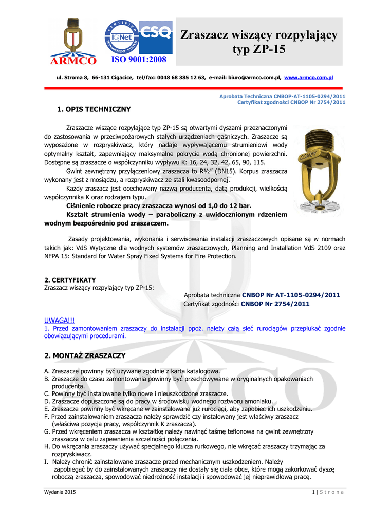 Karta katalogowa Zraszacz wiszący rozpylający ZP-15