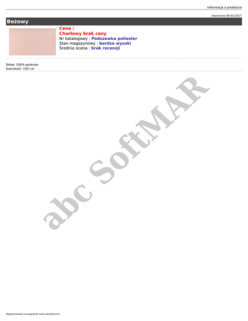 Informacje o produkcie Utworzono 06-03-2017 Beżowy Cena : Chwilowy brak ceny Nr katalogowy : Podszewka poliester Stan magazynowy : bardzo wysoki Średnia ocena : brak recenzji ab c So ft M AR Skład: 100% poliester Szerokość: 150 cm Wygenerowano w programie www.oscGold.com